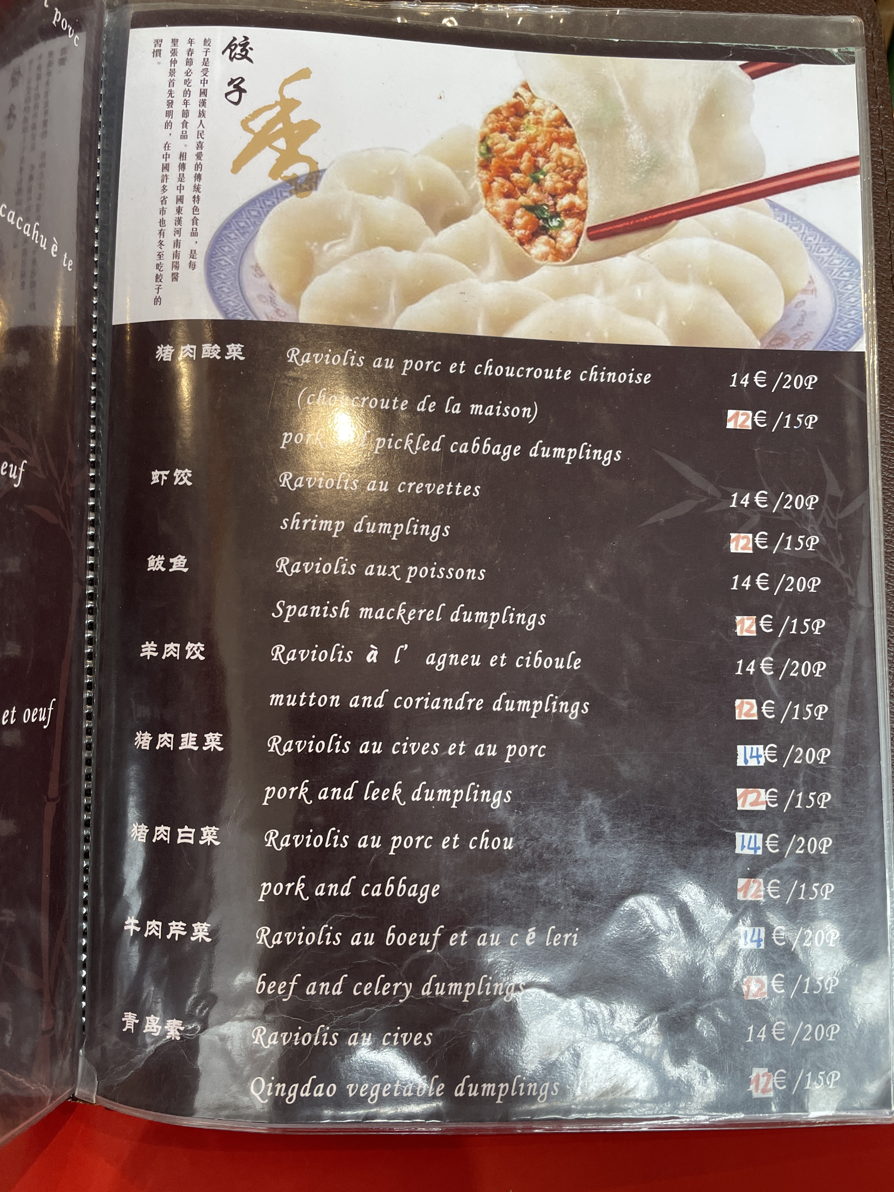 Aujourd’hui, nous appelons le restaurant pour commander à emporter 15 pièces de raviolis porc choux et 15 pièces de raviolis légumes, soit un total de 16€ (car le prix indiqué sur la page Google est de 8€/15 pièces). Arrivés sur place, les employés ont du mal à communiquer avec nous (barrière de la langue), on comprend alors que le total est de 24€ (soit 12€/15 pièces!) Après d’autres tentatives de communication, une employé nous fait comprendre que le restaurant n’accepte que les paiements par espèces (non indiqué!). Heureusement que mon ami avait suffisamment de monnaie pour payer pour nous deux. Tout ce processus aurait pu être acceptable si la dégustation avait été bonne. Mais au lieu de recevoir des raviolis aux légumes, mon ami a eu des raviolis aux cives! Ces derniers contenaient de l’omelette (indiqué nulle part une fois encore), heureusement que mon ami n’y était pas allergique… A part ça, les raviolis sont faits maison