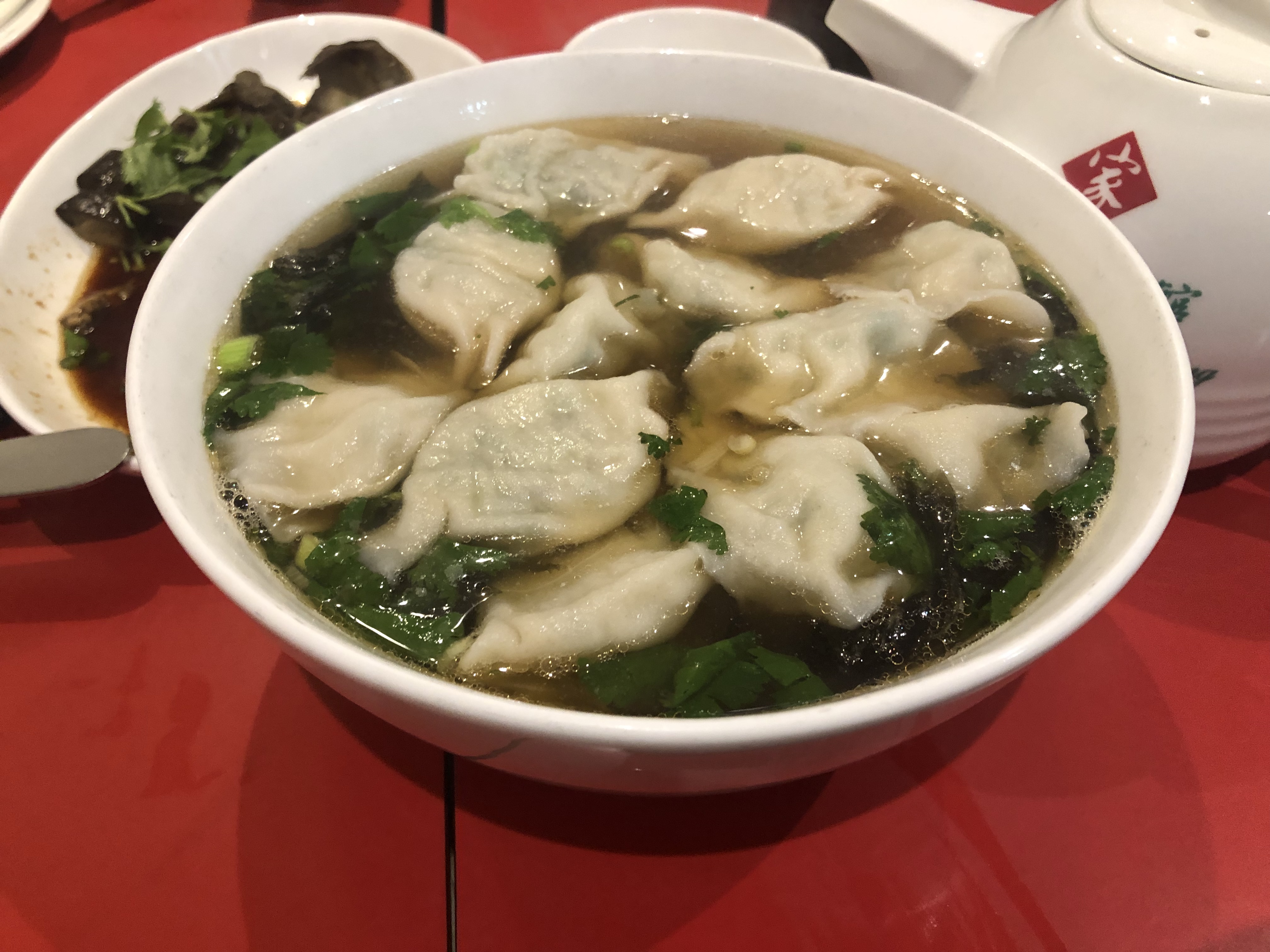 J'ai dégusté 2 assiettes de leurs délicieux jiaozi pour le déjeuner ! Les crevettes, le porc et le chou étaient super. 18 euros au total, c'est un peu cher pour un déjeuner, mais ça vaut le coup si vous aimez les jiaozi comme moi ! N'oubliez pas d'utiliser la petite assiette qu'ils vous donnent pour mélanger la sauce soja, le vinaigre et la pâte réfrigérée pour obtenir une belle petite trempette.