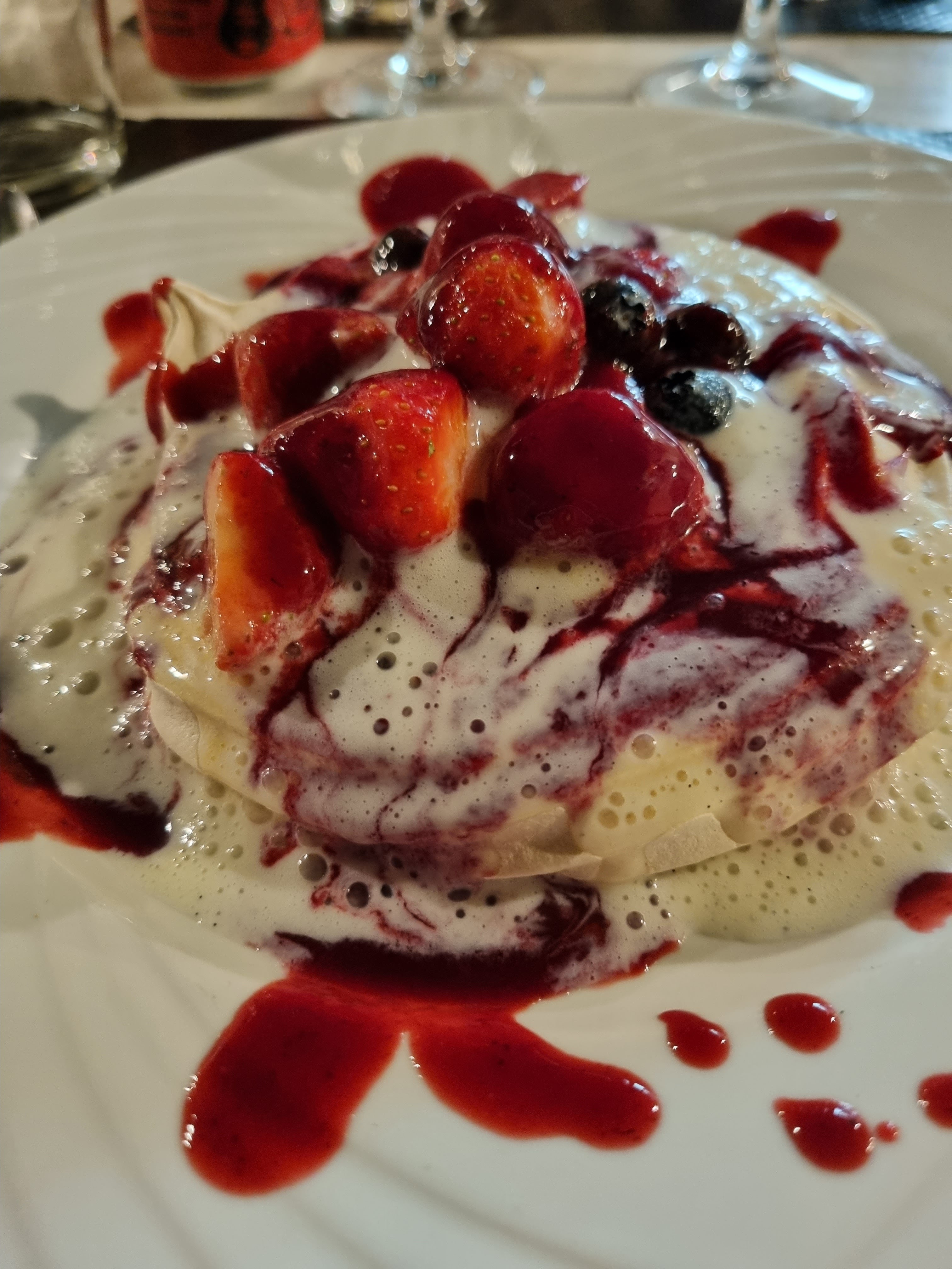 Première fois ici, bel endroit juste au bord du canal. J'ai commandé une entrée de langoustine enveloppée dans du saumon, alors je m'attendais à une sorte de chose ressemblant à une crevette enveloppée dans du saumon fumé. Déçu car cela ressemblait plus à un pâté de saumon avec une très petite quantité de langoustine. Mon partenaire a commandé du foie gras et des pains sucrés, c'était délicieux. Les plats étaient tous deux exceptionnels. J'ai de la lotte enveloppée dans du jambon palmer avec des légumes parfaitement cuits. Le partenaire avait un trio de porc, de porc effiloché, de joues de porc et de poitrine de porc. Wow ? la nourriture était très bonne. Prévu dans le désert mais il ne reste plus de place. Je le recommanderais à coup sûr.