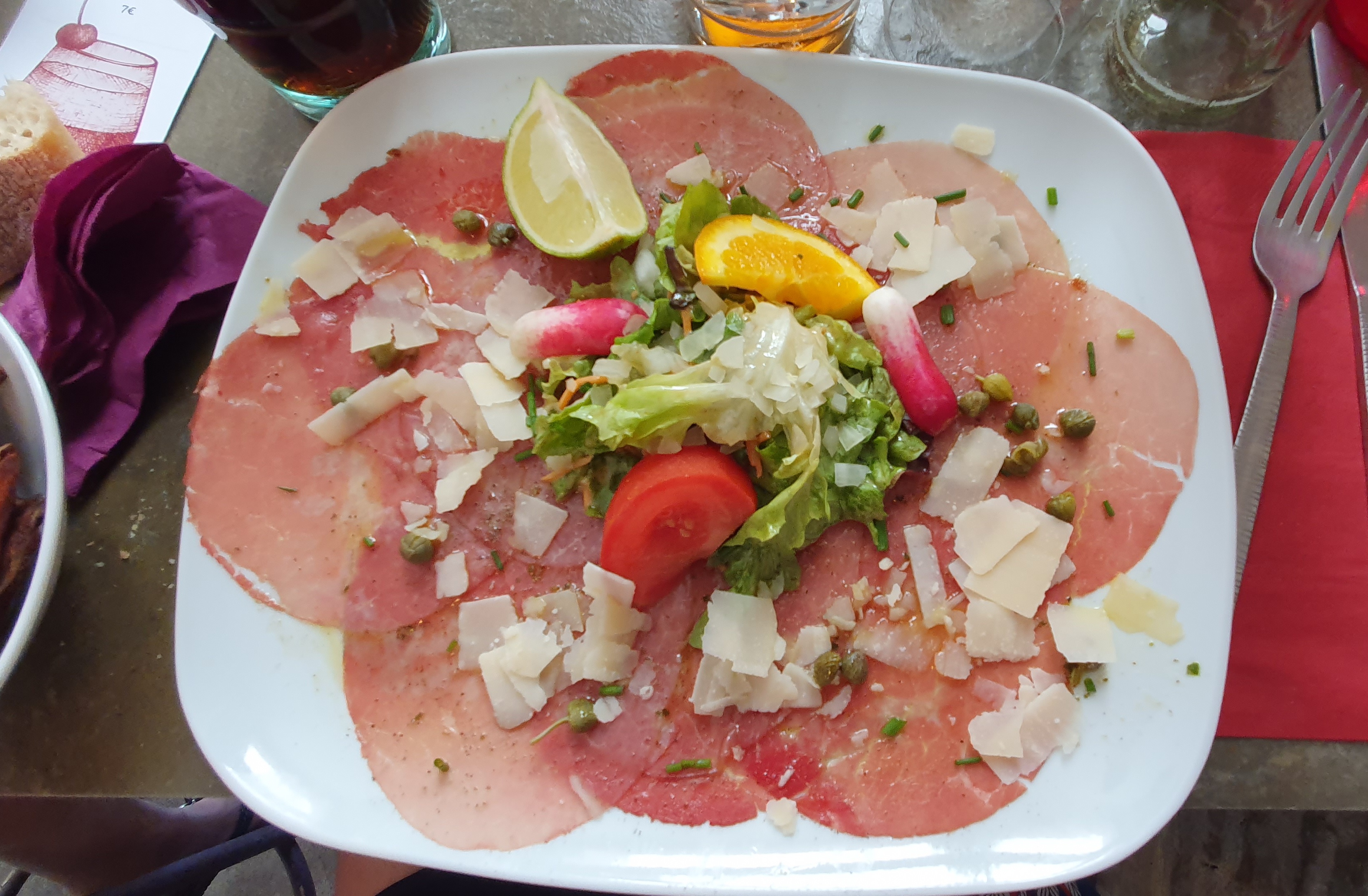 Un carpaccio sorti du congélateur dommage j’ai le même à la maison. Une salade cesar avec des tomates dont le pédicule n’a pas été retiré des tranches de concombre irrégulières avec la peau. Bref pas toujours du fait maison même avec le dessert . Les portions trop régulières sur le dessert chocolat. Pour autant un service avec le sourire et un lieu propre. Un moment sympathique en famille