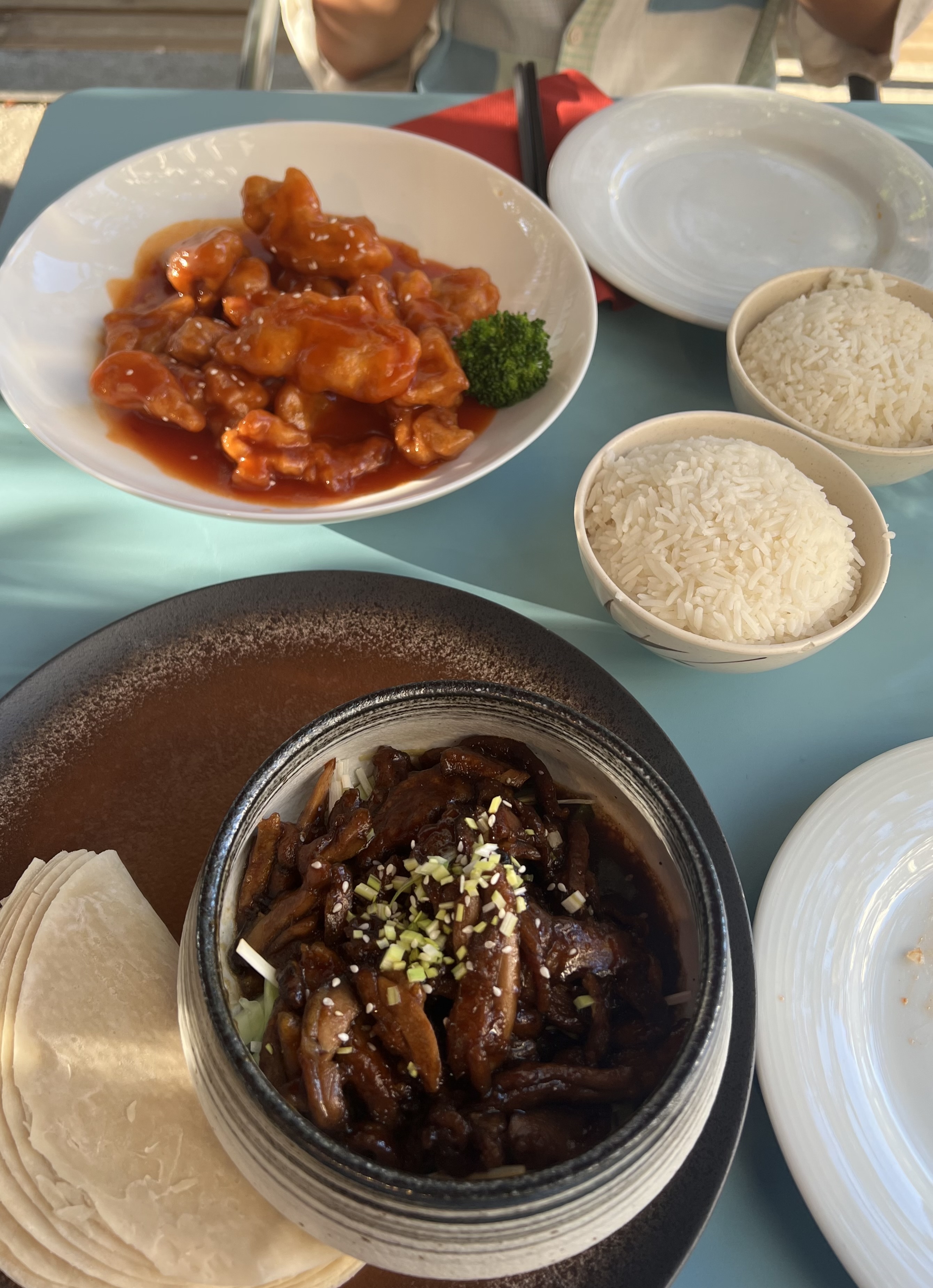 Délicieux. On a pris des plats à partager : canard laqué avec des fines crêpes de blé, des ravioles avec une délicieuse sauce au vinaigre, salade aux épinards, 2 bols de riz pour 4 et des aubergines. En dessert : cafés gourmands et ananas, kiwis et boules coco. Le dessert était en trop.