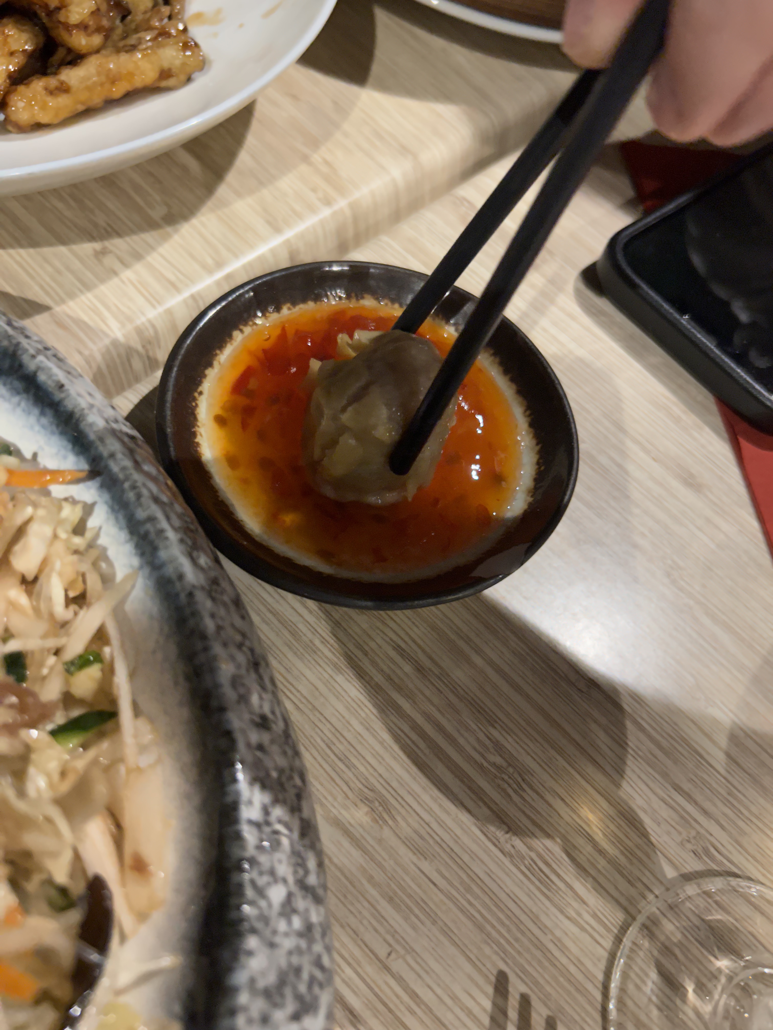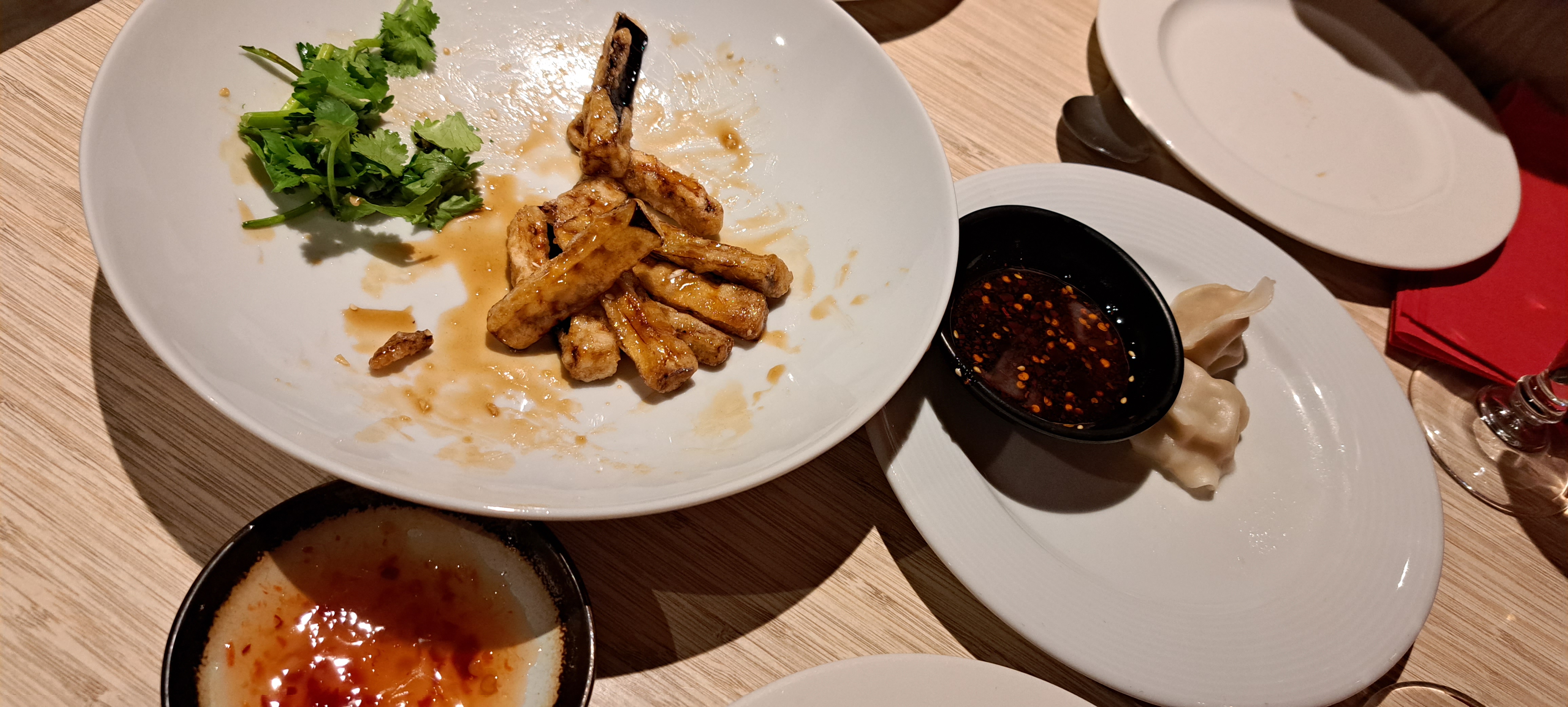 Nous avons goûté sur recommandation de notre accueillante et charmante serveuse les raviolis vapeur, émincé de poulet caramélisé et aubergines frites Tout était vraiment très bon, peut être un peu gras pour l’été les aubergines, mais en tout cas expérience à reproduire ! Et je vous recommande chaudement !