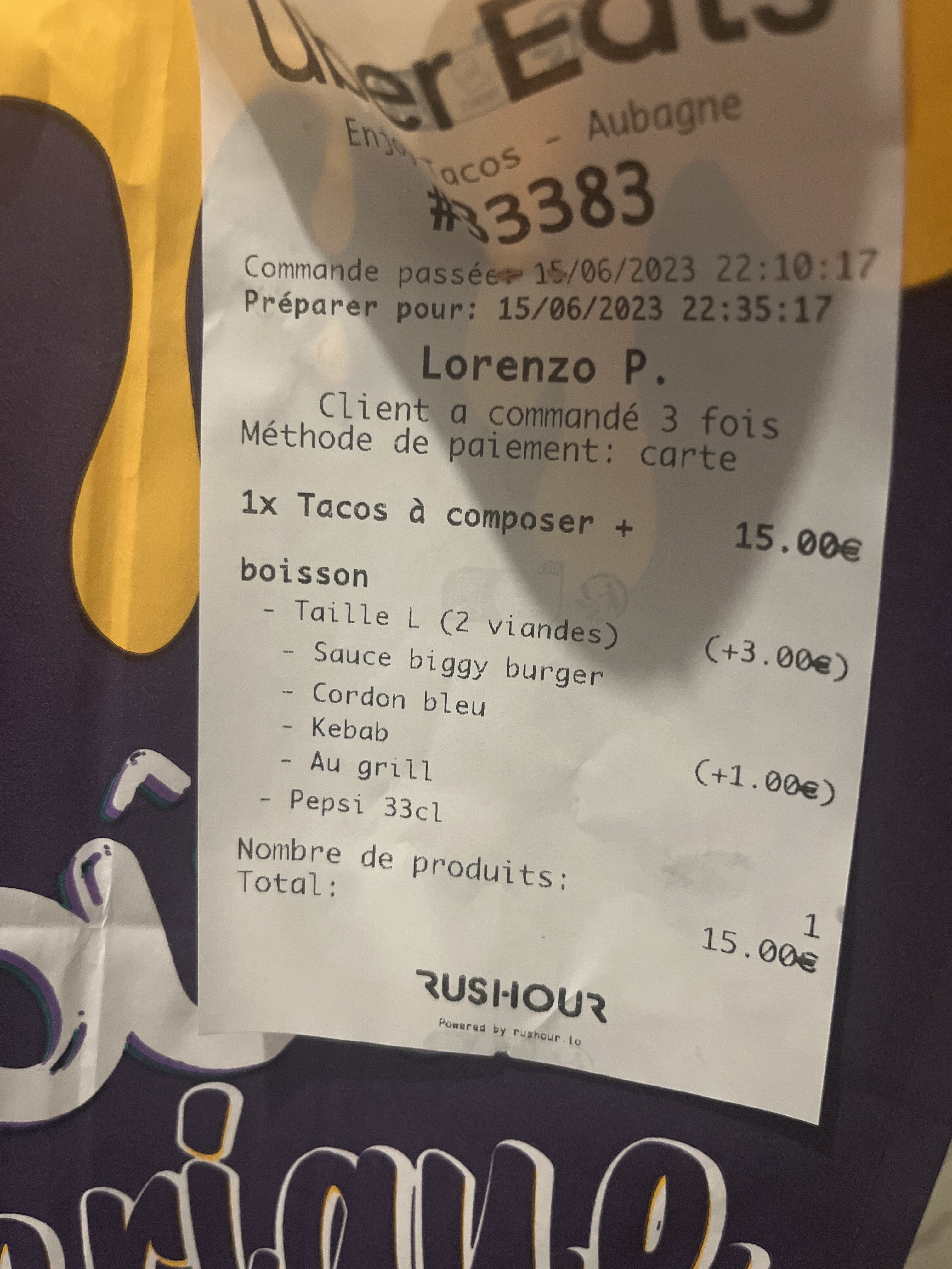 Franchement très décevant ! Je commande pour la 3eme fois ! Il y a toujours un problème !! La première fois c’était en physique et c’était le 2eme jours donc j’ai étais tolérant j’ai rien dit ( il avais un problème pour recevoir les bons en cuisine j’ai attendu 35 minutes pour 2 tacos lol ) La 2eme fois sur UBER Eats pas de boissons ni de dessert…. Et la la 3eme fois encore sur UBER eat ! Pas de boisson et pas de frites !!! On paie 47€10 on a même pas notre commande au complet désolé mais là j’étais obligé !!