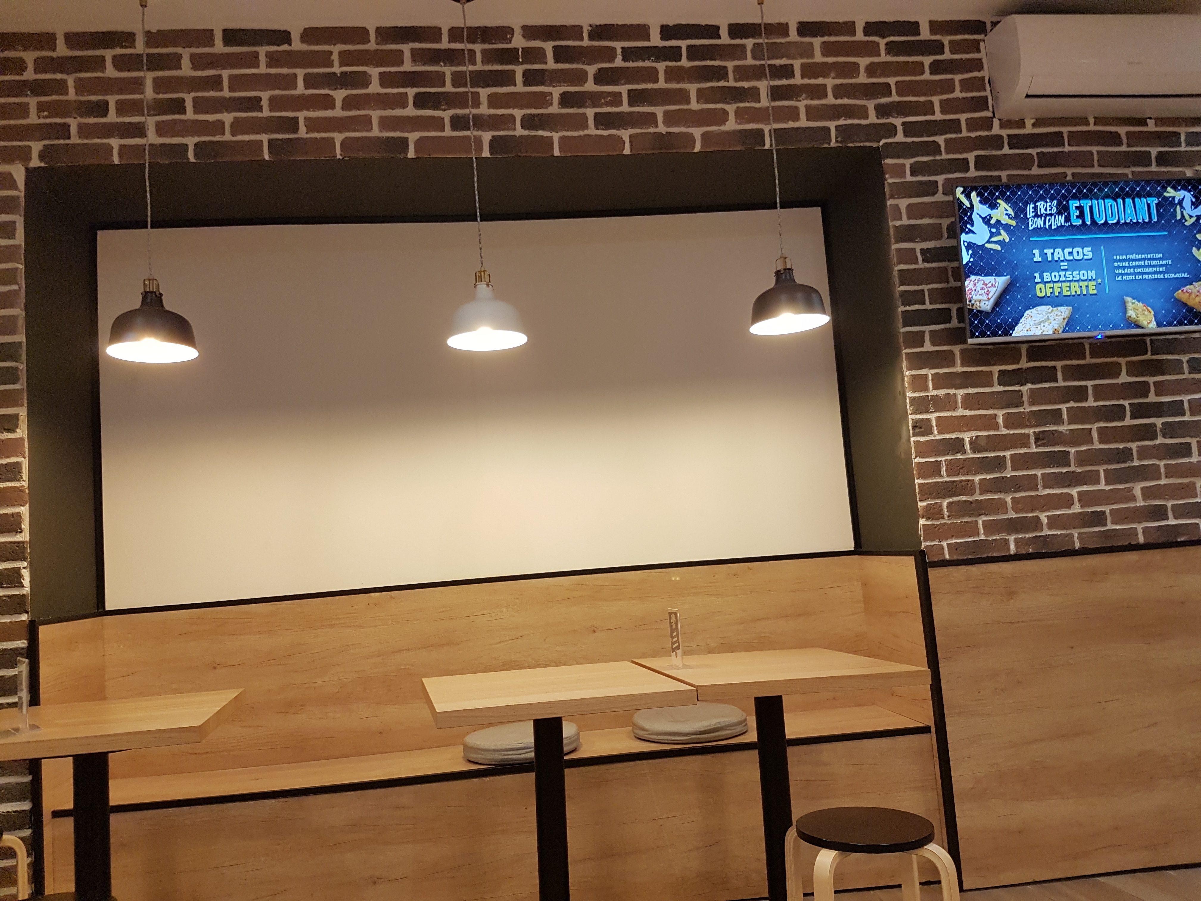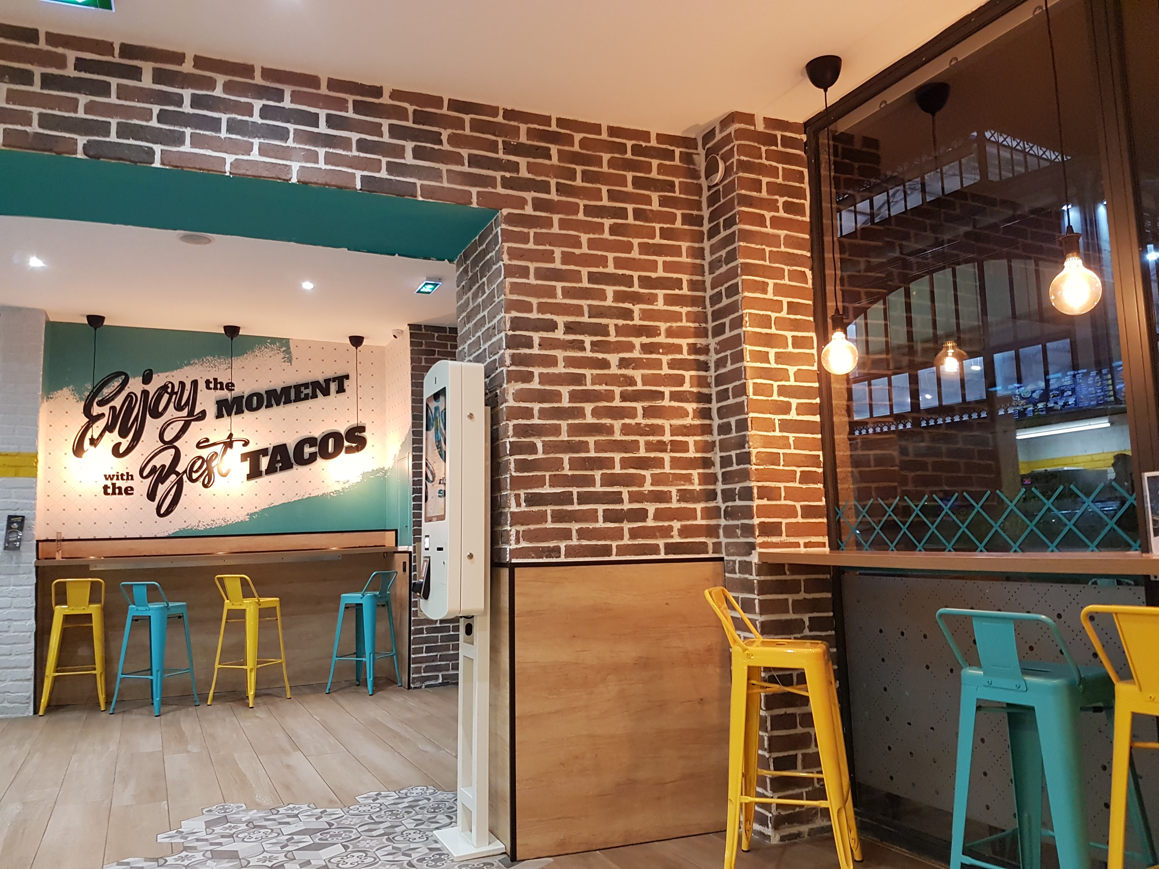 Première fois dans ce lieu, commande sur tableau numérique. Beaucoup de choix. Équipe qui s active pour satisfaire les clients. Petit bémol les fauteuils devraient être recouverts (l usure ne fait pas trop envie de s y asseoir malgré qu ils aient l air confortables). Niveau goût ma fille a apprécié son tacos et j avoue que les frites sentaient super bon. A réessayer prochainement.