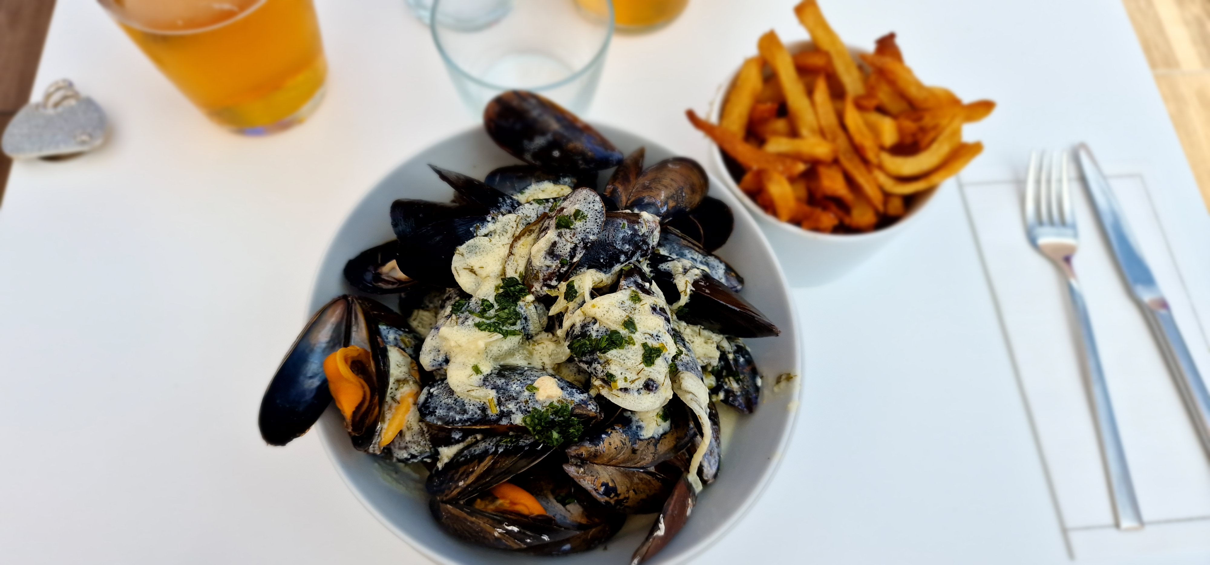 Première visite hier mardi soir et sûrement pas la dernière ! Tout était délicieux ! Il n'y avait plus de moules frites car c'est la première saison du restaurant et ils ne connaissent pas encore l'affluence, nous étions un peu déçus. Mais nous nous sommes régalés avec les huîtres, fraîches et excellentes, leur terrine de la mer maison delicieuse, les frites maison goûteuses, l'exquise gaufre au beurre salé et au chocolat, le fondant lui aussi au chocolat avec sa chantilly. Le vin blanc était parfait ! Même le pain !!! Aussi le cadre est très plaisant, belle décoration, spacieux, on s'y sent bien. Ce que je retiens surtout c'est le service de qualité, avec le sourire, c'était parfait ! Pour toutes ces raisons, nous revenons demain midi, jeudi pour les moules frites !!! Allez-y, vraiment, la terrasse extérieure est en plus bien agréable. Bref, je souhaite à toute l'équipe une bonne saison et surtout de longues années d'existence pour enchanter nos palais à prix en plus très très raisonnable. Magali