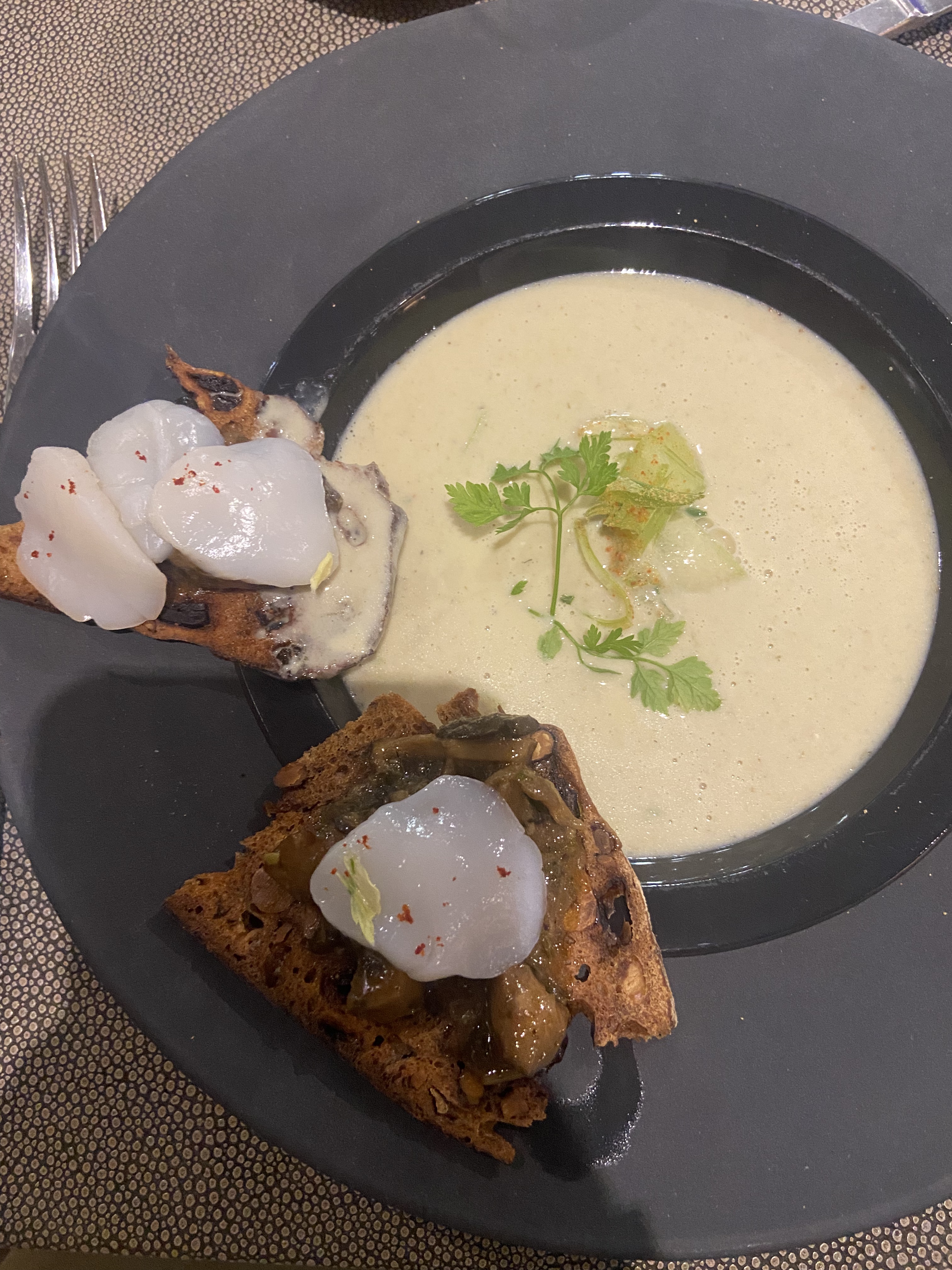 Nous nous sommes régalés. Soupe de moules extra. Jolie petite attention pour mes 50 ans 👍👍👍