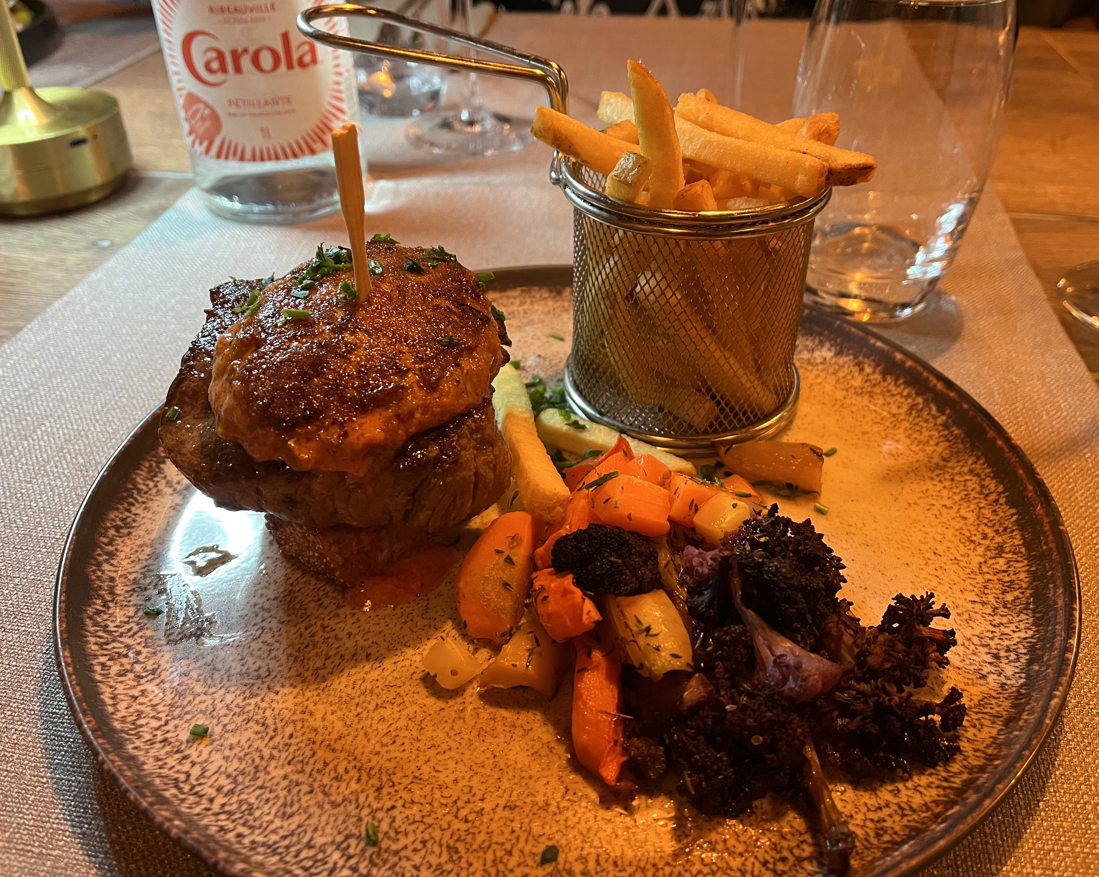 Cadre très agréable. Apéritif comme le mojito à la pastèque......une tuerie!!! Au menu filet de bœuf avec des légumes sautés et épicés, parfait! Et alors les frites....tellement croustillantes!! Les portions dans l'assiette sont très généreuses! Le personnel est super gentil, accueillant et souriant! On va vite revenir....on attend l'ouverture du Caveau😉😉! Ne changez surtout RIEN!!