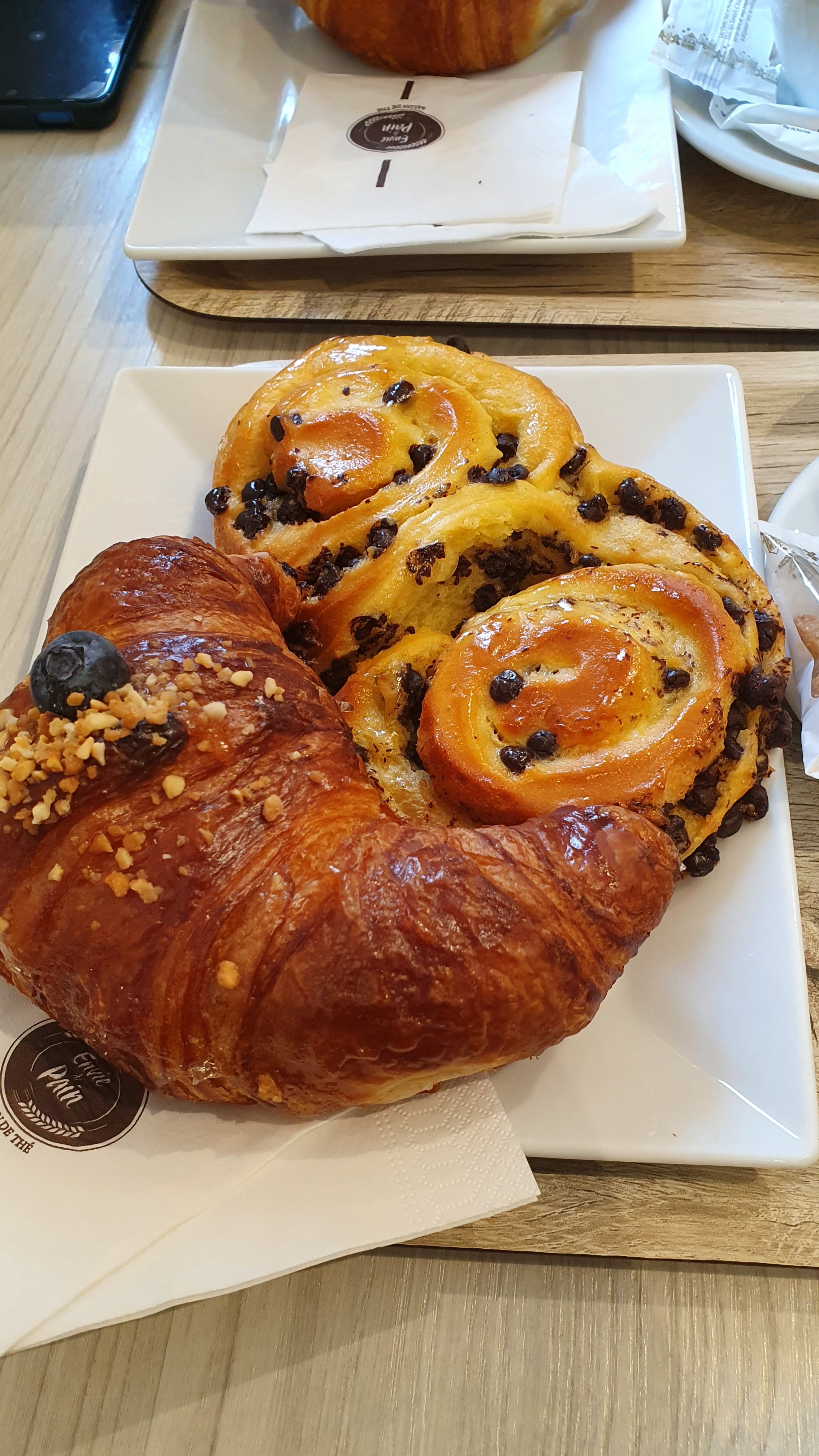 Excellent and what a surprising variety of croissants! Pains au chocolat à la pistache, croissant at la rhubarbe... surprenants et délicieux, dégustés dans un salle accueillante.
