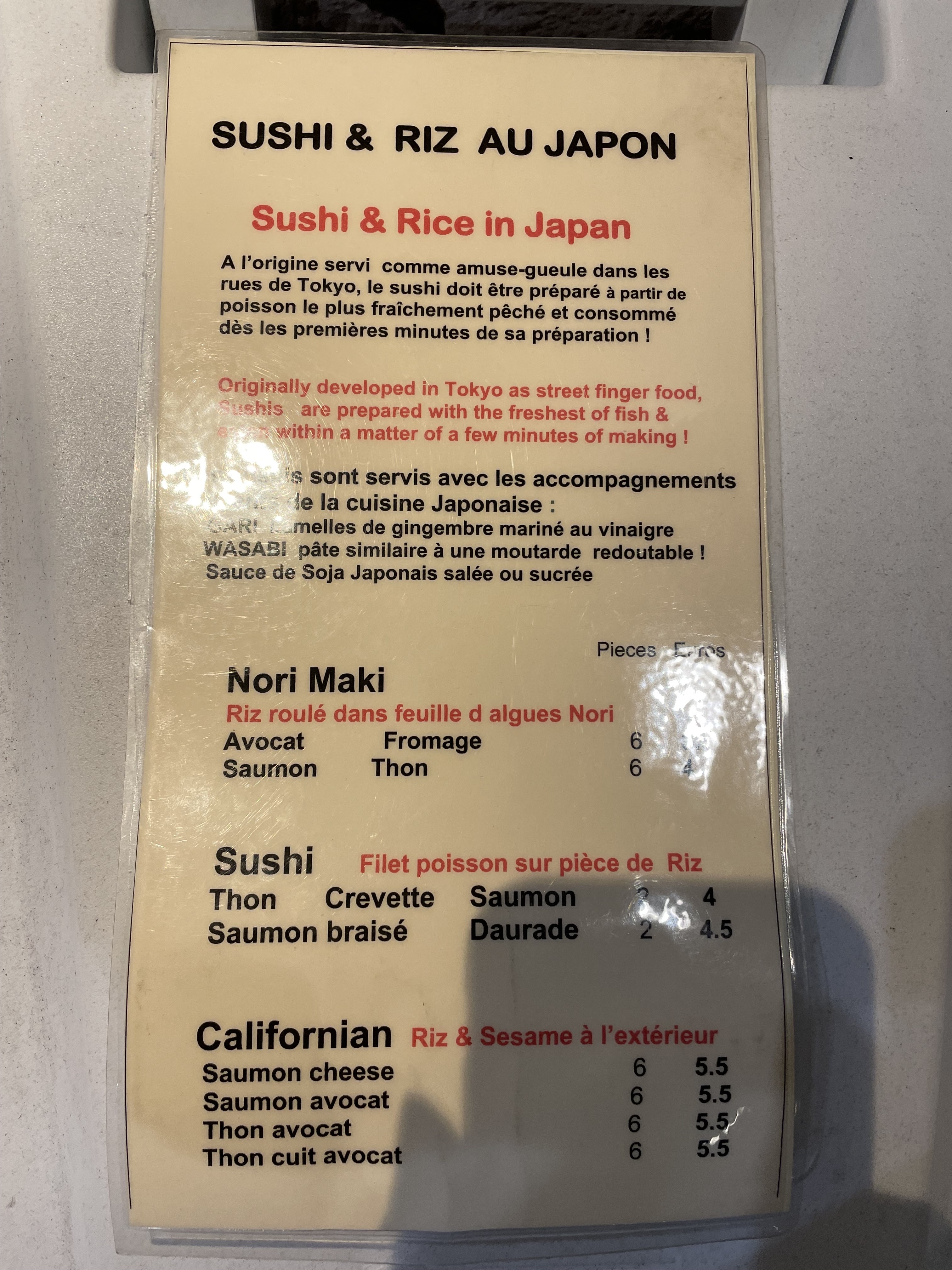 Sushis délicieux prix beaucoup plus abordables que dans certains autres sushis shop. Le monsieur de l’accueil était gentil et souriant !!!! Je recommande fortement.
