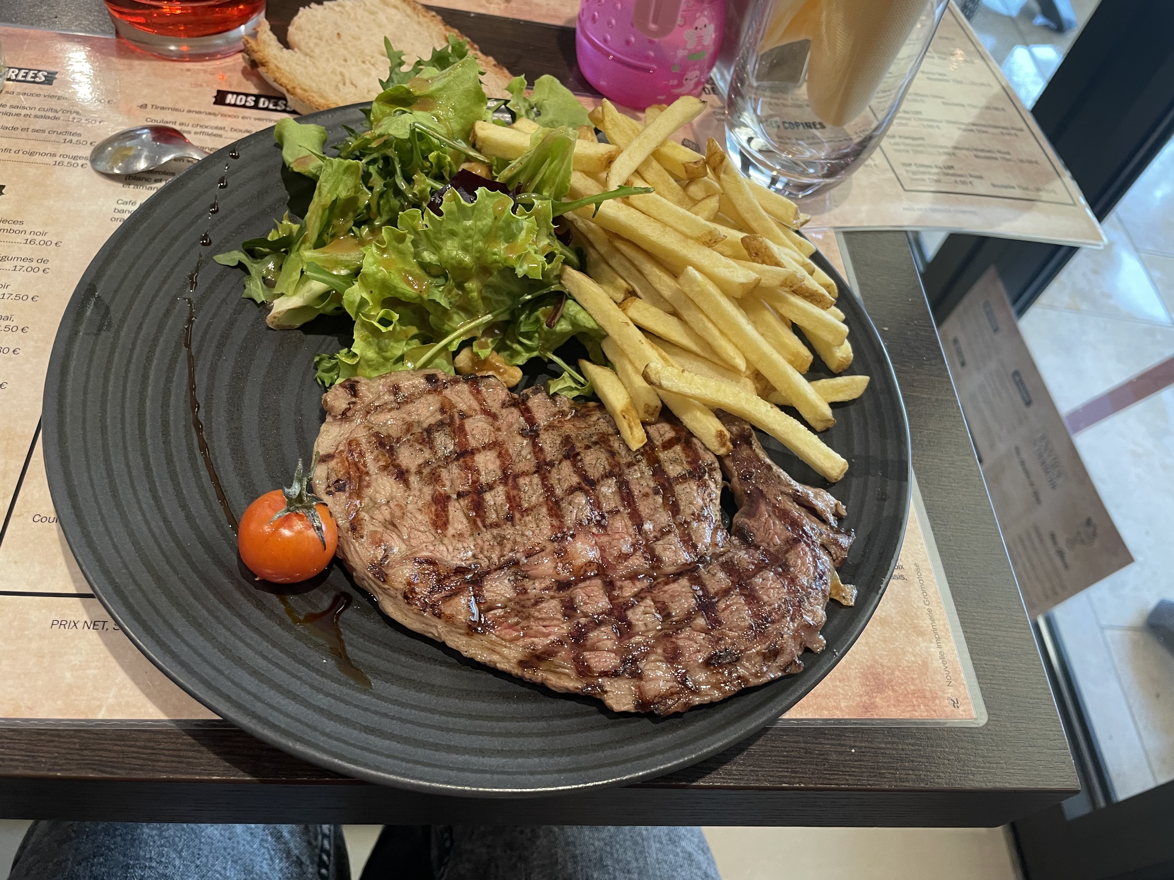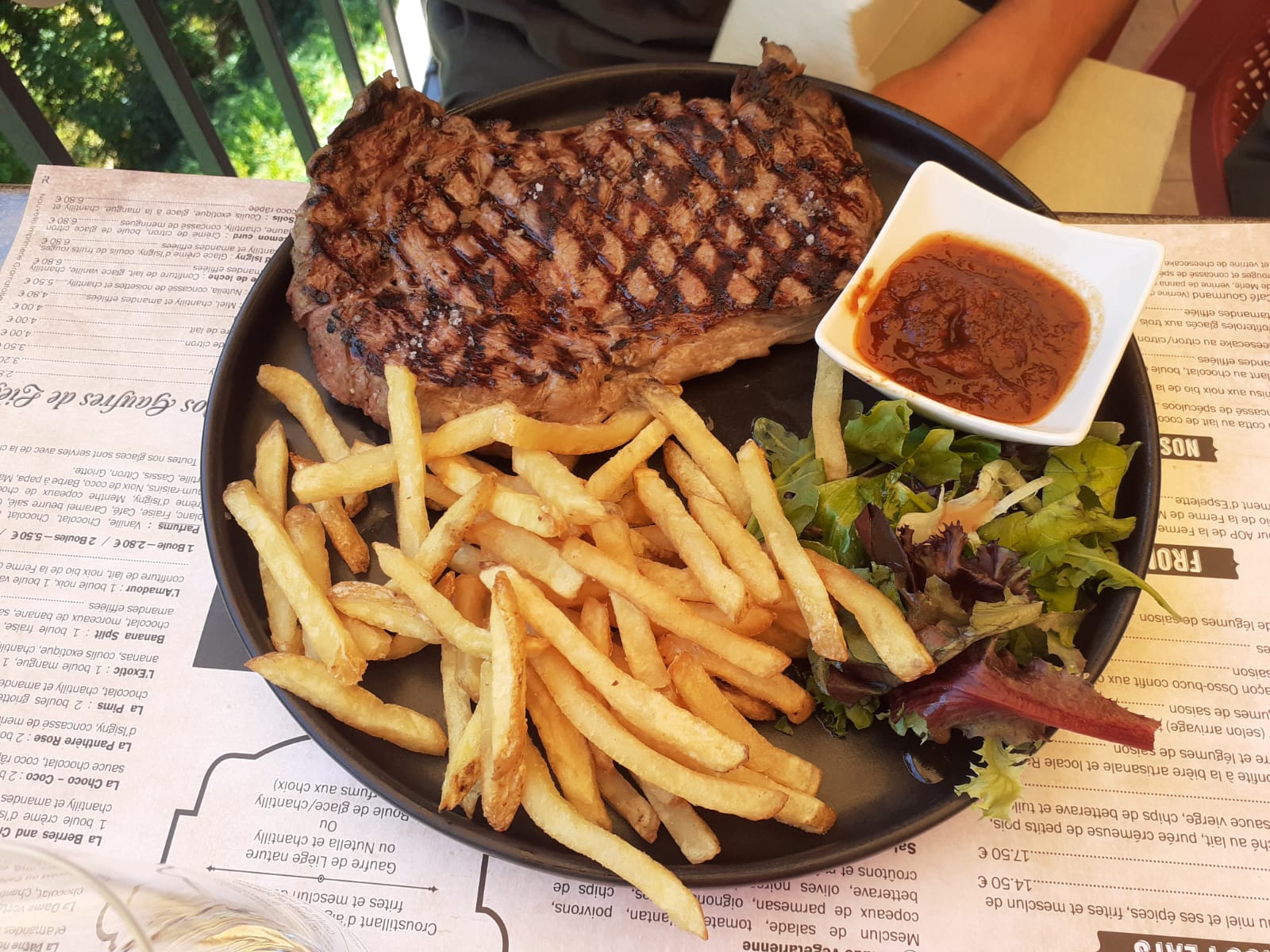Nous n'avons pas aimé. Frites congelées, salade en sachet, 1tomate cerise écrasée (pour 2 salades!)entrecôte trop cuite. Servi sans pain, sans sel/poivre, sans couteau à steak. On s'est vite sauvé pour aller prendre un dessert ailleurs. C'est pour moi le parfait piège à touristes.