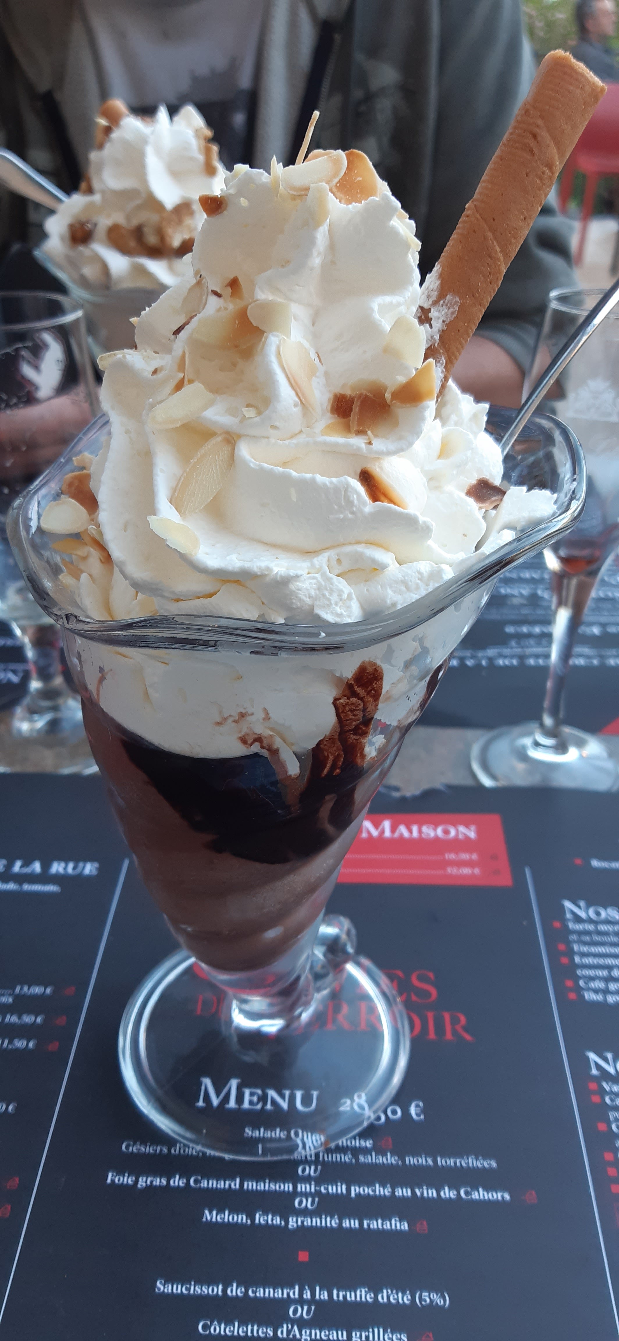 Nous étions à la recherche, à 17h, de crêpes sucrées dans Rocamadour. Et bien quelle aventure ! Après s'être fait virer du resto d'en face qui ne servait plus, et ce malgré de nombreux panneaux non stop (logique...), nous entrons dans ce restaurant en posant la question fatidique : est-il possible de manger des crêpes sucrées ? Forts d'un oui affirmé, nous nous installons sur la très sympathique terrasse panoramique. Une autre serveuse (la patronne ?) arrive de suite et nous demandons donc nos fameuses crêpes, ce a quoi on nous répond ah non ce n'est pas possible, pour manger il faut attendre 19h avec un air pas très sympathique. Outch, on venait tout juste de nous dire que c'était possible ! Manque de coordination ? Technique pour ameuter le client ? Dans tous les cas, pas de crêpes pour nous apparemment... il aurait été bien d'être franc dès le départ, on était pas à un revers près. Bref, je décide de me rabattre sur une coupe glacée tandis que ma copine prend simplement une boisson. La coupe était très standard, rien de mauvais / rien de top, notons toutefois une sauce chocolat made in grande surface. A 8€ la coupe, on peut s'attendre à du plus quali...