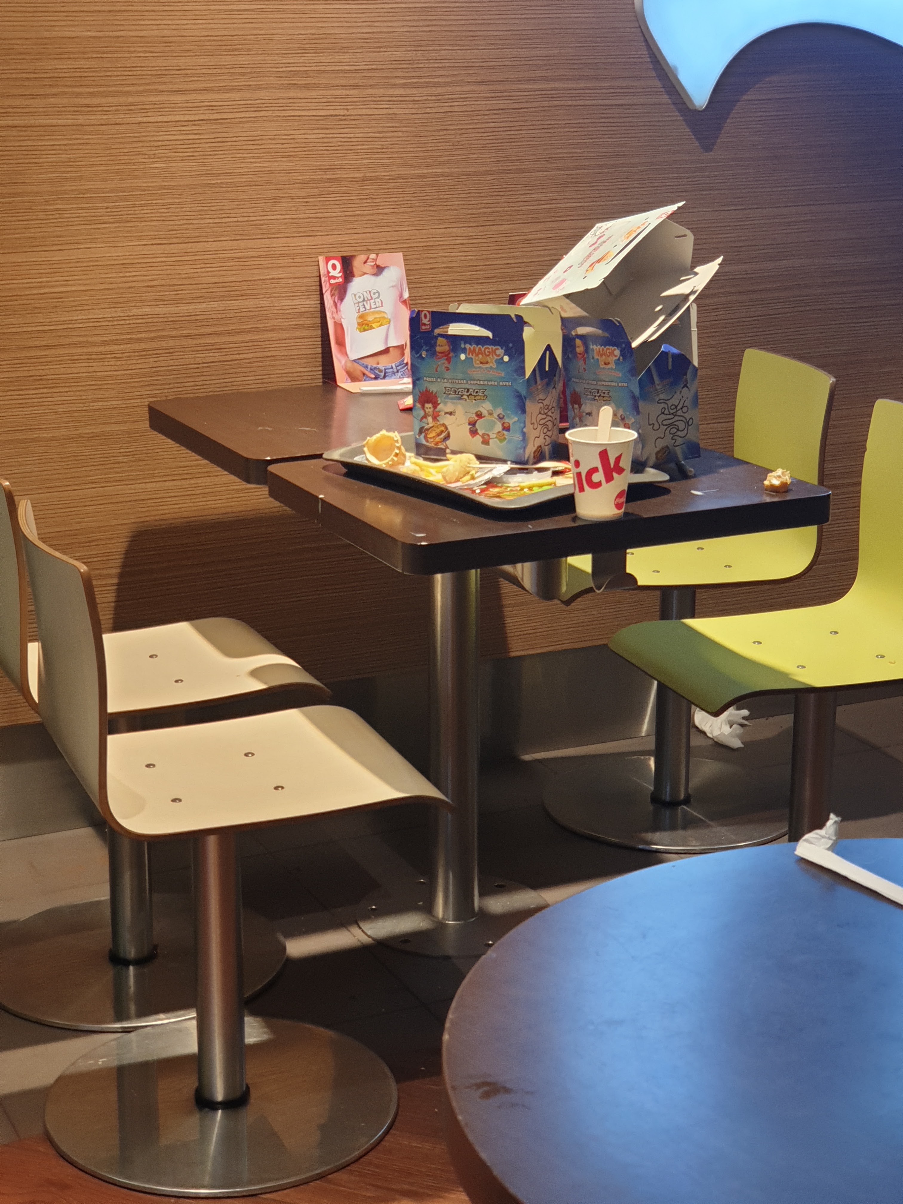table sale .sol couvert de frites a croire que l hygiène n'est plus la priorité dans la restauration.