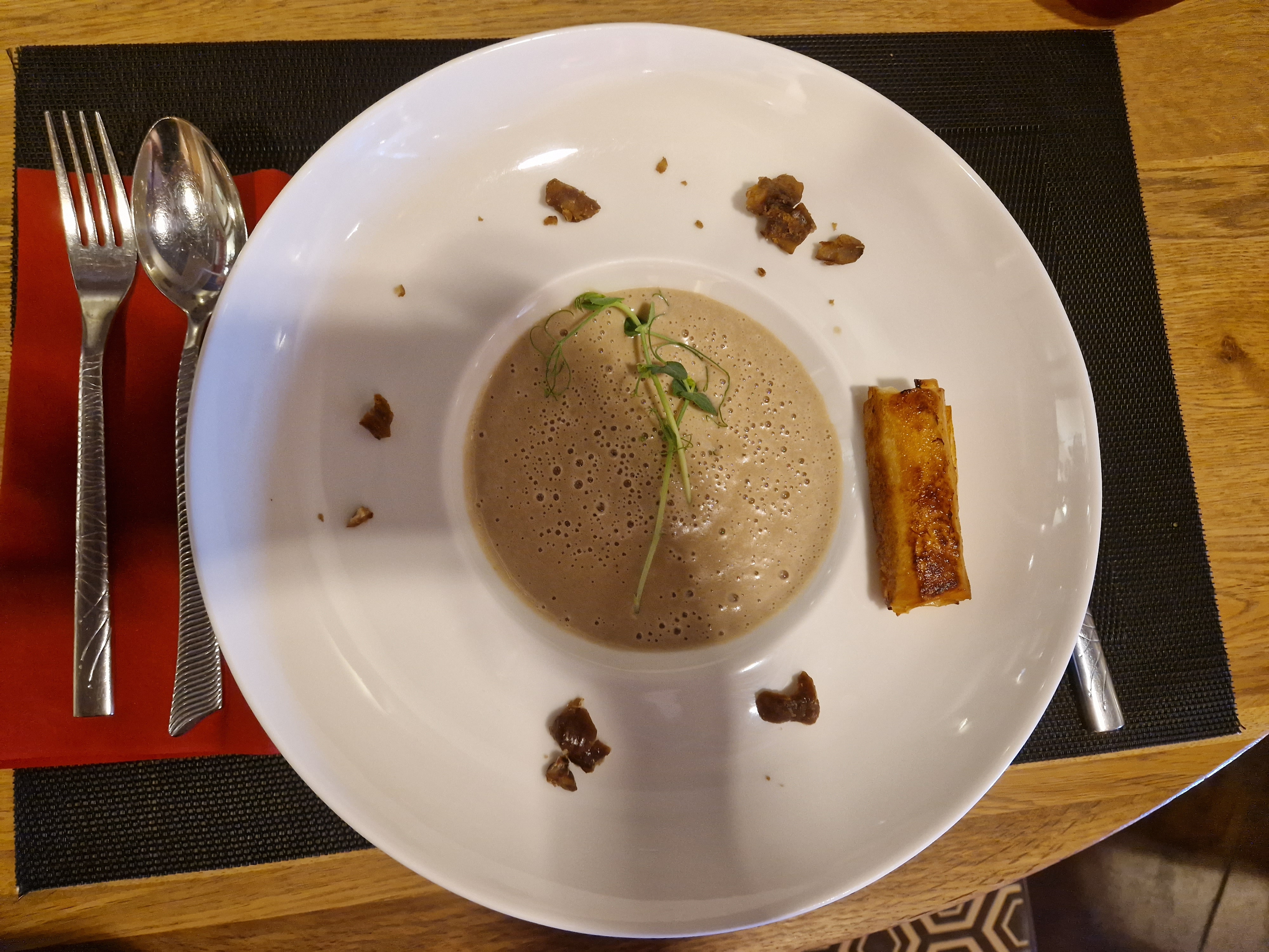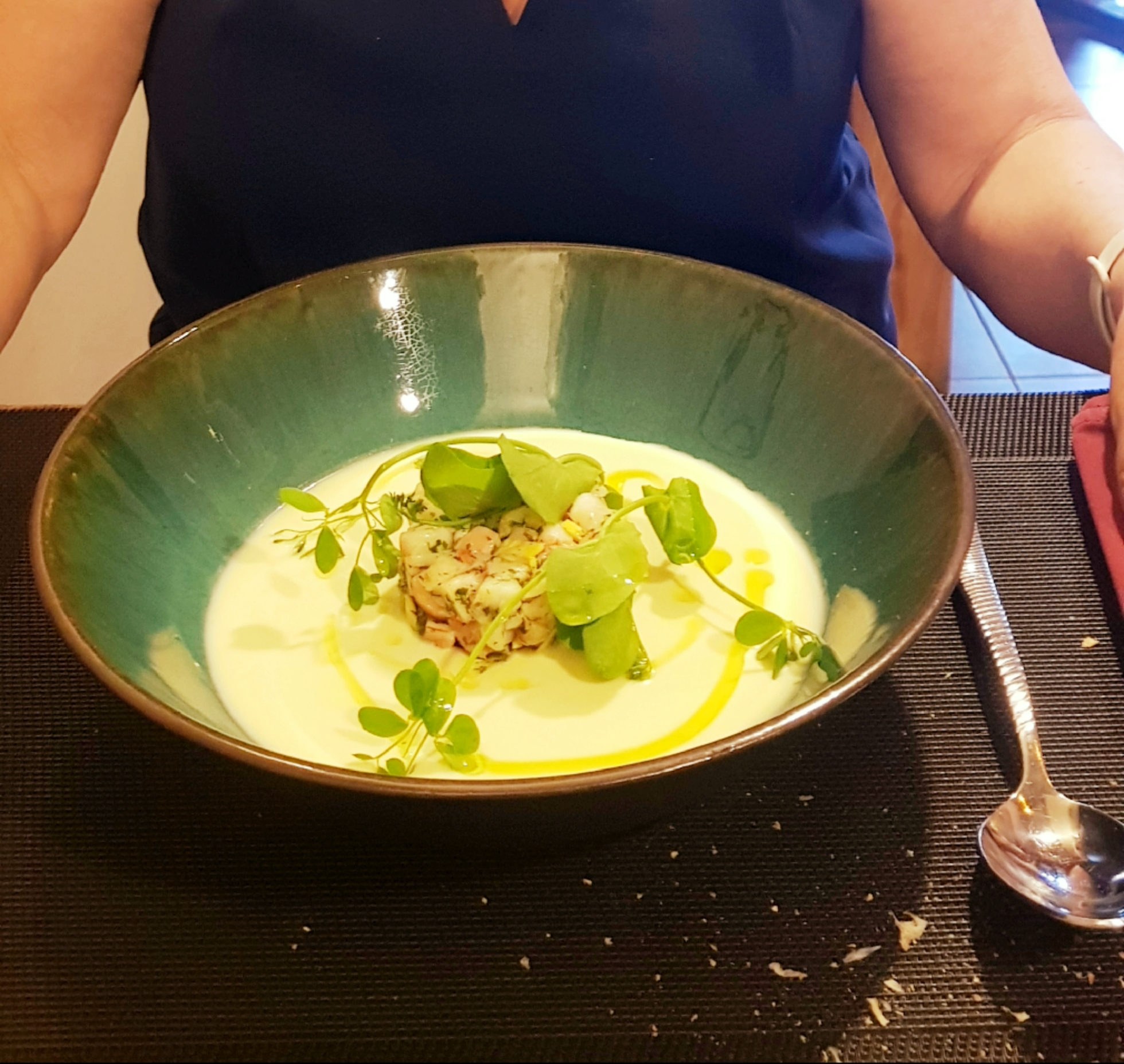 Menu du jour à 22 euros, un régal. En photo : l'entrée (soupe courgettes coco tartare crevettes) et le dessert (moelleux amandes glaces crème de marron et pistache). En plat, saumon et riz légumes.