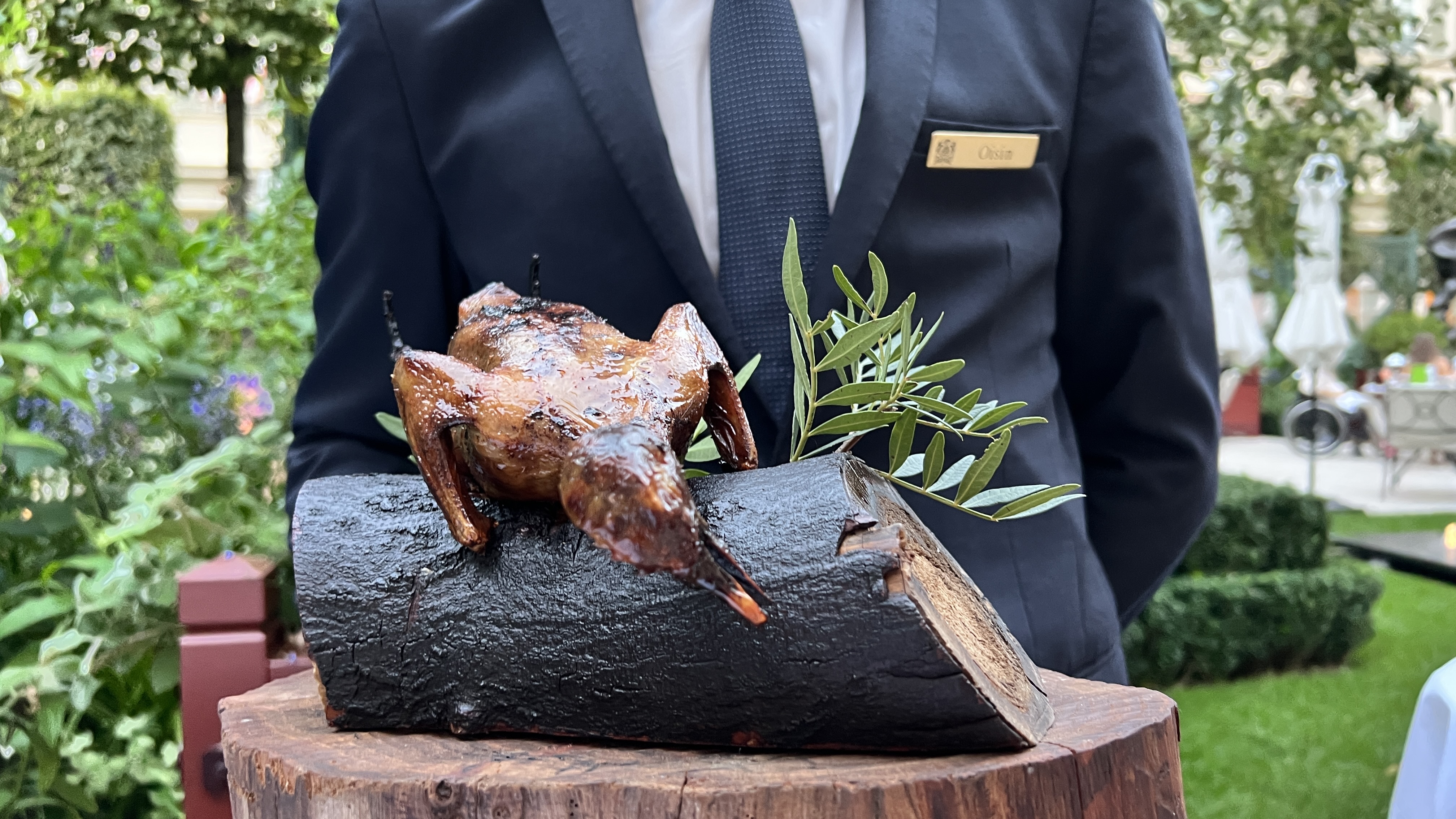 Traverser le parfait hall de marbre de l'hôtel Le Bristol offre une toile de fond splendide à ce summum de la croisière française. Le jeune pigeon était cuit entier et présenté sur son propre perchoir. Emporté en cuisine et savamment présenté dans mon assiette avec un jus riche et un bon bon au bacon. Je n'ai jamais goûté un plat aussi bon.
