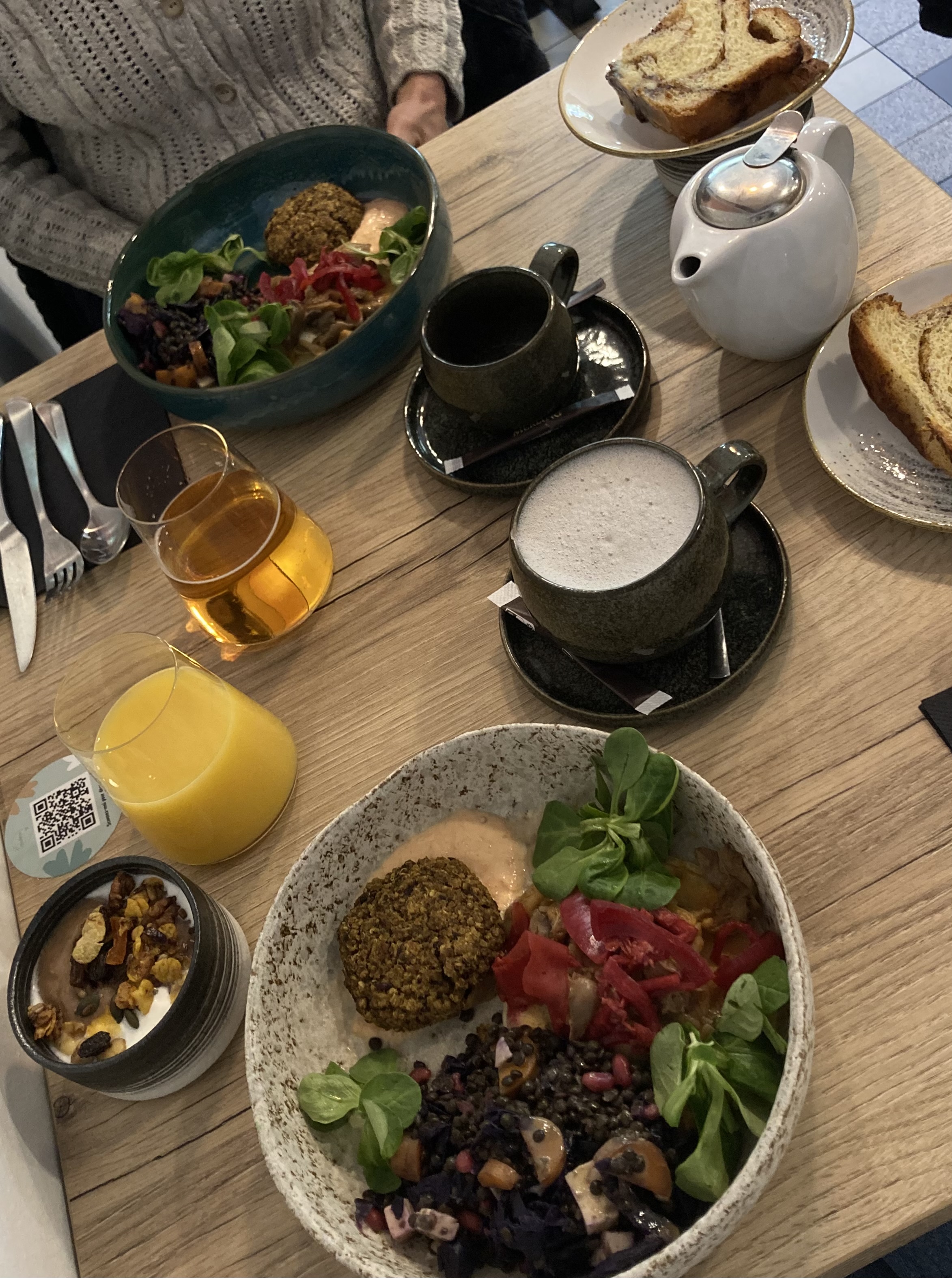 Lieu idéal pour profiter d’un moment convivial lors d’un goûter et se régaler avec de bons gâteaux et boissons chaudes. Il y’a des options véganes (avons testé le babka), un délice. Pour la partie apéritive il y’ 5/6 options originales, en revanche nous étions un peu déçu des planches proposées. La planche appelée « carnivore » ne contenait que deux petits morceaux de viande dans une recette, le reste était du houmous et du saumon, pas tellement garnis en viande pour un tel intitulé. On s’est quand même régalé.
