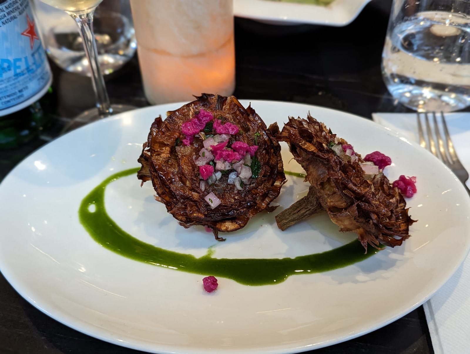Artichauts à la juive délicieux Joli cadre Service OK Faux filet délicieux, quelques légumes pour accompagner la viande seriaient bienvenus en plus de la purée de pommes de terre. L'assiette fait un peu vide.