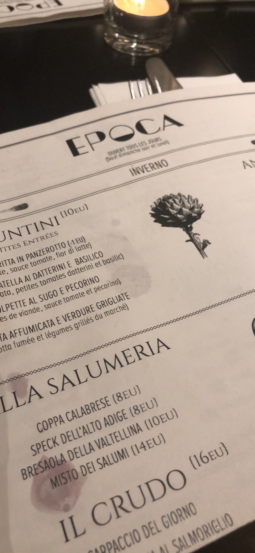 Habituellement, je n'aime pas les artichauts mais Epoca a réussi à me faire changer d'avis avec son entrée, les carciofi alla giudia qui sont une tuerie... J'ai aussi commandé la cotoletta alla milanese, un vrai régal. Si vous recherchez une gastronomie italienne dans la pure tradition, je vous recommande vivement cette adresse (parole d'un mi-italien) !