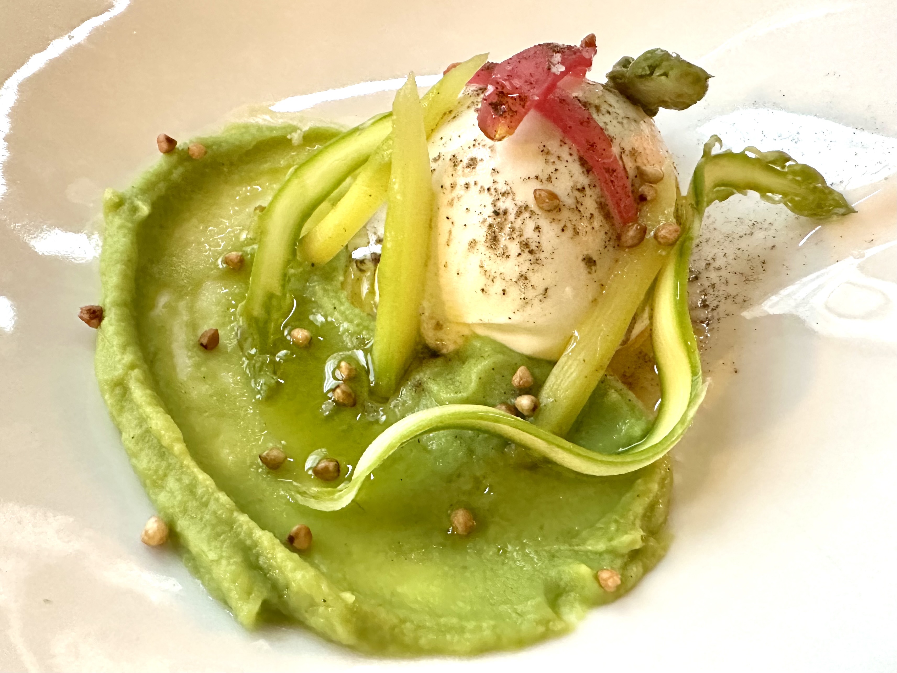Resto découvert à taste of Paris. Les raviolis à la truffe avaient l'air trop bons. Je suis un peu déçue car pas beaucoup de sauce dans l'assiette, les pâtes étaient légèrement sèches sinon très bonne cuisson et belle qualité des produits. Service correct. Prix environ 50e par personne le soir.