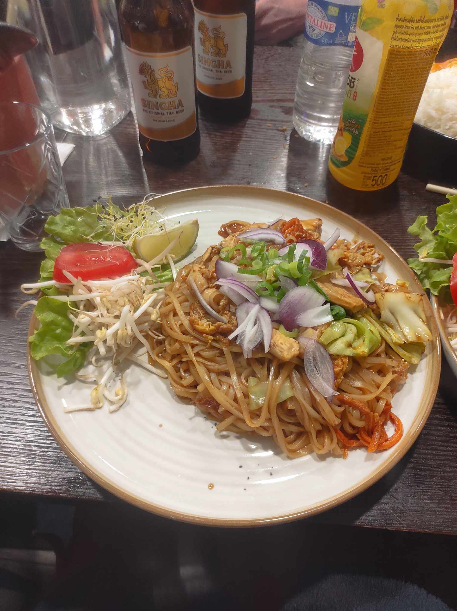Pad Thaï nouilles crevettes (sur la photo) repas copieux, peu onéreux, avec beaucoup de saveurs…jolie présentation ! Merci beaucoup ! Tony