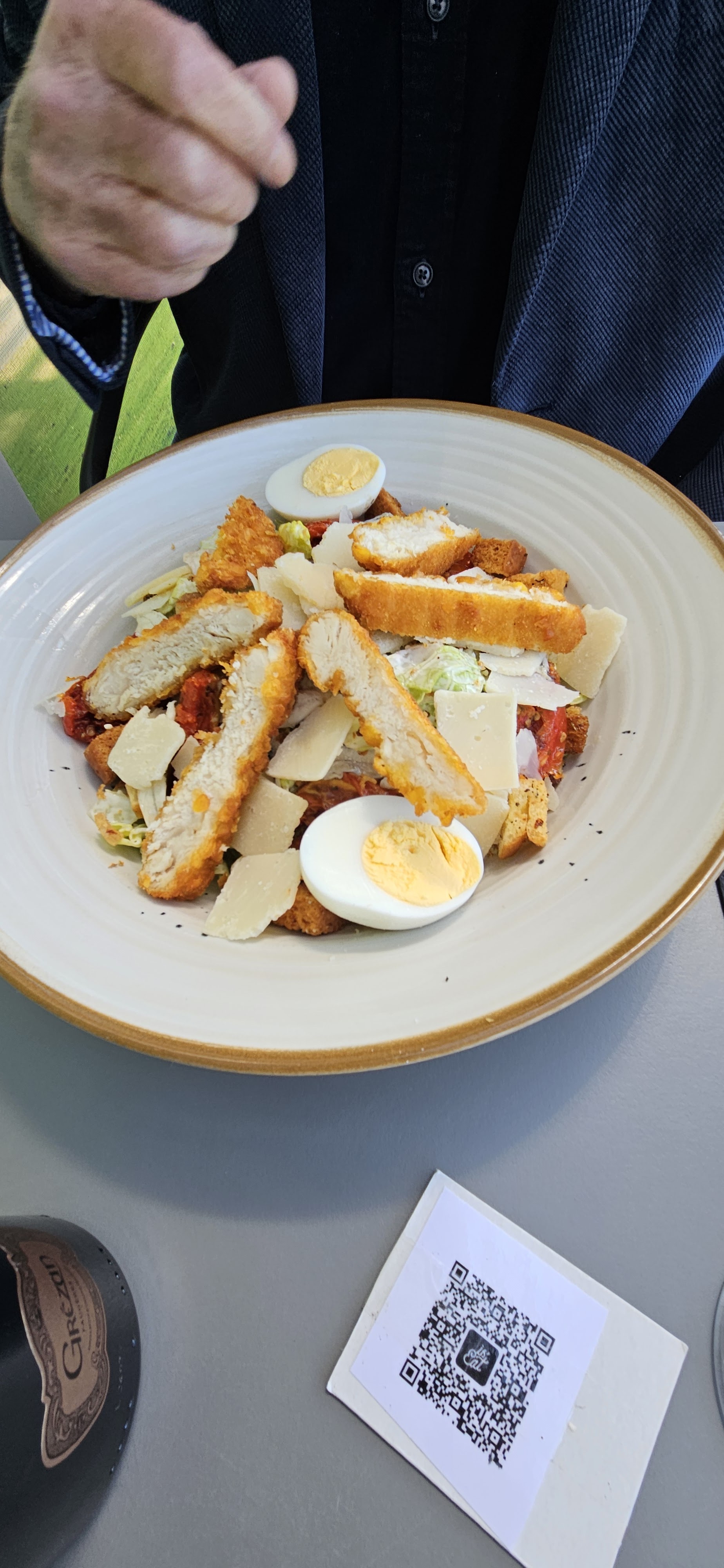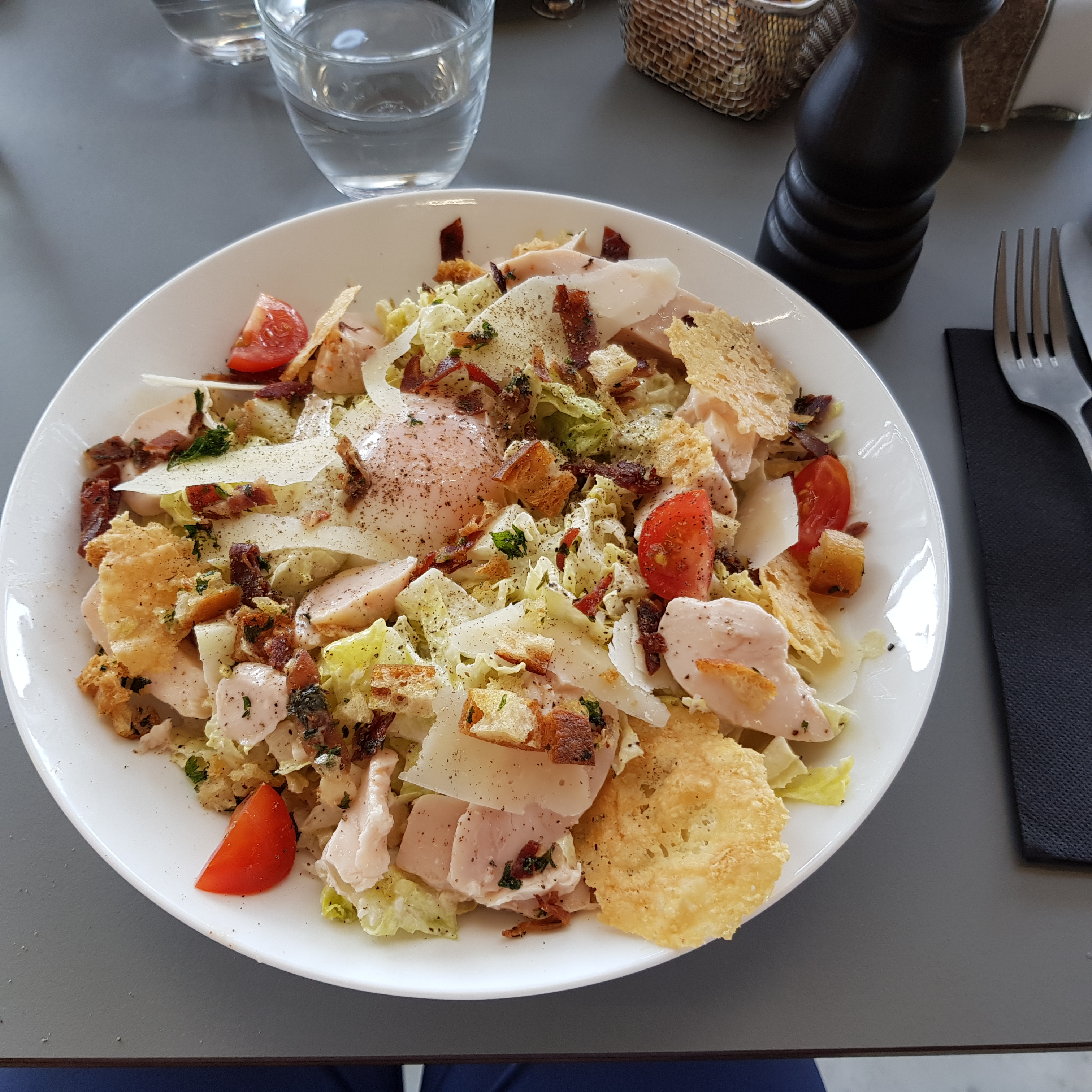 Rapide déjeuner avant le parcours. La salade César (un peu trop salée, j espère que la jeune serveuse a transmis en cuisine !) est copieuse et goûteuse. L assiette du golfeur avec frites est suffisante en quantité sans être copieuse, et goûteuse ! Mais j' aimerais que les préparations sentent plus le fait maison (sauce César) ! La vue est agréable mais la salle est un peu bruyante !