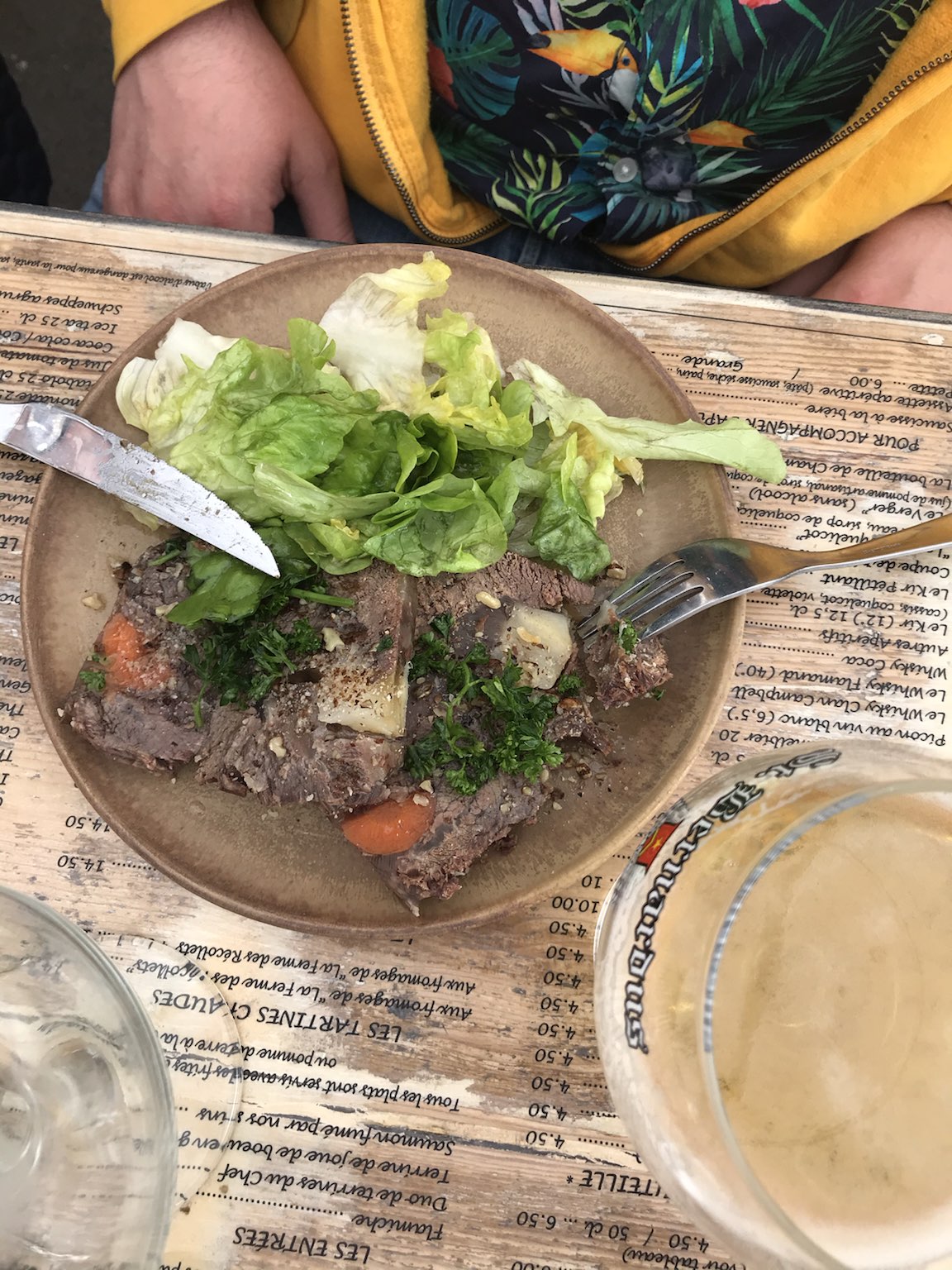 Nous avons pris tous les 2 la carbonade flamande. Très bon et très copieux, j aurai quand même bien voulu goûter aussi les ribs. Ce sera pour une prochaine fois. J'ai été étonnée de ne pas trouver de welsh, ce n'est pas très grave, il y a suffisamment de choix. Un estaminet traditionnel avec sa déco, ses plats, ses jeux, sa simplicité sophistiquée, exactement ce que je voulais. Equipe très sympathique, bon rapport qualité/ prix. Ne changez rien!! Pour les futurs visiteurs : pensez à réserver !!