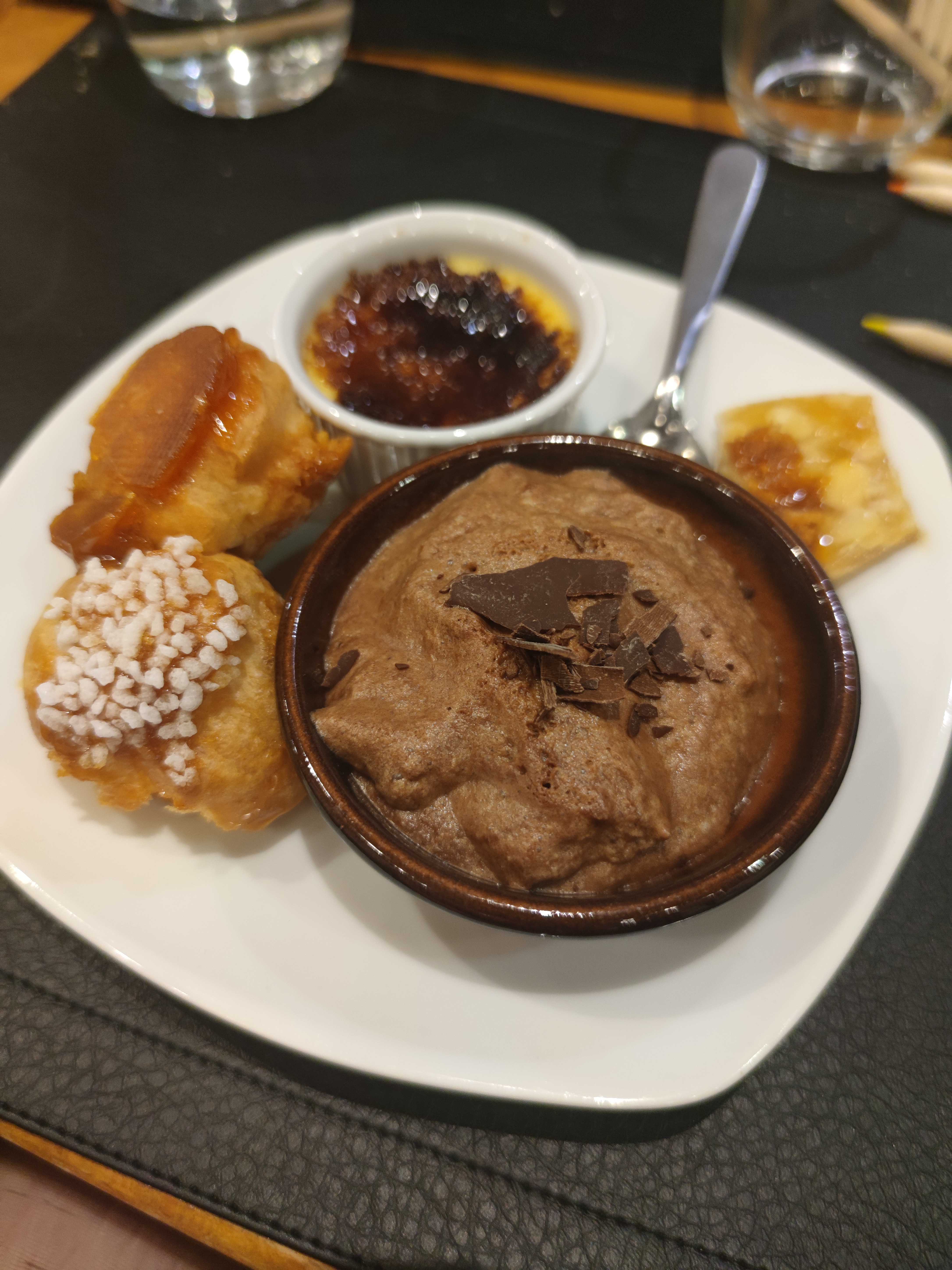 Tarte au maroilles en entrée (excellent), welsh en plat (passable) d après les autres avis on s'attendait a mieux, c'est la première fois que l'on est déçu par un welsh. Et café gourmand en dessert 4 mignardises ( clémentine, faisselle et coulis d'abricot, crème brûlée et petit gâteau à la poudre d'amande )