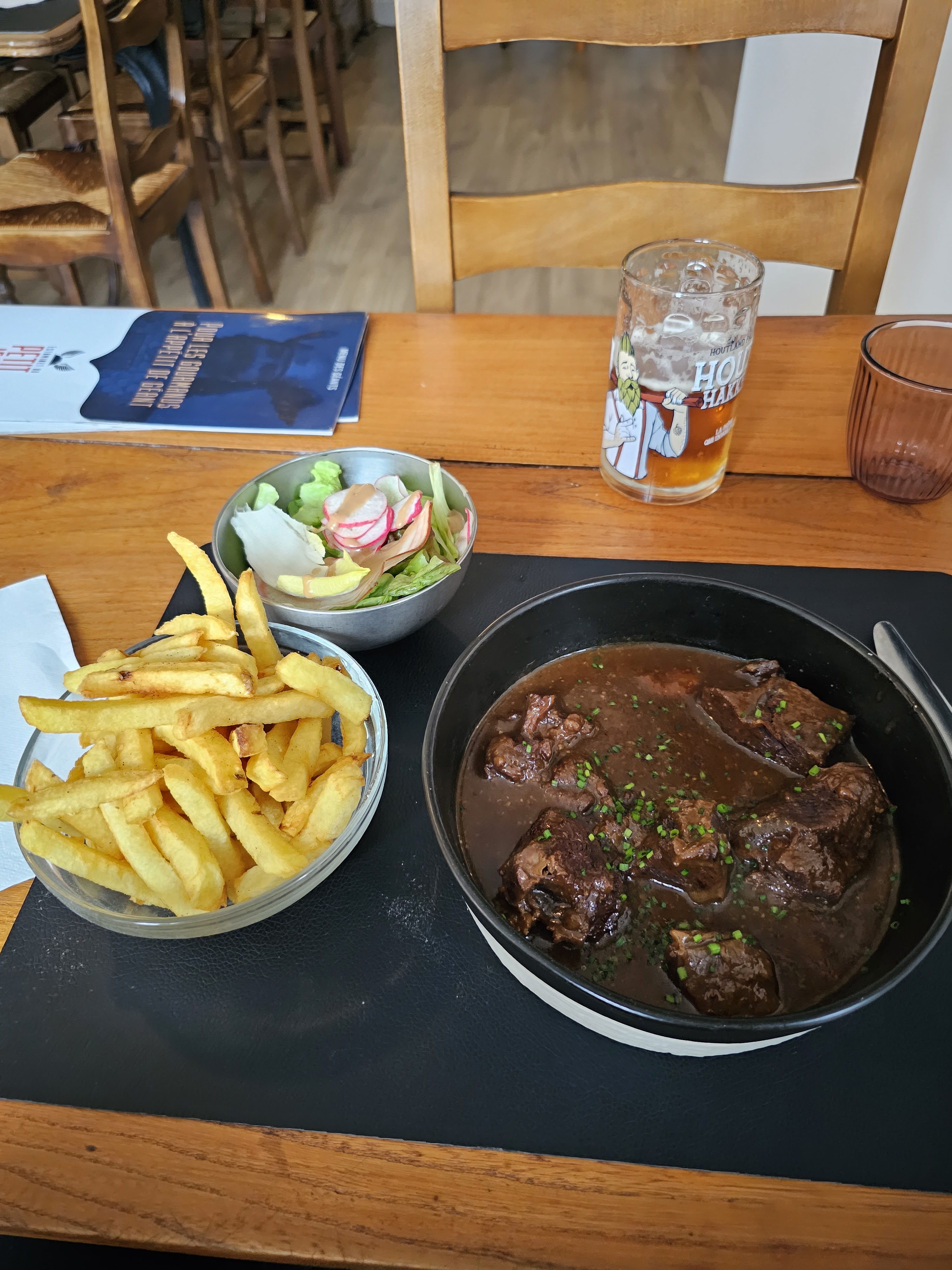 Carbonnade flamande et poulet au maroilles faits maison très bons. Des bières artisanales viennent compléter la carte.