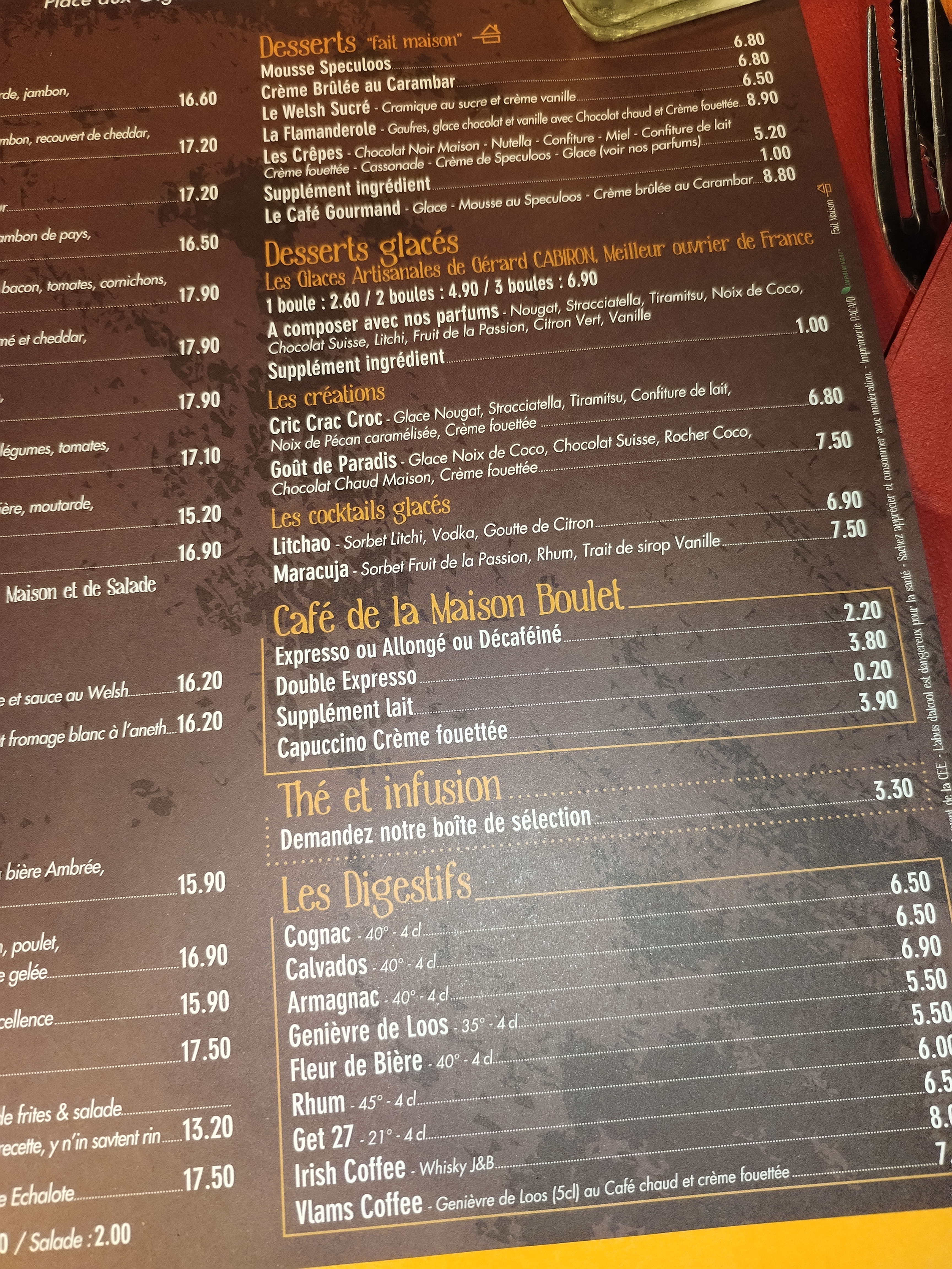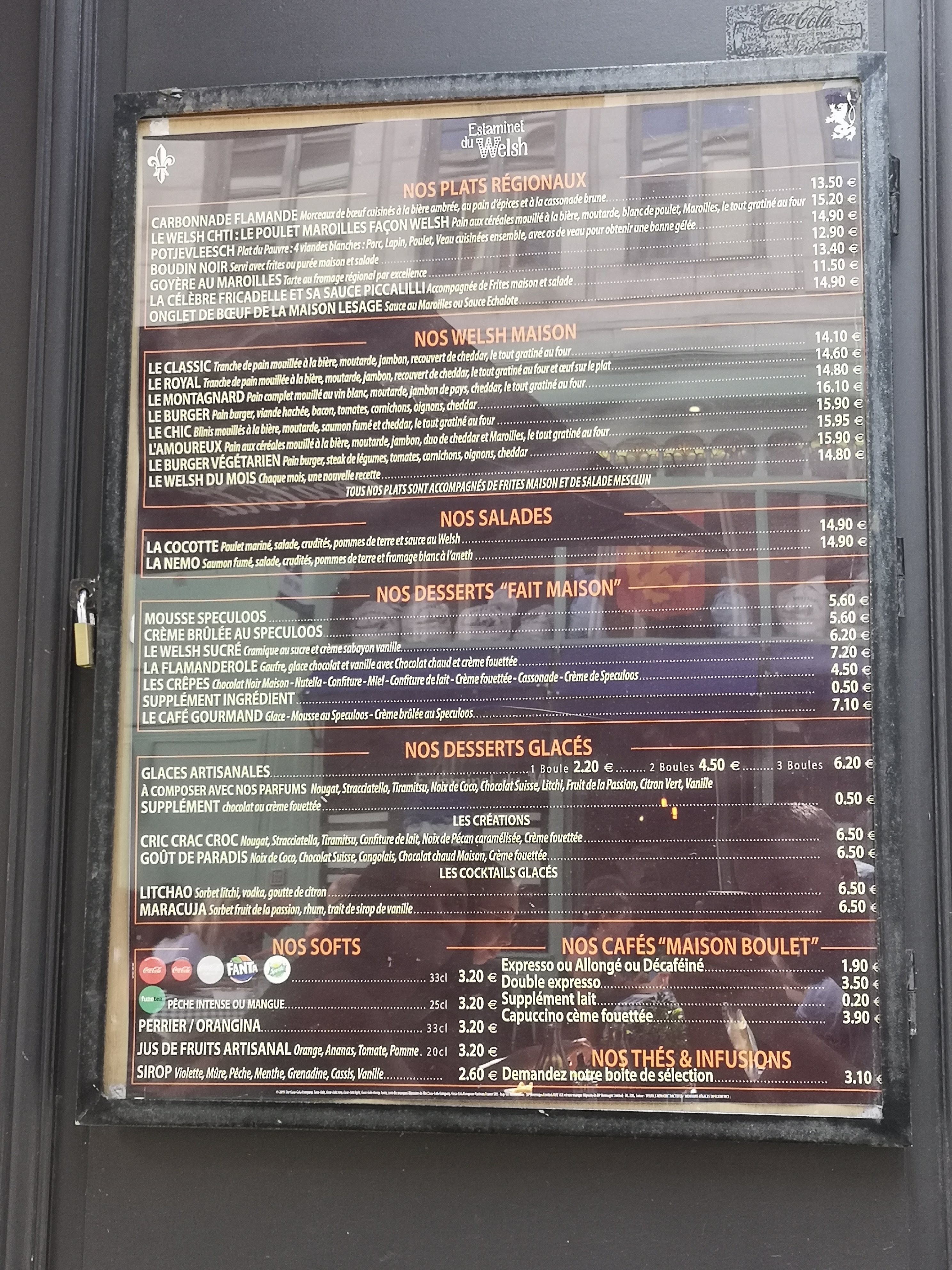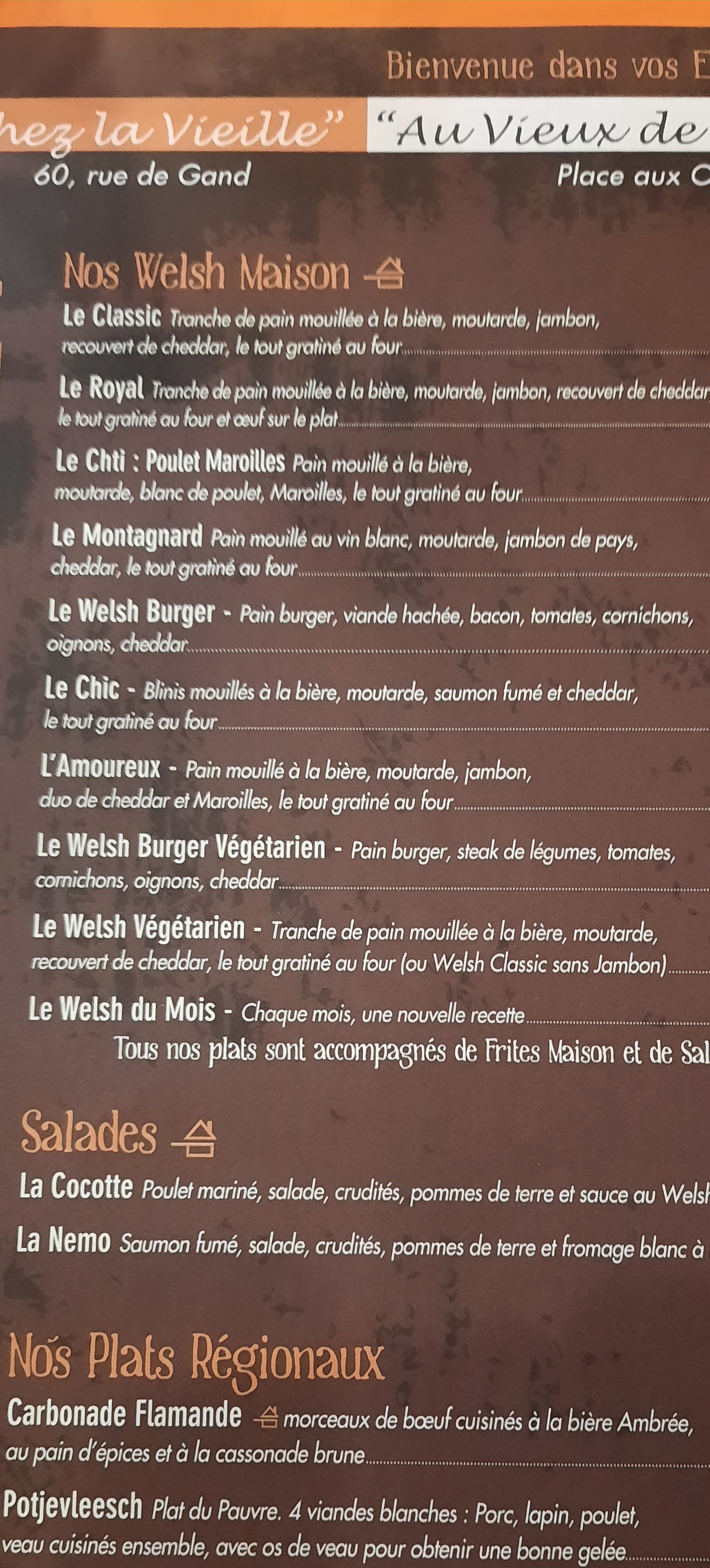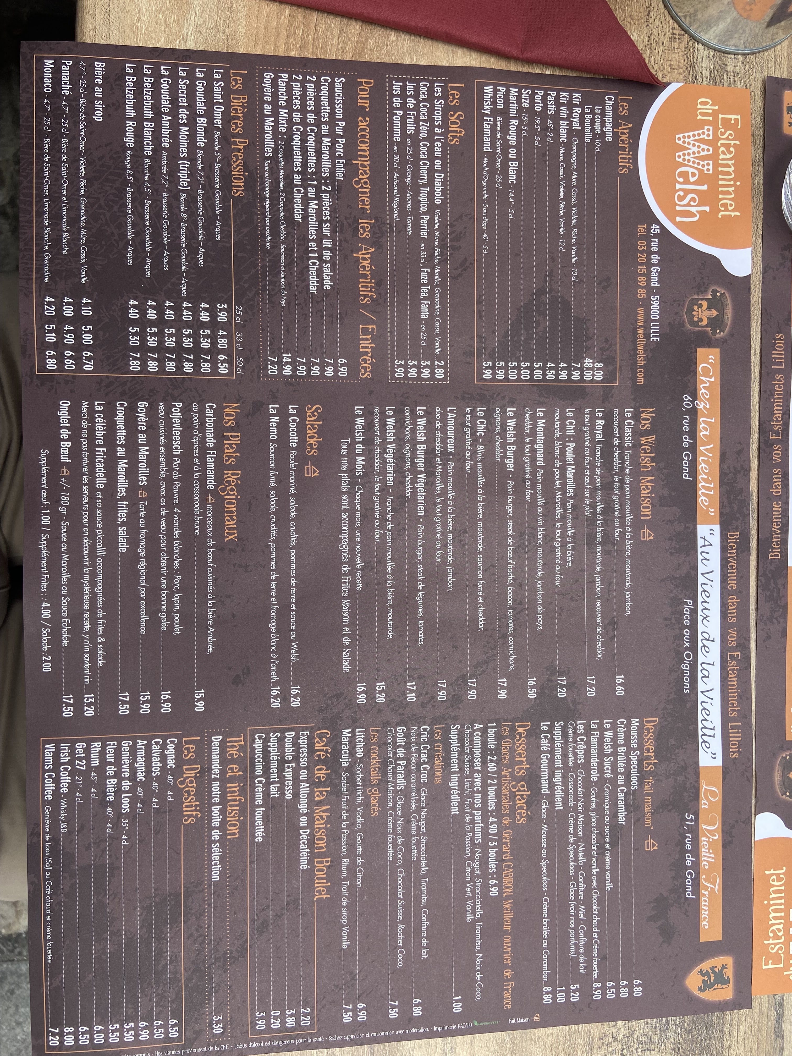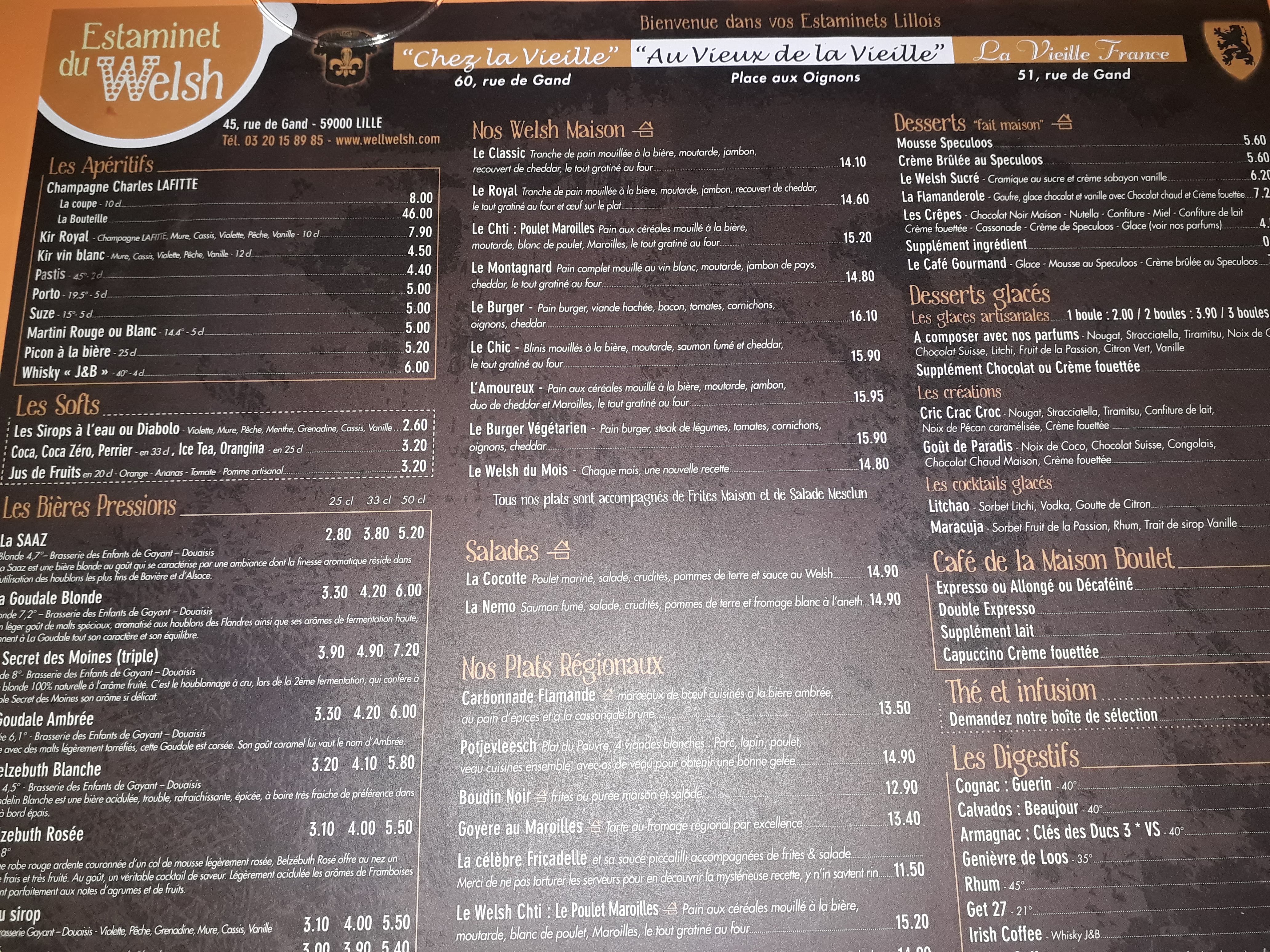 Carte avec toutes les spécialités typiques du Chnord, welch, fricadelle avec recette secrète, carbonade, etc... on a goûté les trois, très bons et sans se fracasser le porte-monnaie.