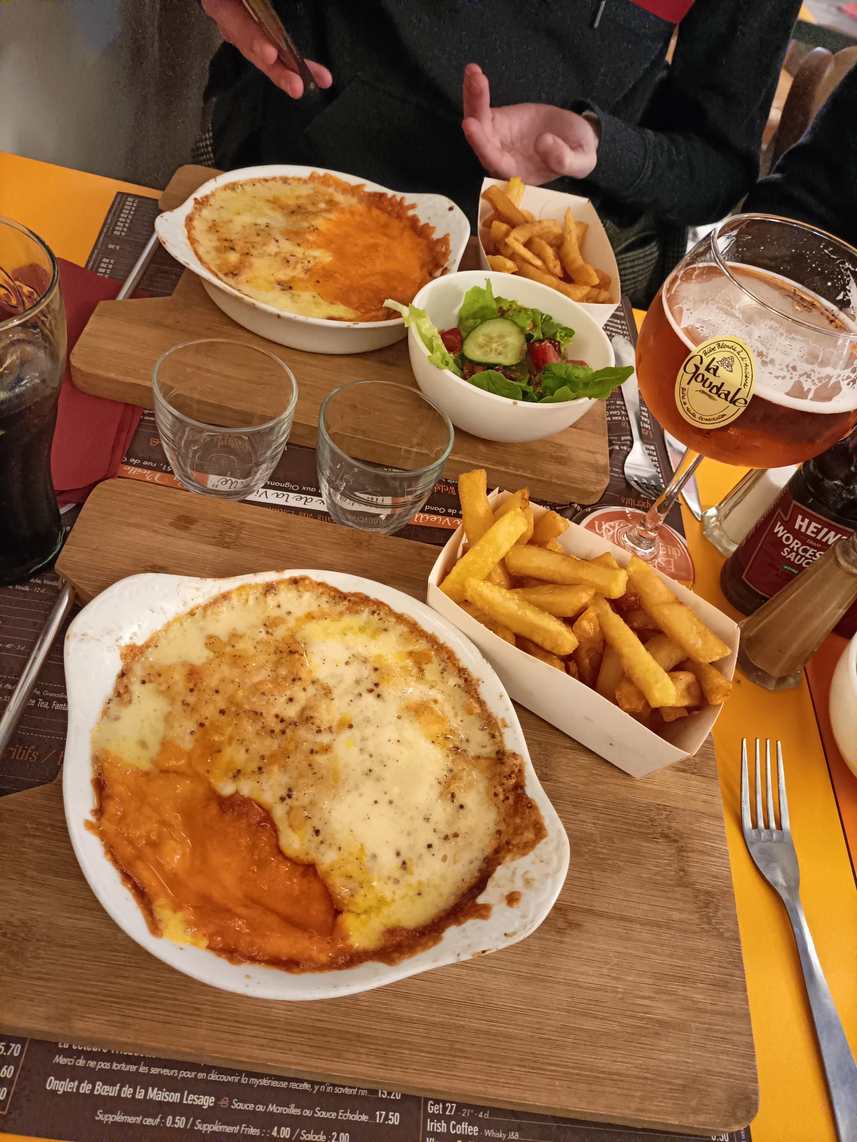On avait pris une réservation pour 4, on nous a installé sans problème etc Et arrivent les plats ! Personnellement j'ai été plutôt satisfait de mon welsh l'amoureux, ça m'a bien rempli le ventre et il était plutôt bon. Par contre les autres plats à la table c'était moins fou... La célèbre fricadelle, deux petites fricadelles dans une grande assiette bourrée de frites et de salade. La goyère (tarte) au maroilles, un quart de tarte insipide, on aurait dit une tarte à l'œuf avec un soupçon de maroilles et encore une fois les 3/4 restants de l'assiette bourrés de frites et de salade La carbonnade flamande une petite assiette avec (littéralement) 6 petits morceaux de viandes et deux cuillères de sauce et des frites (mais la viande et la sauce étaient plutôt bonnes dommage que ça soit une portion minuscule). En résumé des petites portions compensées avec trop de salades et de frites pour un prix relativement élevé (environ 16-18€ l'assiette quand même). C'est dommage quand on voit la plupart des avis positifs... je pense pas qu'on revienne dans cet estaminet. Je mets 3 étoiles quand même car moi ça a été pour la quantité et le plat, mais en voyant le reste c'est pas possible, je me suis limite senti mal pour les autres. Et le service était un peu lent mais ça va c'est vendredi soir le resto est rempli c'est pas grave