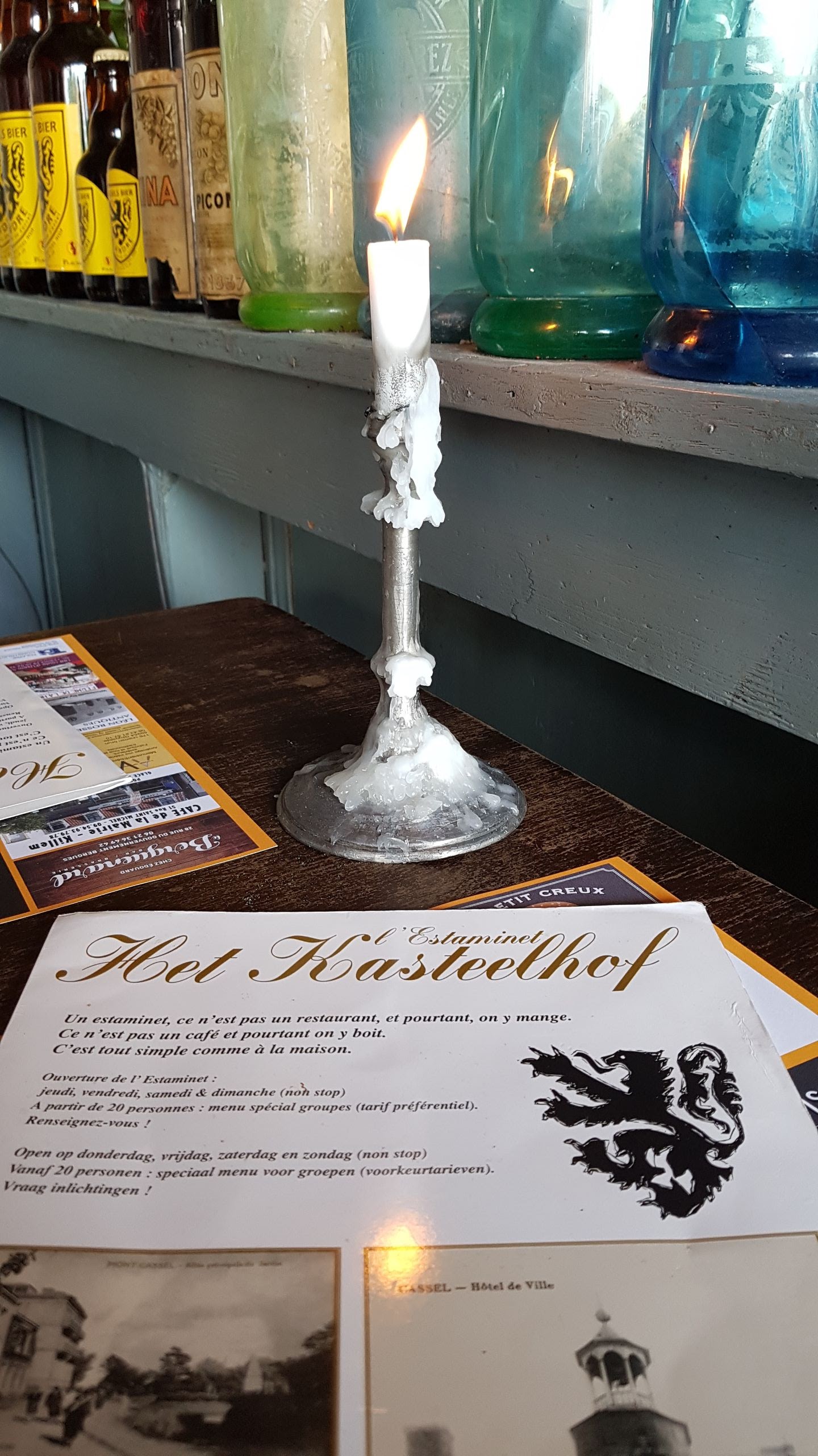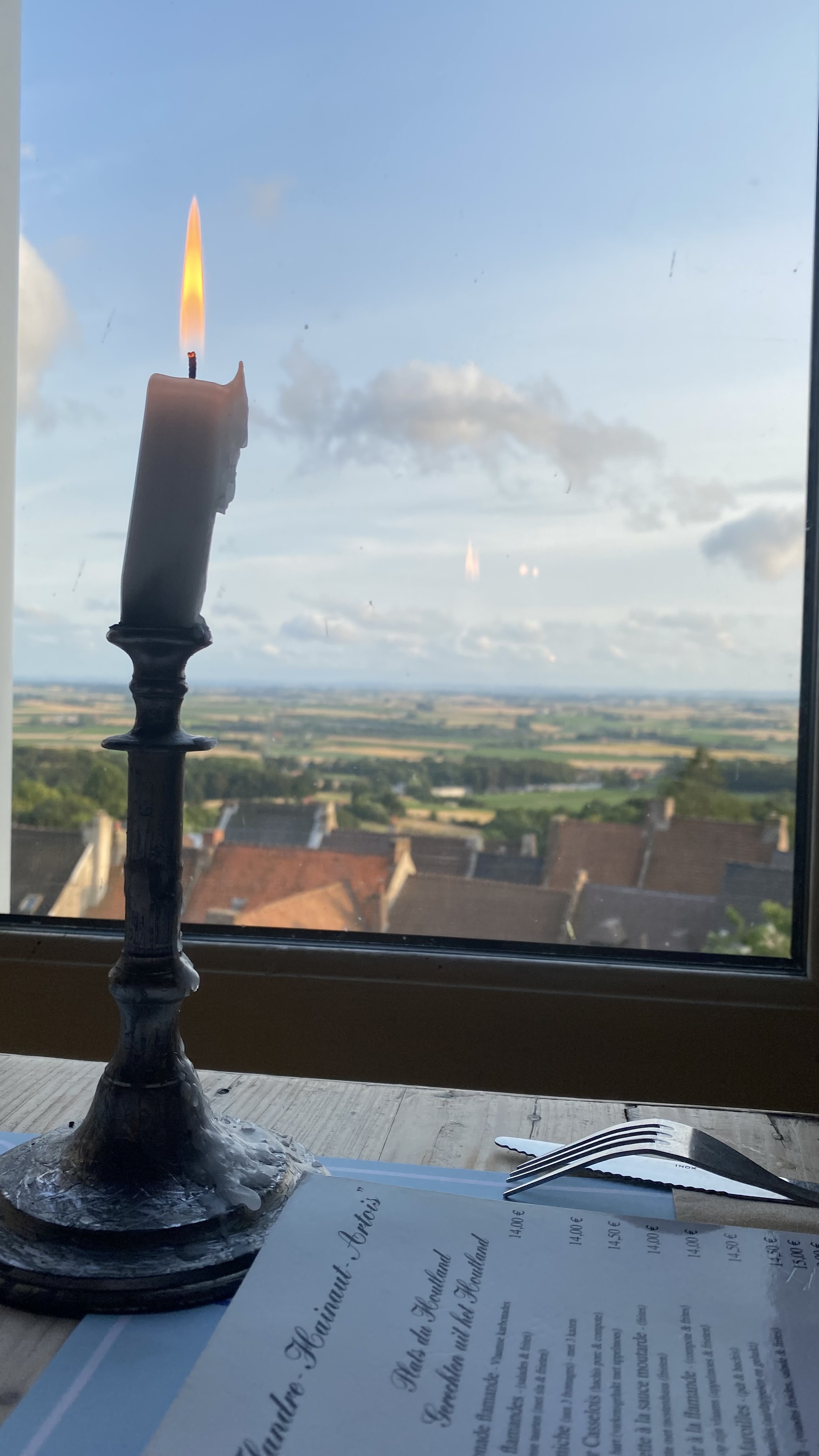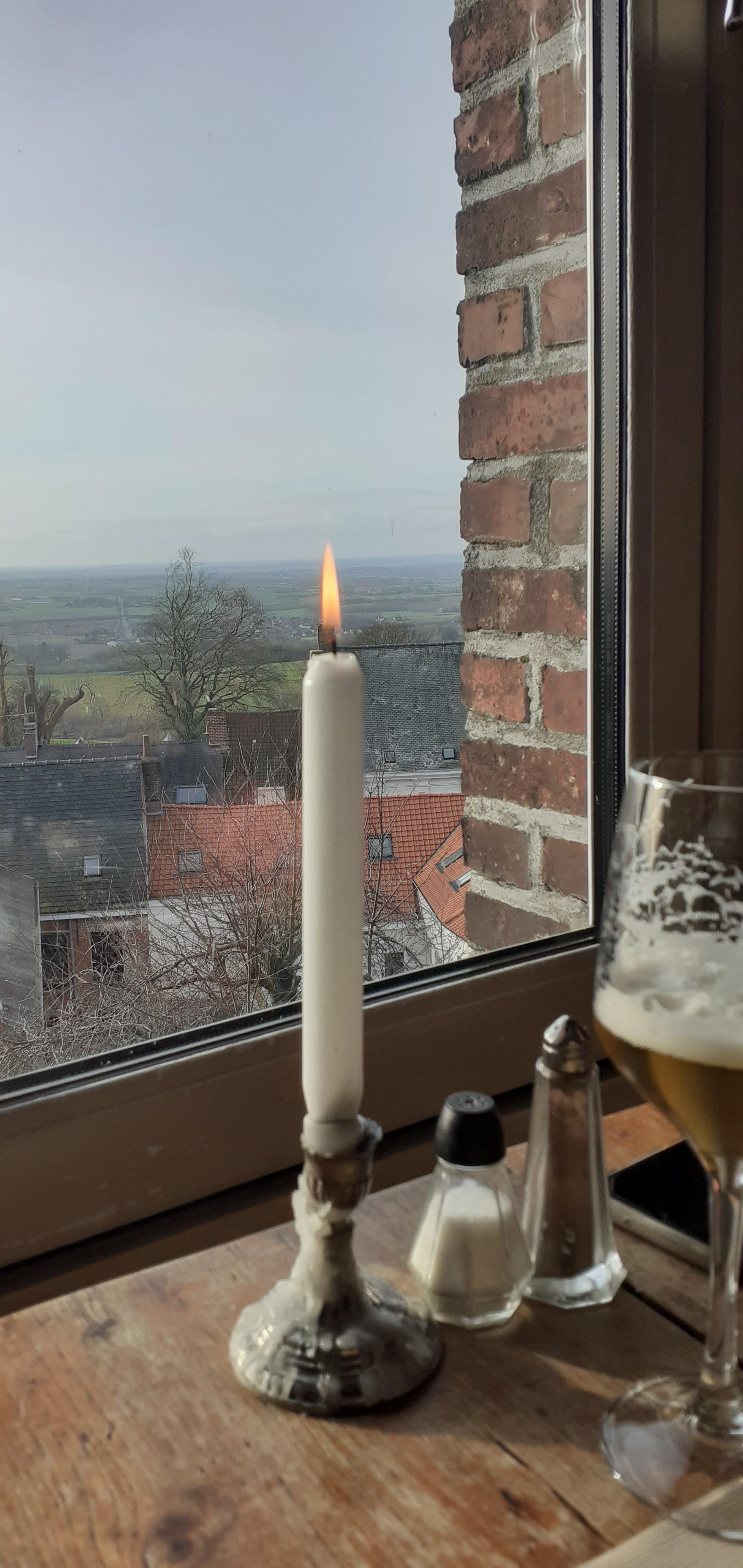 Simple passage dans l'après midi. Très bien reçus. Les yeux prennent plaisir à la vue sur les toits de Cassel, la campagne environnante et la décoration hors du temps de l'estaminet éclairé aux chandelles.