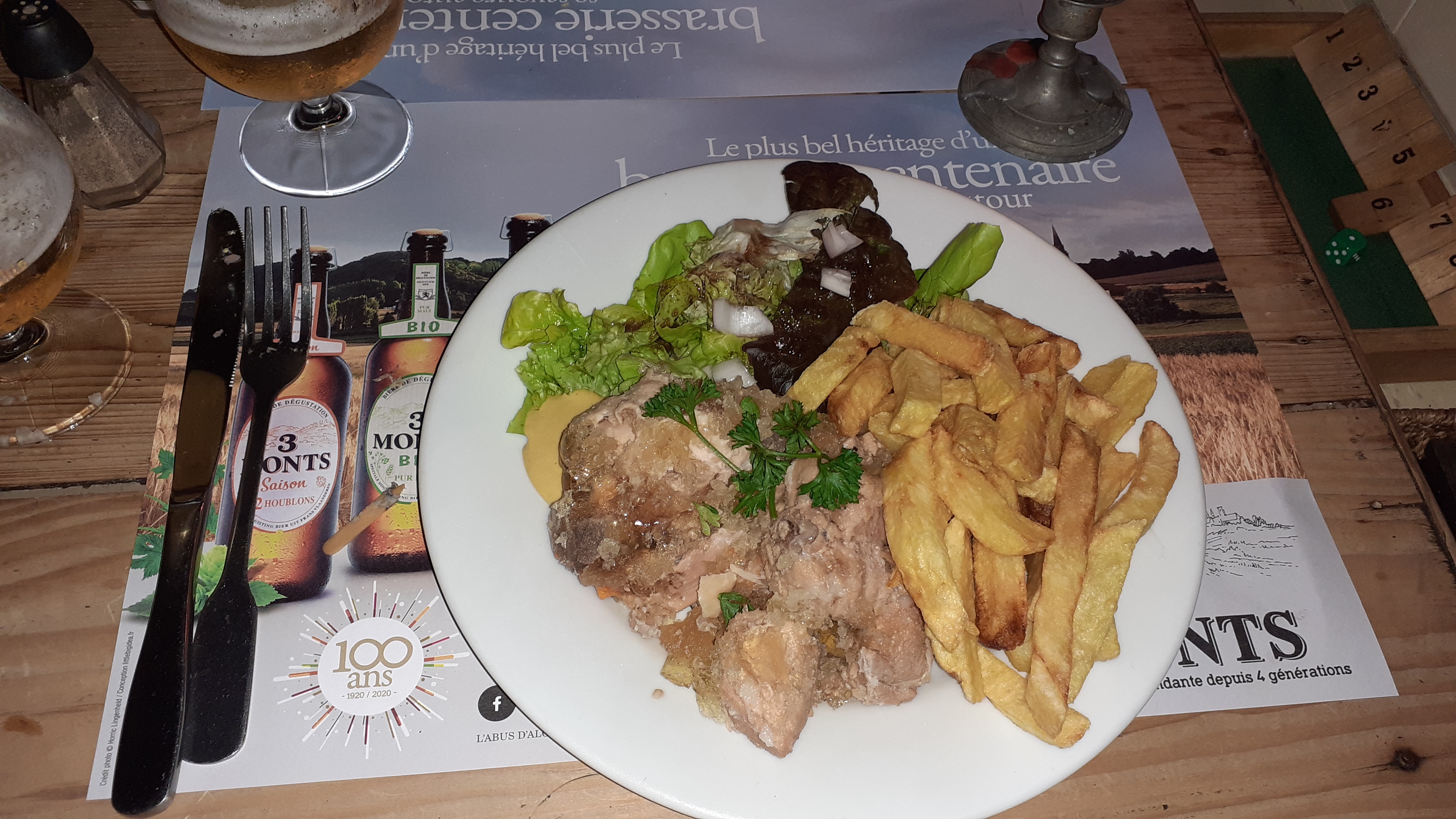Nous y sommes allés à 6 dimanche soir, nous avions réservés. Dès notre arrivée super accueil, salle conviviale décorée avec des objets d'époque et du houblon, la cheminée fonctionnait c'était un vrai régal vu qu'on était pas très loin des températures négatives dehors. La bière de l'estaminet était bien sympa (entre blonde et ambrée mais plutôt douce), accompagnée de 2 planches une de poissons et l'autre de charcuterie. Roll mops, hareng, rillettes de sardines, saumon,... Et pâté à la rhubarbe (qui a fait l'unanimité), rillettes maison, pâté de foie,... Dans les plats il y a eu émincés de poulet au maroilles au top, des tripes (un petit peu grasse mais très bien cuite avec une bonne sauce), omelette au fromage et boudin noir (ami conquis qui a enchaîné sur une planche de fromage 😉) et carbonnade flamande servie avec les frites dans la sauce (le meilleur). C'était tellement bon, goûtu, bien préparé et bien servi qu'on a pas voulu que l'instant s'achève, on a enchaîné sur les desserts, crêpes et terrines de chocolat, on s'est tout bonnement RÉ-GA-LÉ !!! Je conseille vivement. (les salles contiennent 35 pour la petite et 5, pour la grande, il est fortement conseillé de réserver) En plein jour il y a la vue sur le moulin et un joli point de vue sur la ville 😀