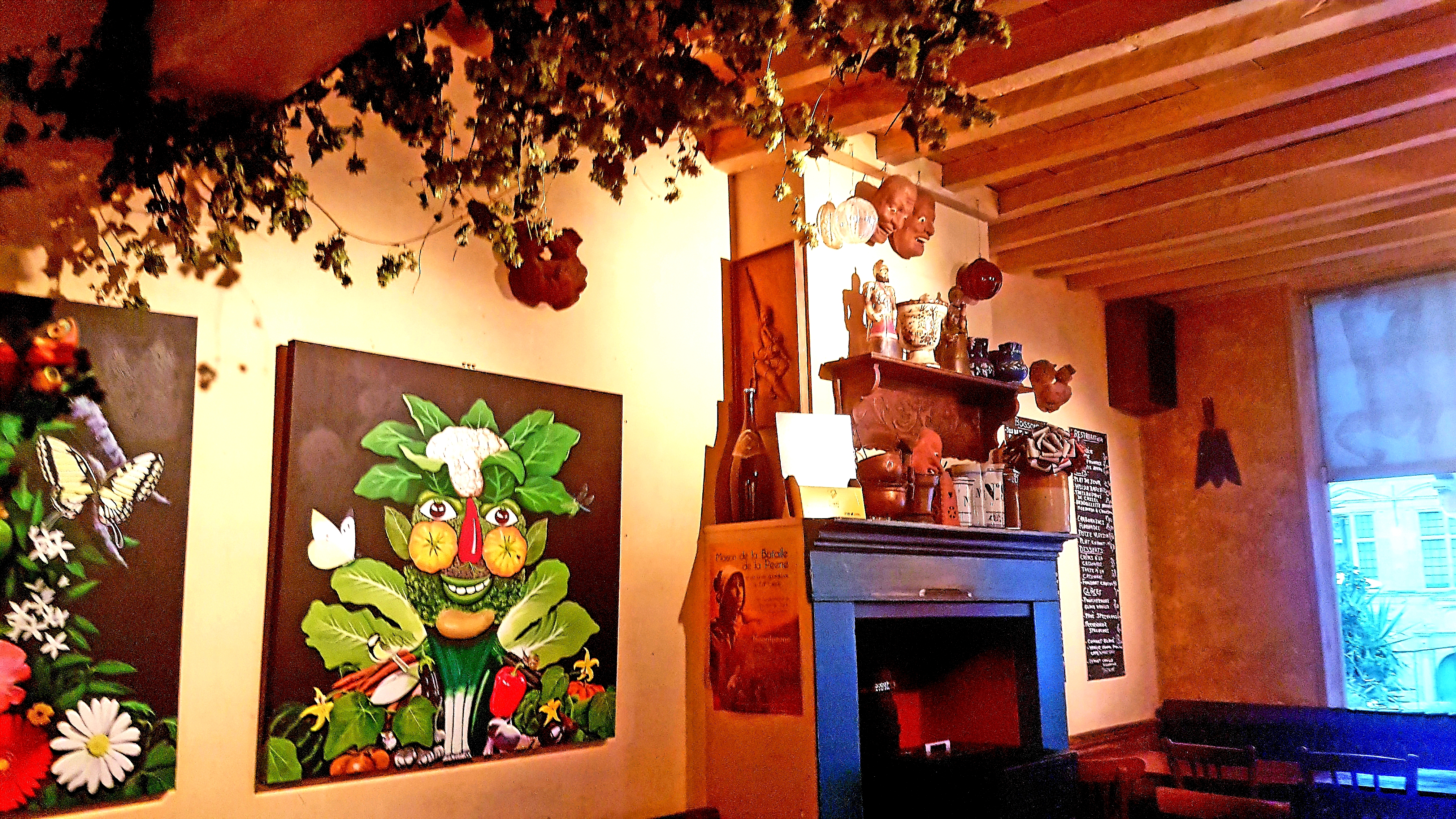 Estaminet situe sur la grand place de Cassel, Il ne paie pas de mine vu de l extérieur. Fenêtre et porte qui manque sérieusement de peinture mais un lieu typiquement flament par se décoration d intérieur, avec les ustensiles d un temps ancien et le houblon accroché aux poutres. Il y fait bon avec le feu style connecteur!! Cuisine très bonne et copieuse, pas d attente pour avoir une place même sans avoir réserve un jour de fête!!! Accessible aux personnes a mobilité réduite et parking sur la place. Une jolie serveuse vous accueillera avec le sourire