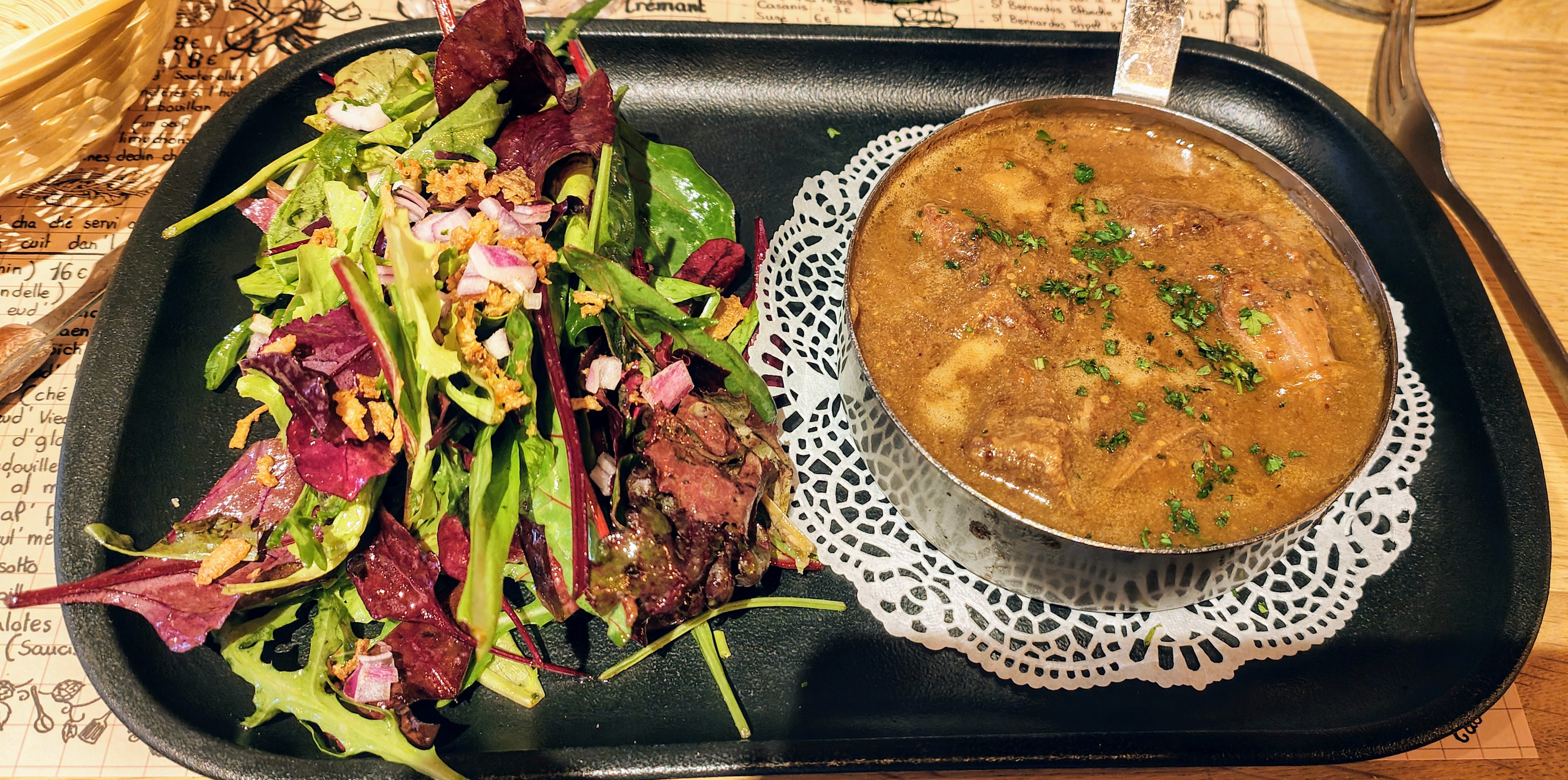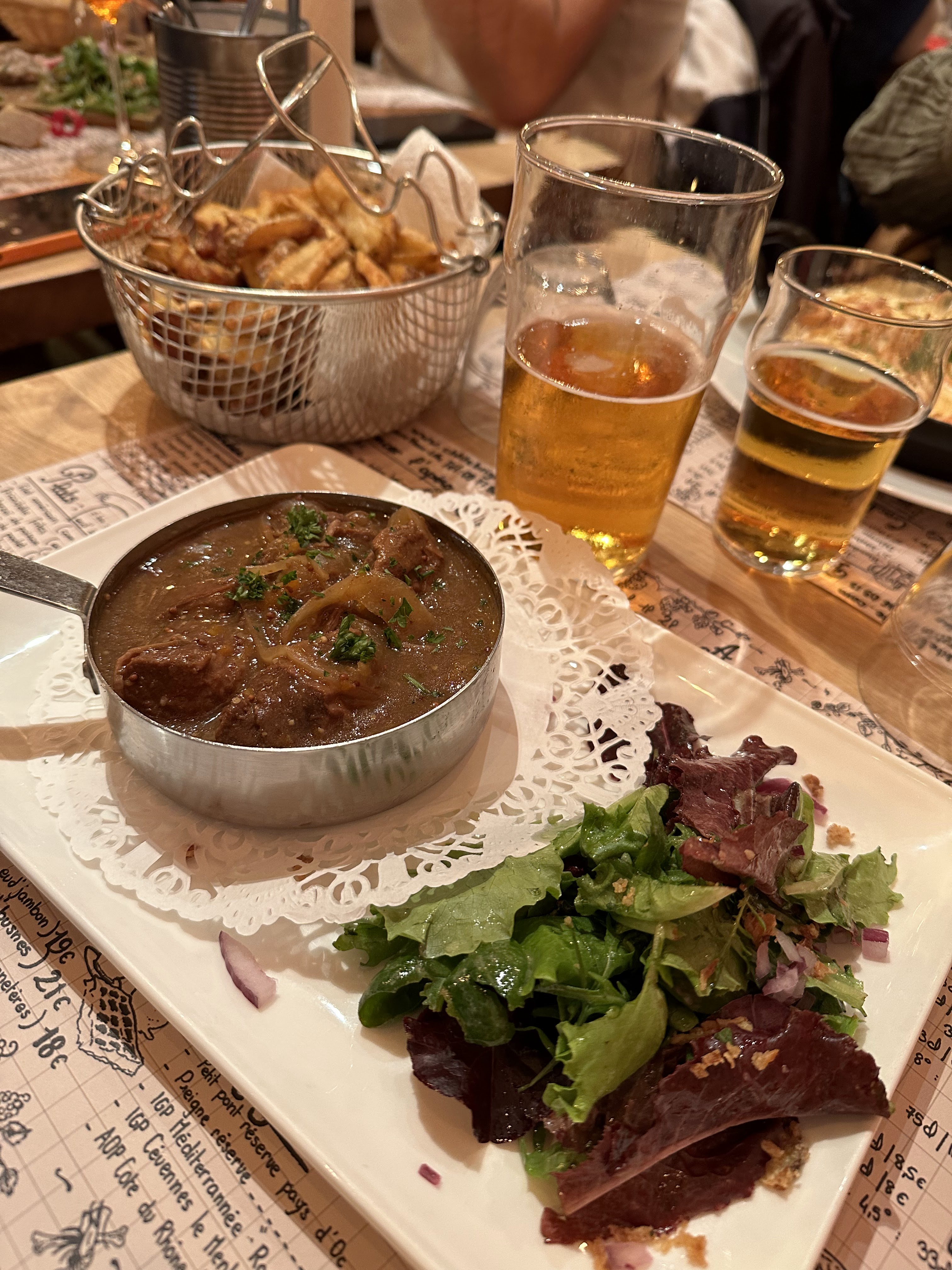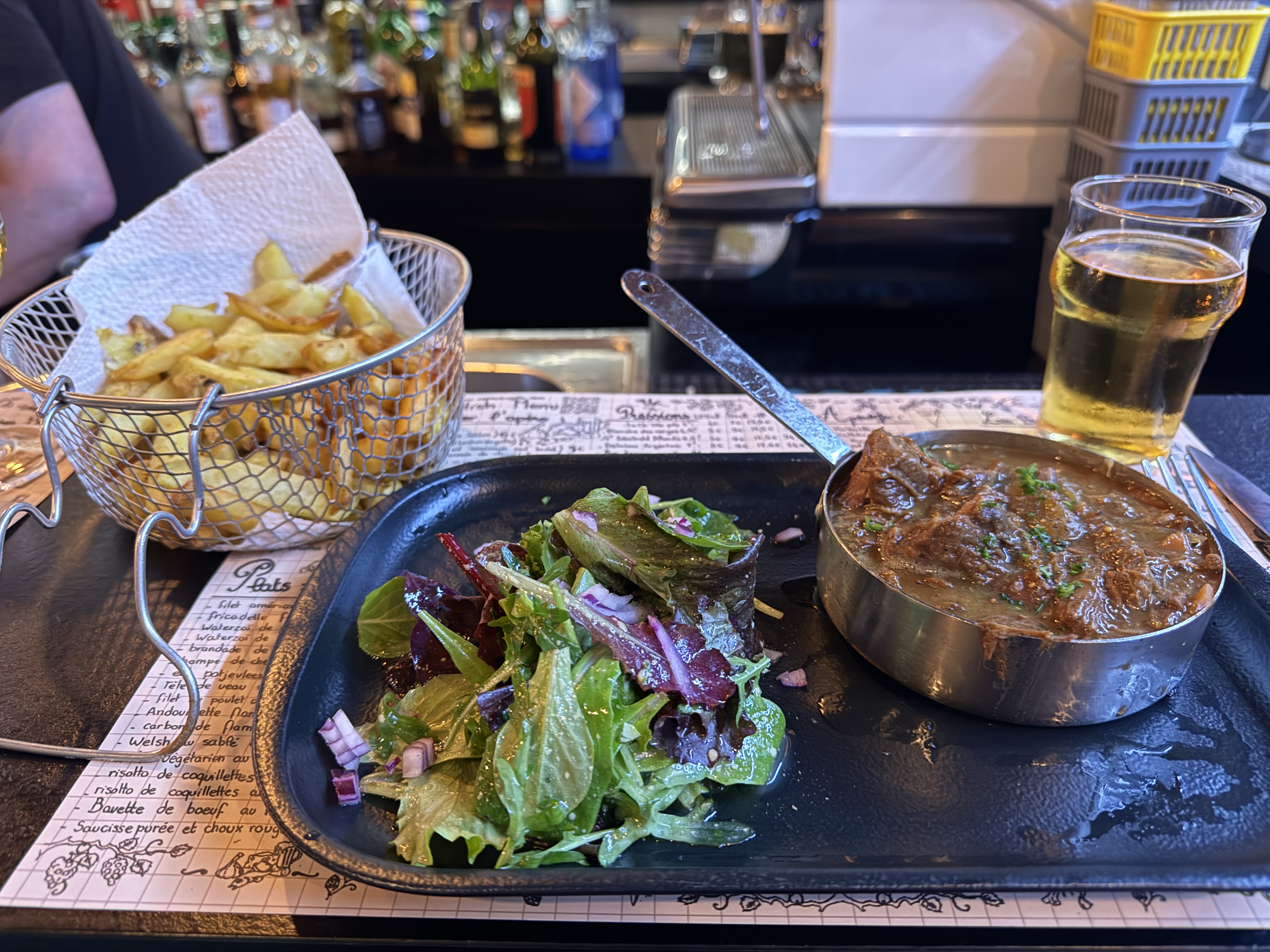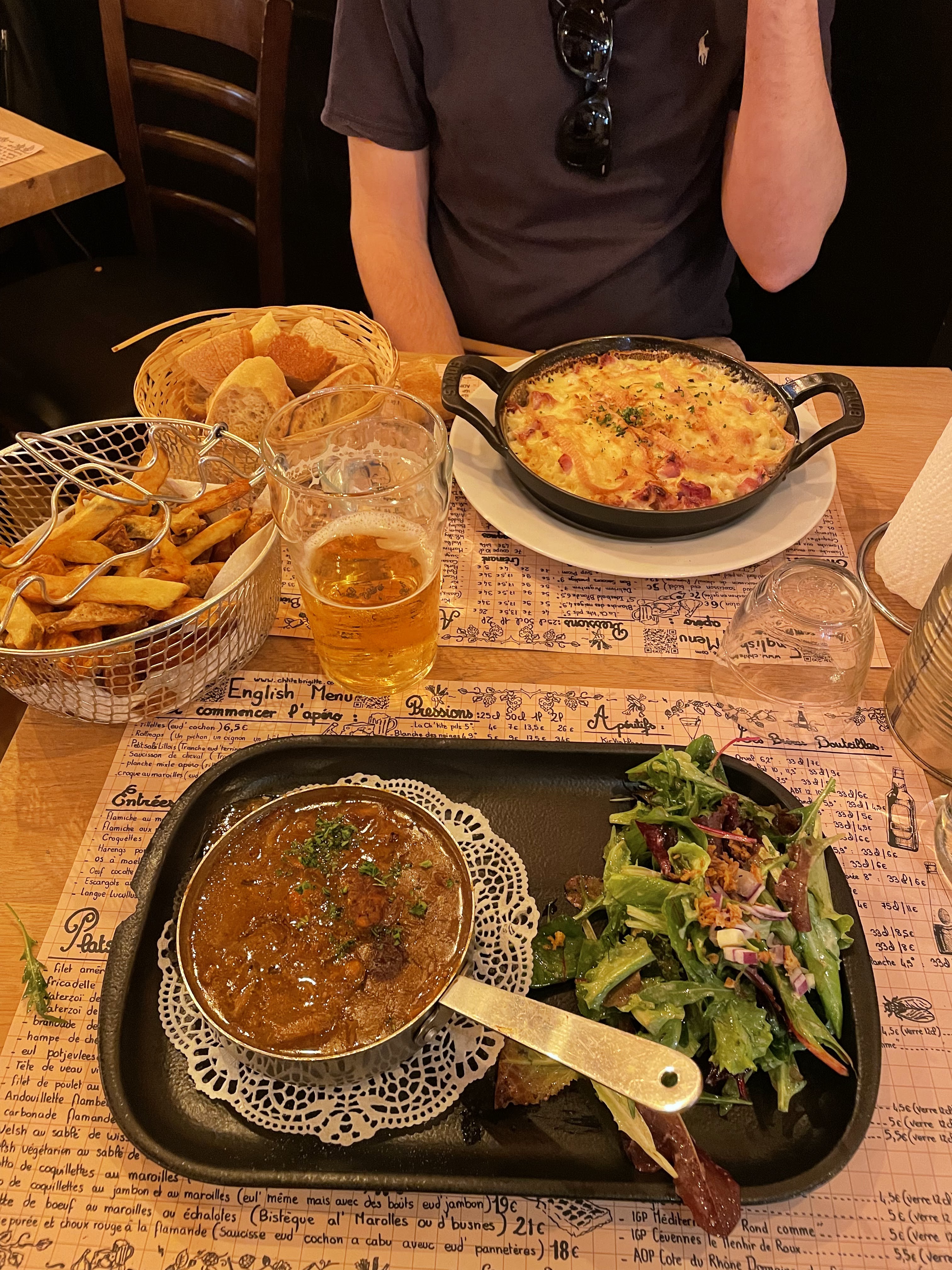 Cet endroit était une bénédiction absolue d'une trouvaille ! Une si bonne ambiance à l'intérieur, la nourriture sentait bon, le personnel était très hospitalier et une fois la nourriture arrivée, nous étions au paradis. Vous devez visiter ici si vous êtes à Lille ! J'ai eu la tarte au fromage, suivie du ragoût flamand et du pain perdu en dessert. C'était la perfection absolue et leurs frites à volonté sont les meilleures que j'ai jamais mangées.
