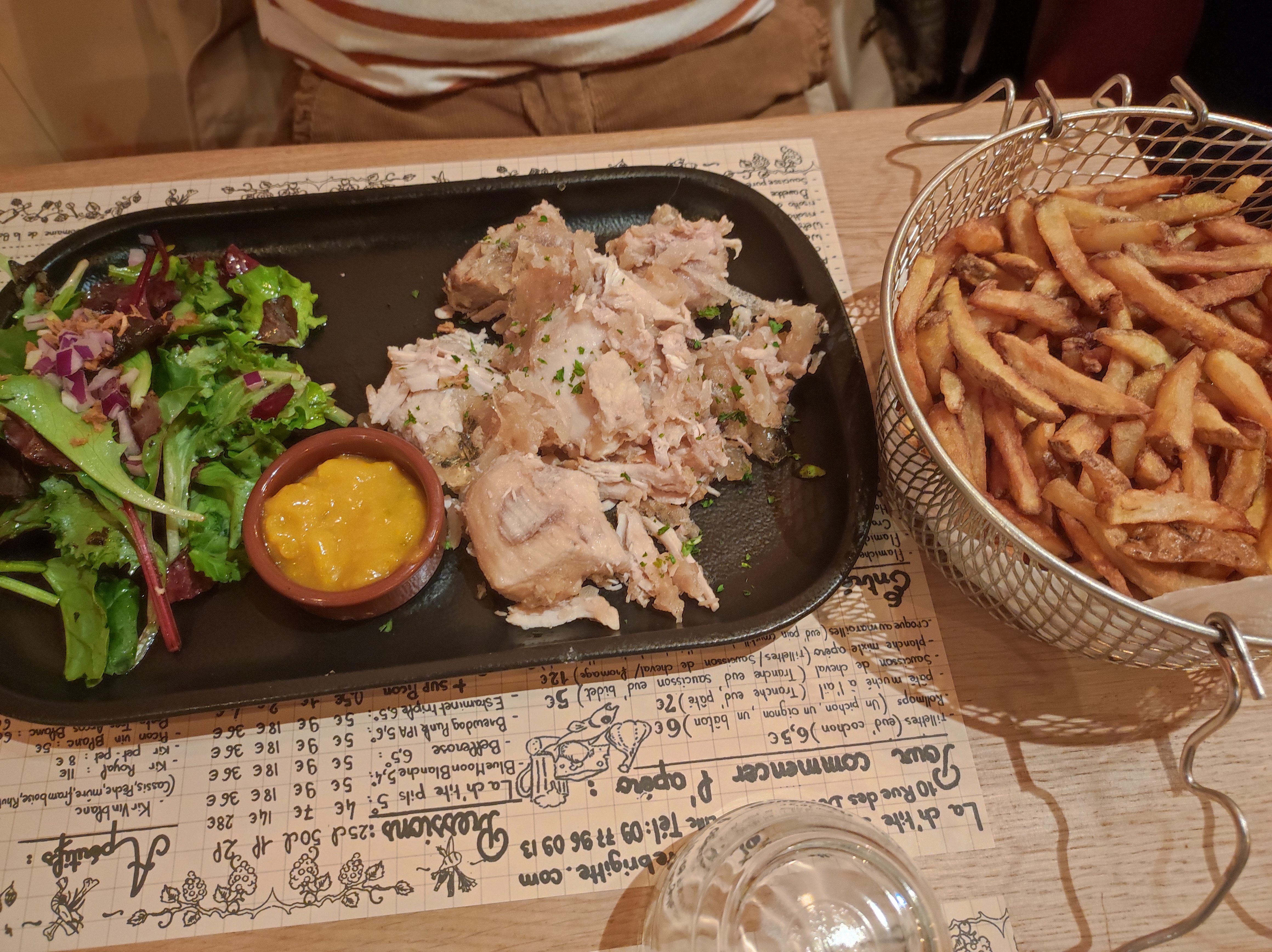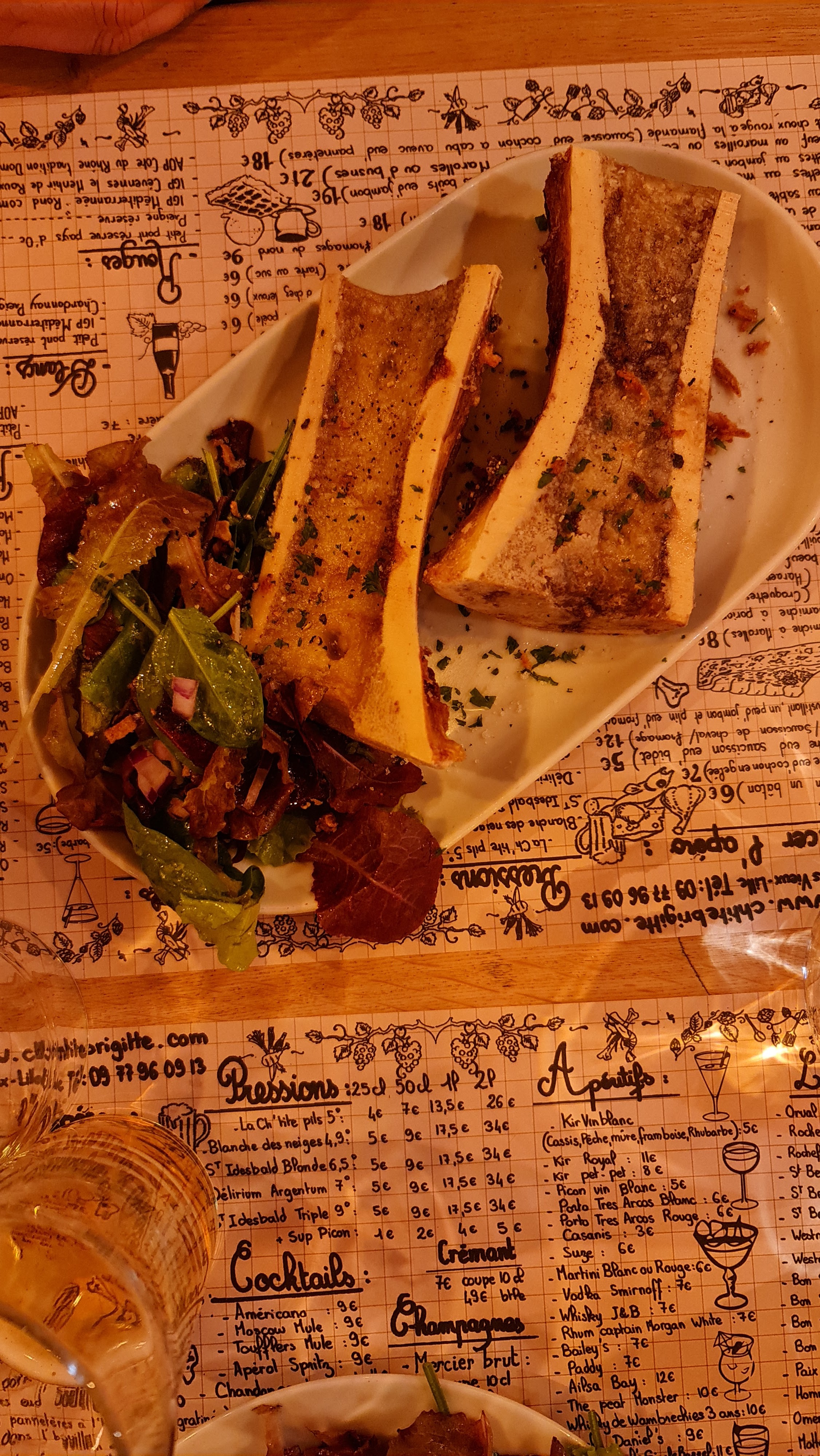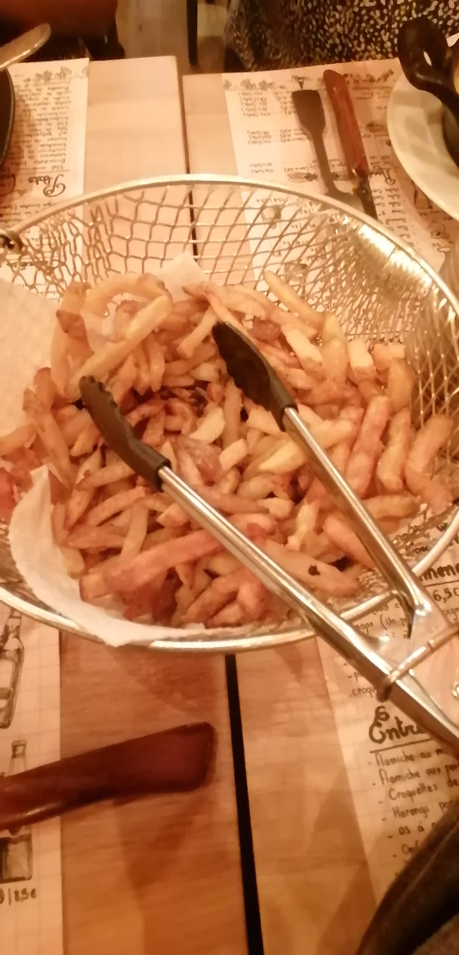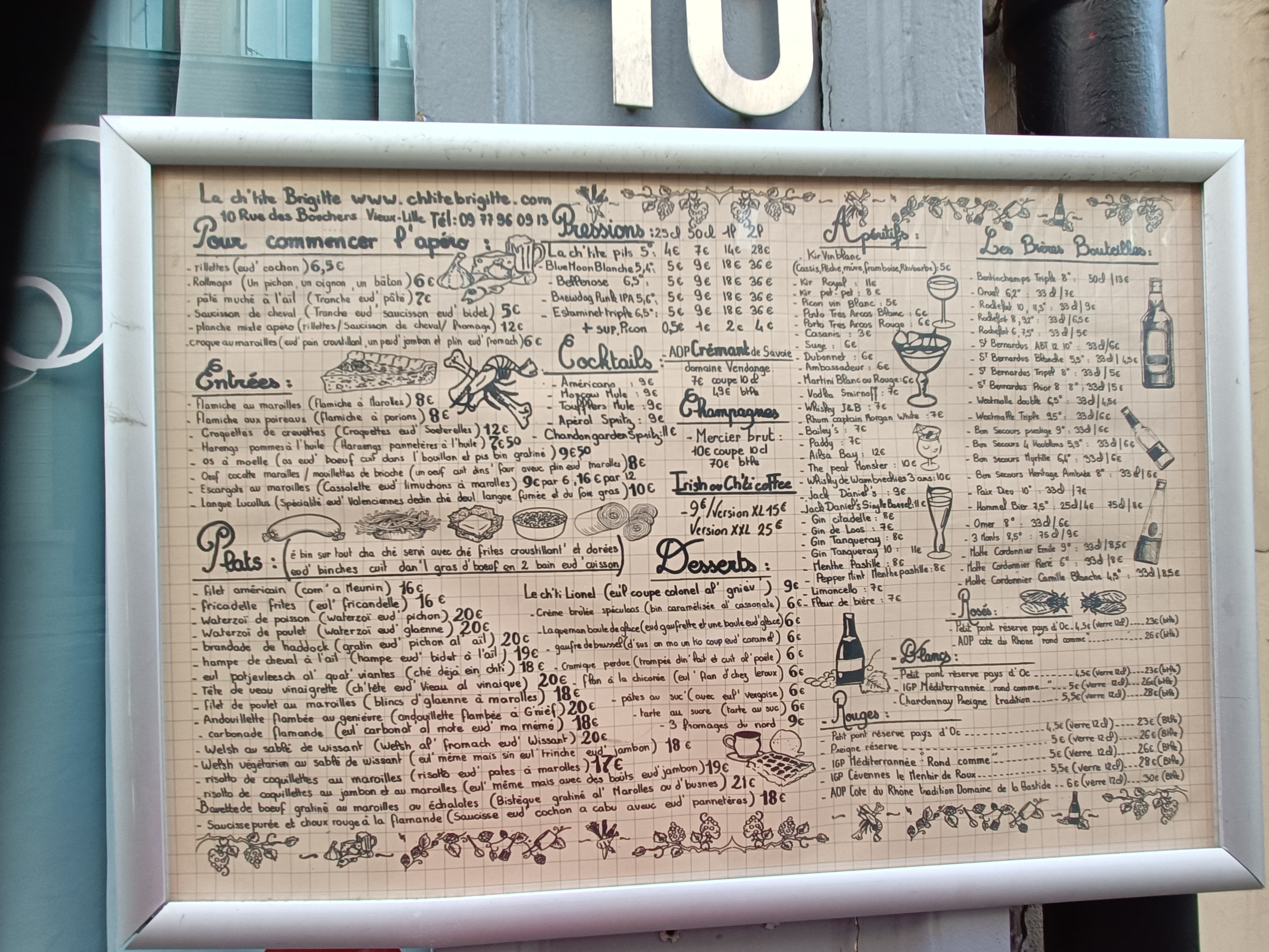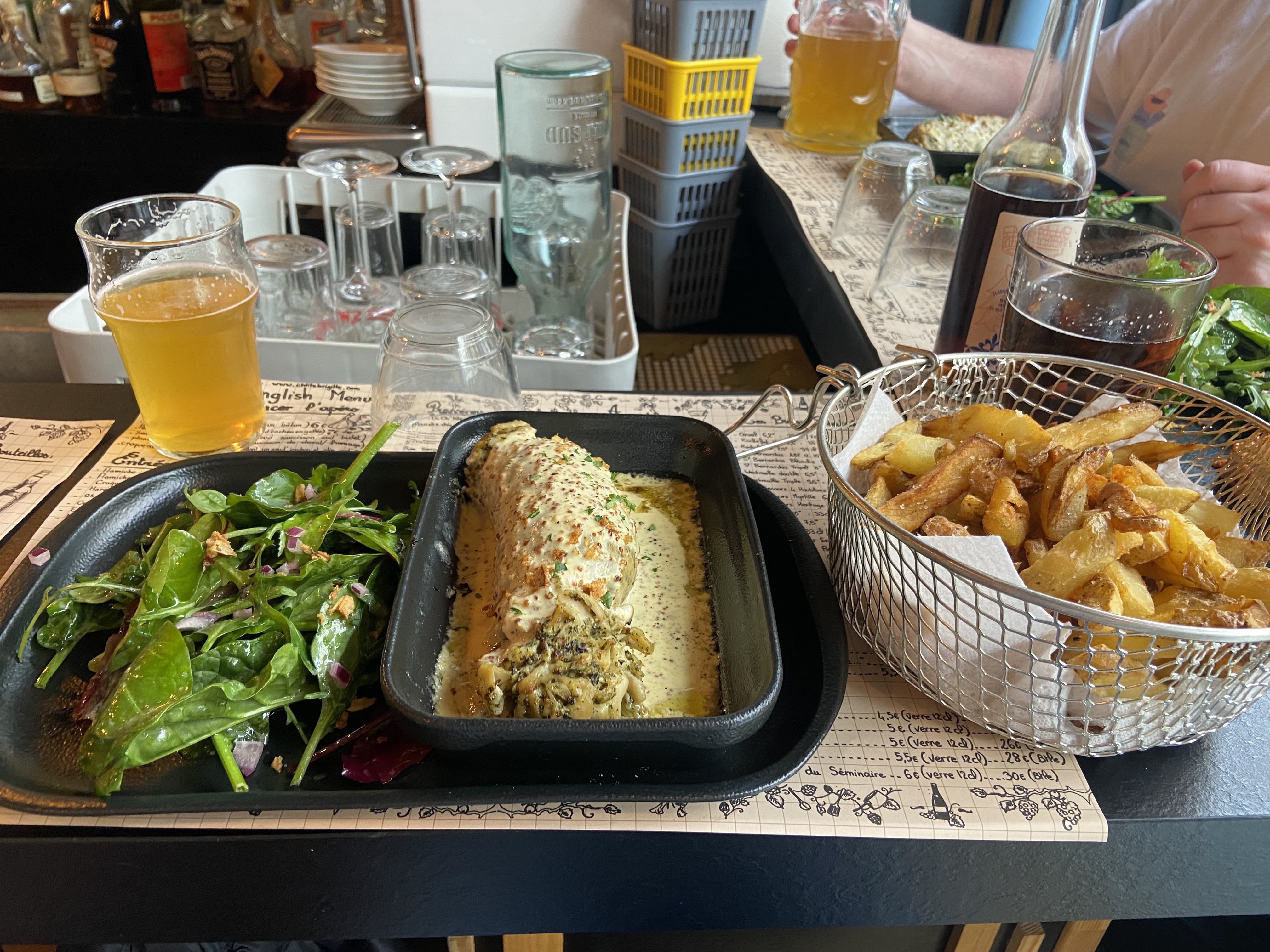 C’était ma 4e fois chez Ch’tite Brigitte (depuis leur ouverture il y a 1an) en ce samedi midi, et nous avons été très déçu, surtout pour un 2e service à partir de 14h. Nous étions au courant de l’espace restreint, mais là, nous avons vraiment eu l’impression de manger les uns sur les autres. (Serveurs qui cognent dans les coins de chaises lors du passage sans « pardon » ni « excusez-moi », passage aux toilettes quasi impossible). Les tables sont littéralement collées les unes sur les autres et pour aller aux toilettes vous devez dérangé les clients assis juste à coté.. Serveurs sympa mais service long, serveurs peu concentrés, j’ai demandé 2 fois pour une carafe d’eau, j’ai même dû aller au bar l’a demandée… serveuse qui se trompe de table et dépose la carafe à la table voisine… Niveau nourriture, le côté estaminet nous a vraiment plu, mais il y a des limites… Des frites très limites, on aurait dit plutôt le fond de la friteuse (photo a l’appuie). Enfin bon, je pense que c’est ma dernière fois dans ce restau. Bien que je l’ai beaucoup aimé à mes premières visites, là je pense qu’ils sont passés du côté quantité > qualité. C’est dommage !