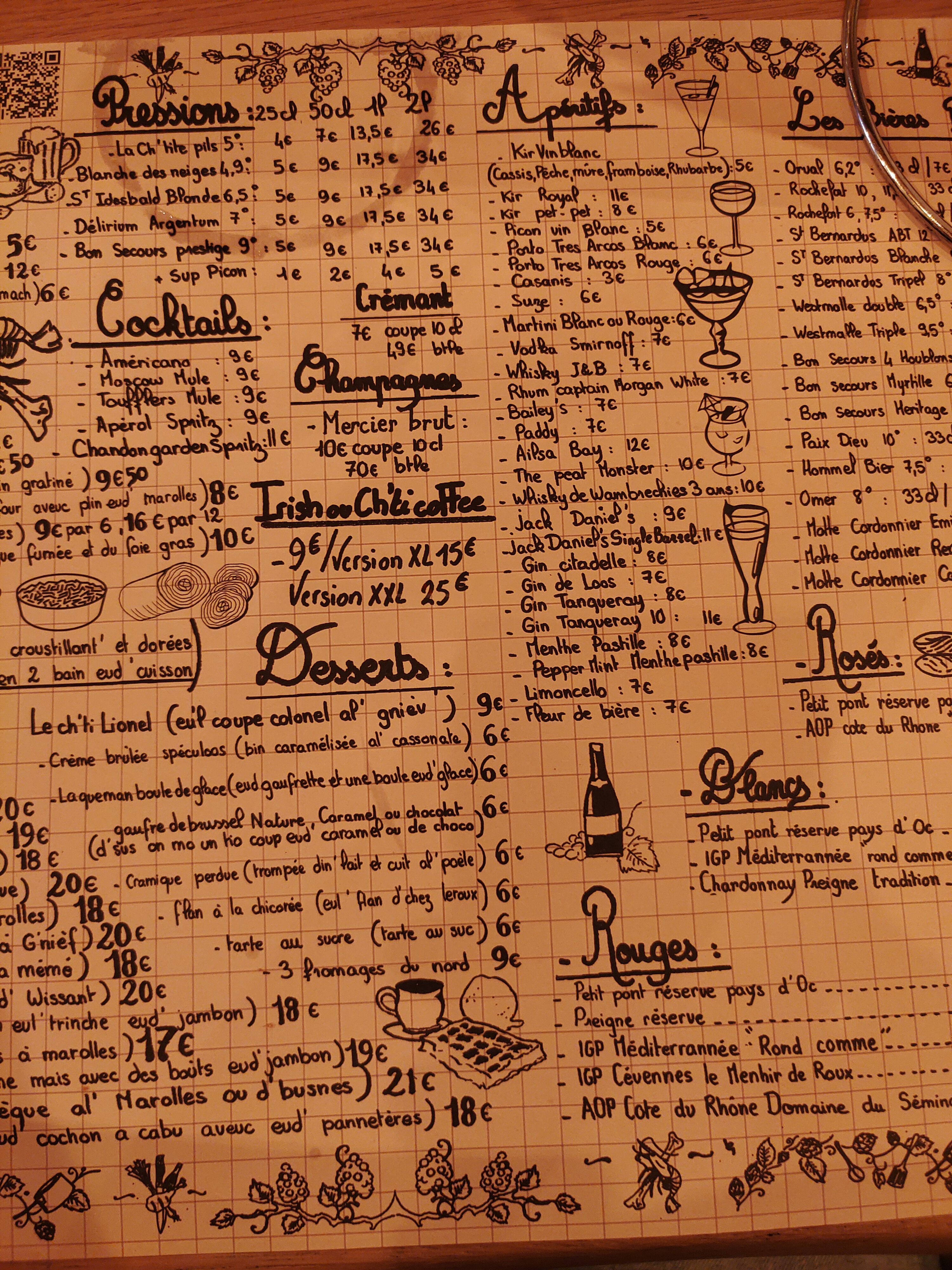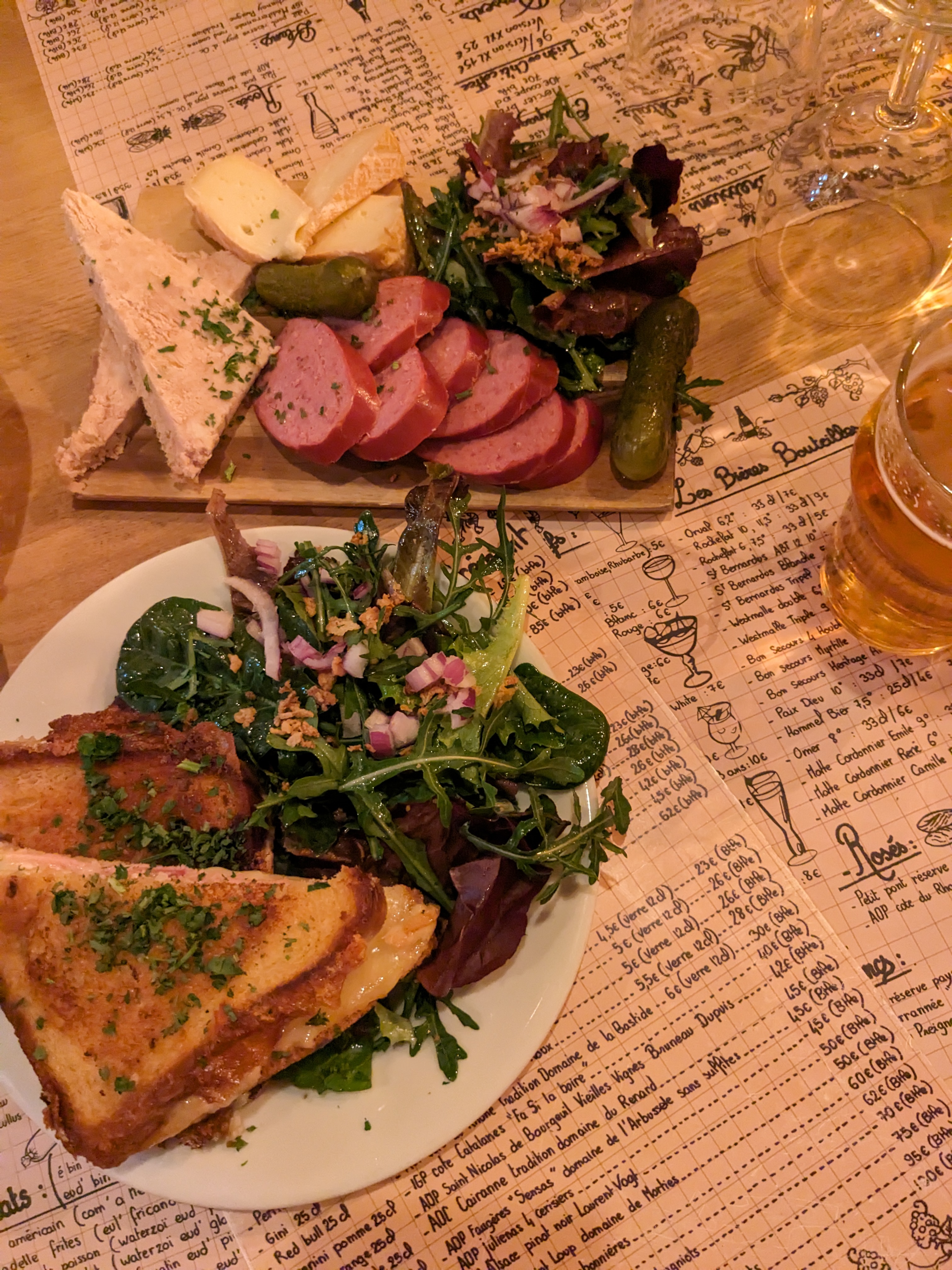 Tout est bon ! La bière Triple Bon secours prestige est amère comme j'aime. En entrée, le petit sablé lillois est très bien. L'os à moelle en entrée est délicieux ! C'est un bon endroit pour tester les croquettes aux crevettes mais si ce n'est pas ma came. Les frites sont exceptionnelles, le welsh au sablé de Wissant est très réconfortant. La cramique perdue avec le café sont parfaits pour finir. L'ambiance est géniale ! Les serveurs, la musique et la déco sont de bonne humeur ! À tester la prochaine fois : croque aux maroilles, oeuf cocottes maroilles et une recommandation des serveurs. Le flan à la chicorée pour le goûter serait idéal.