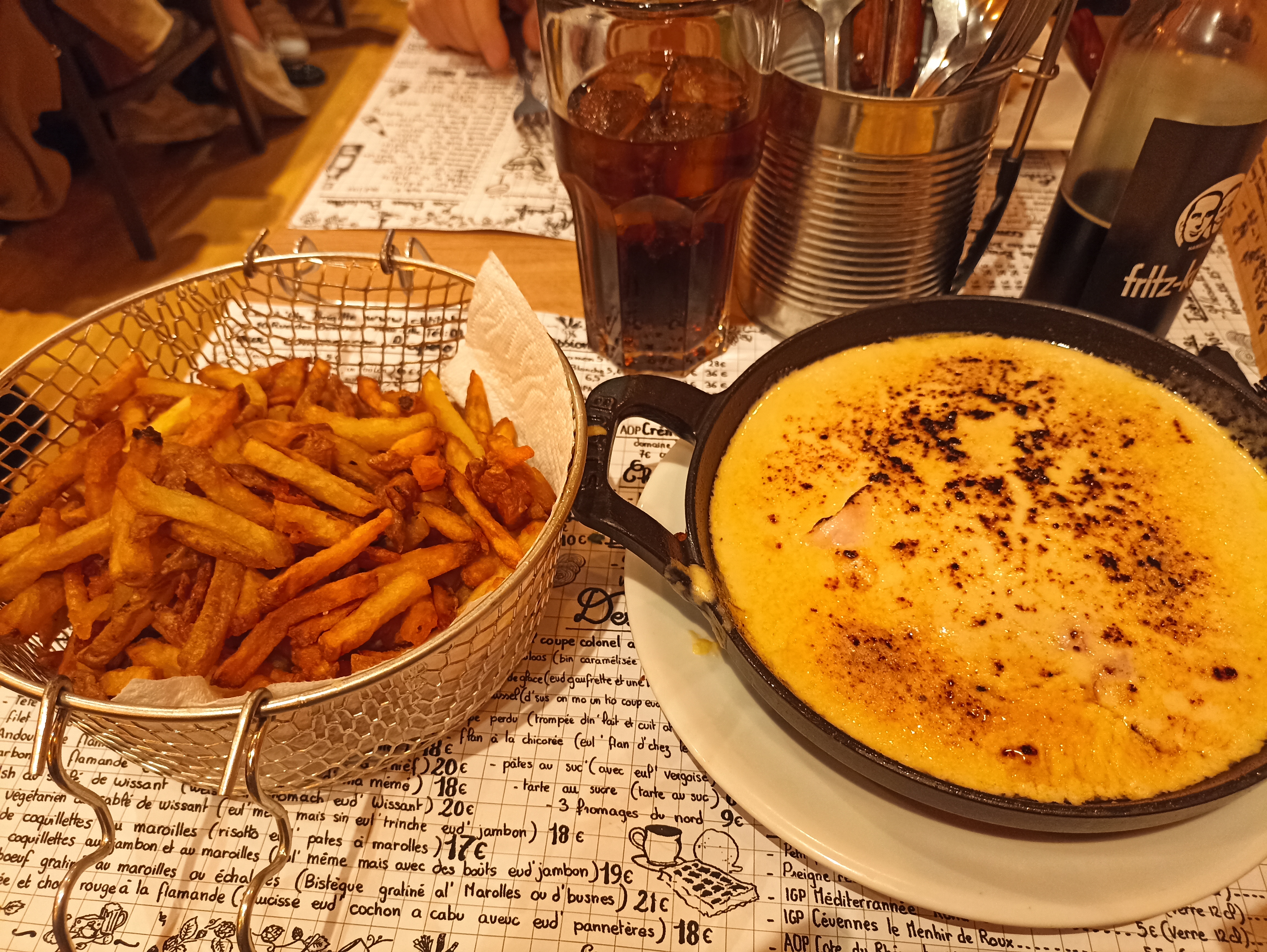Les plats sont typique du nord de la France, les plats sont copieux mais reste suffisamment fins pour pouvoir profiter d'un dessert. Attention il ne faut pas avoir peur du maroille ;) le service est rapide et les serveurs agréables et à l'écoute. Je conseille fortement les frittes qui sont juste délicieuses (et à volonté). Je recommande fortement !!!