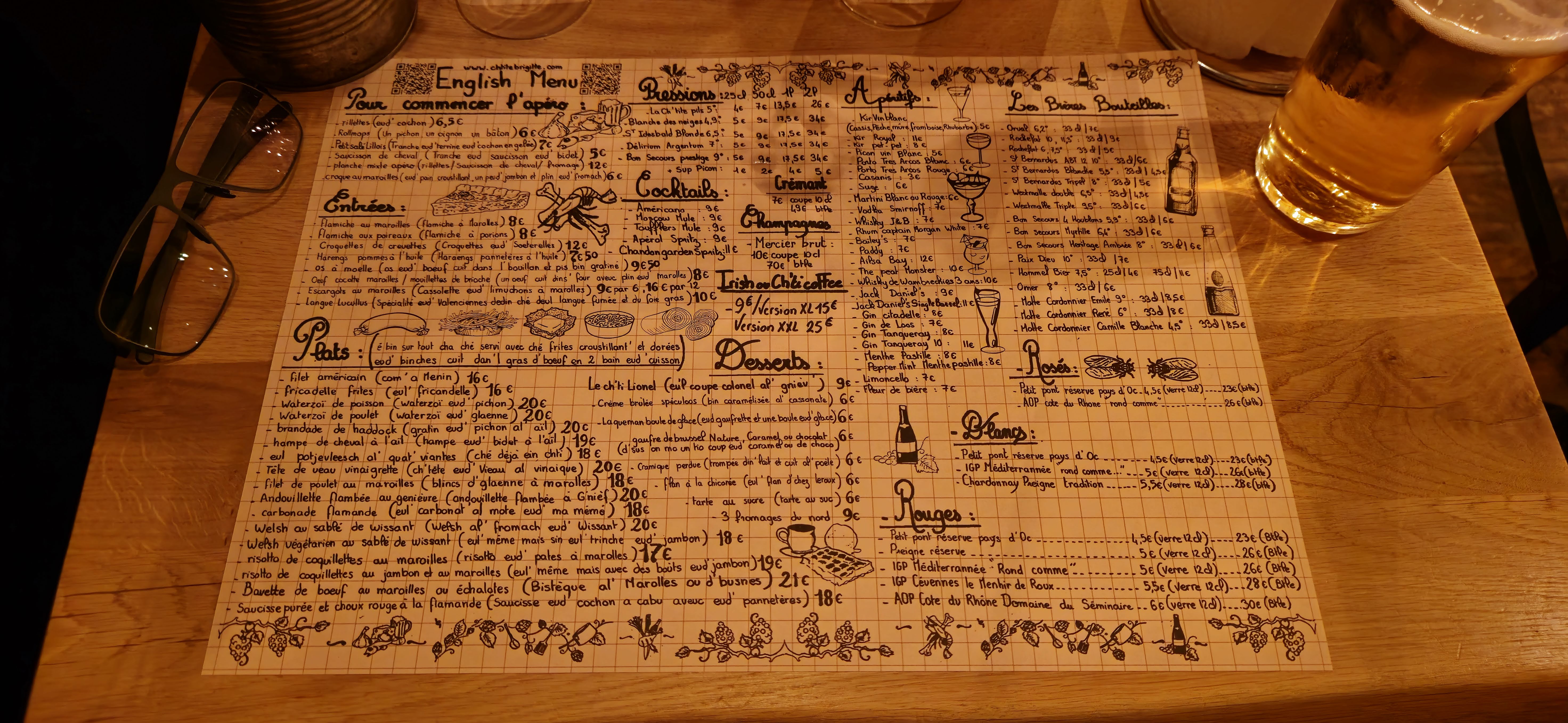 Assez déçus de cette adresse, en particulier par la cuisine : - welsh : bon mais rien d'exceptionnel . Frites complètement molles, vraiment pas terribles. On en a gouté des bien meilleures au pays de la frite - saucisse purée chou rouge : ça arrache le nez ! Le chou rouge pique beaucoup trop le vinaigre, et la purée/saucisse beigne dans une sauce à la moutarde qui arrache. Nous n'avons pas réussi à finir tellement ça piquait le nez. Dommage l'idée initiale était bonne. L'équipe est très sympa, mais restaurant un peu étouffant, on ne respire pas. Par contre on adore la carte avec des petites précisions écrites avec l'accent chtit... on se marre !