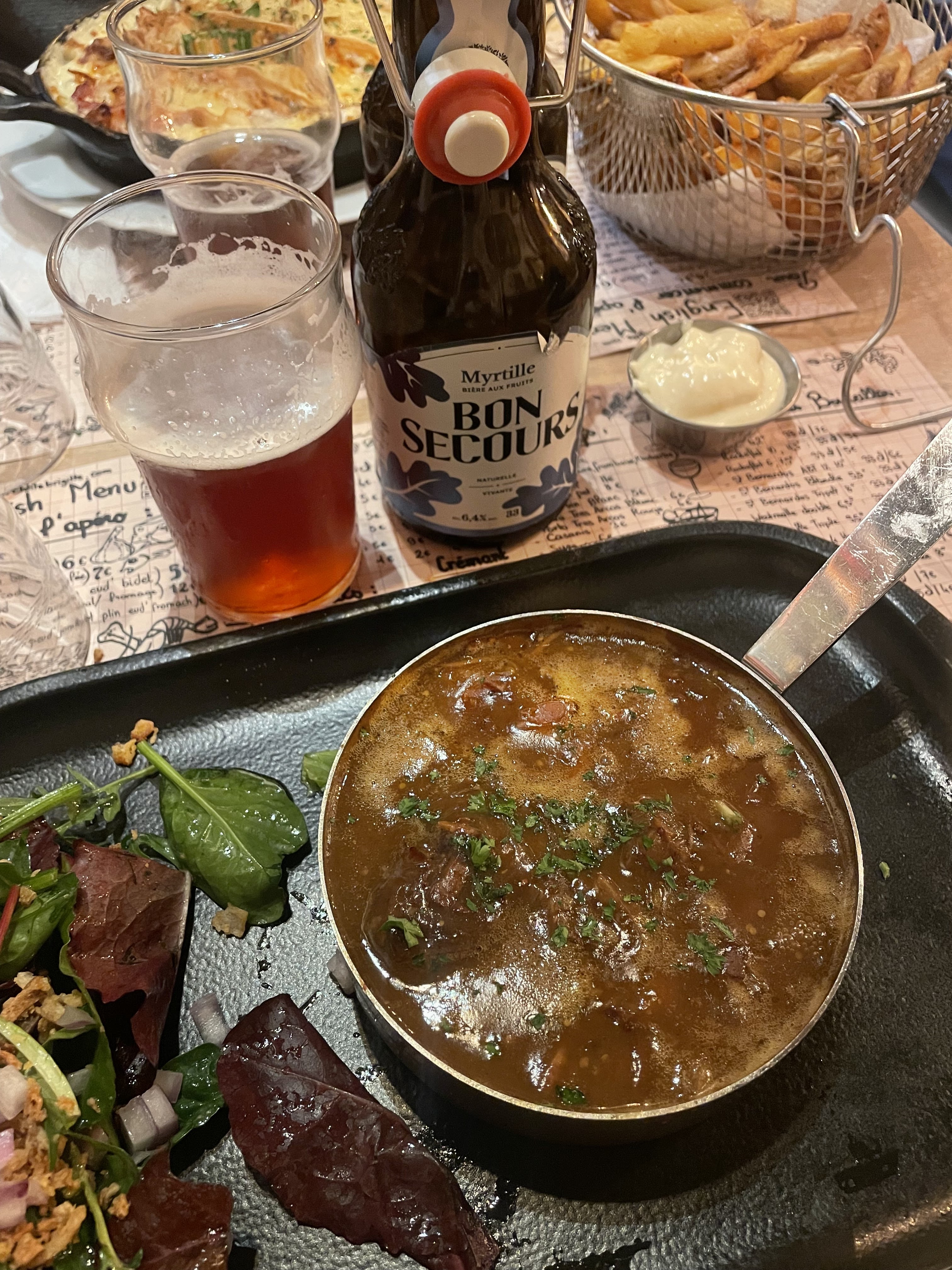 J'ai adoré cet endroit ! Nourriture délicieuse, pleine de saveurs et de portions de grande taille (même des frites à volonté !). Nous avons eu le poulet à la sauce aux morilles qui était riche et débordant de saveur sans être trop puissant et le ragoût de bœuf qui était un plat bien équilibré avec des morceaux de bœuf moelleux qui fondaient dans la bouche et une riche sauce à l'oignon. Le service était impeccable et très rapide, le personnel était extrêmement sympathique et serviable toute la nuit. Quand je serai de retour en ville, j'y retournerai certainement. Ambiance vraiment amusante et cela semblait se remplir assez vite, alors je vous suggère d'essayer de réserver une table pour être sûr d'entrer !!