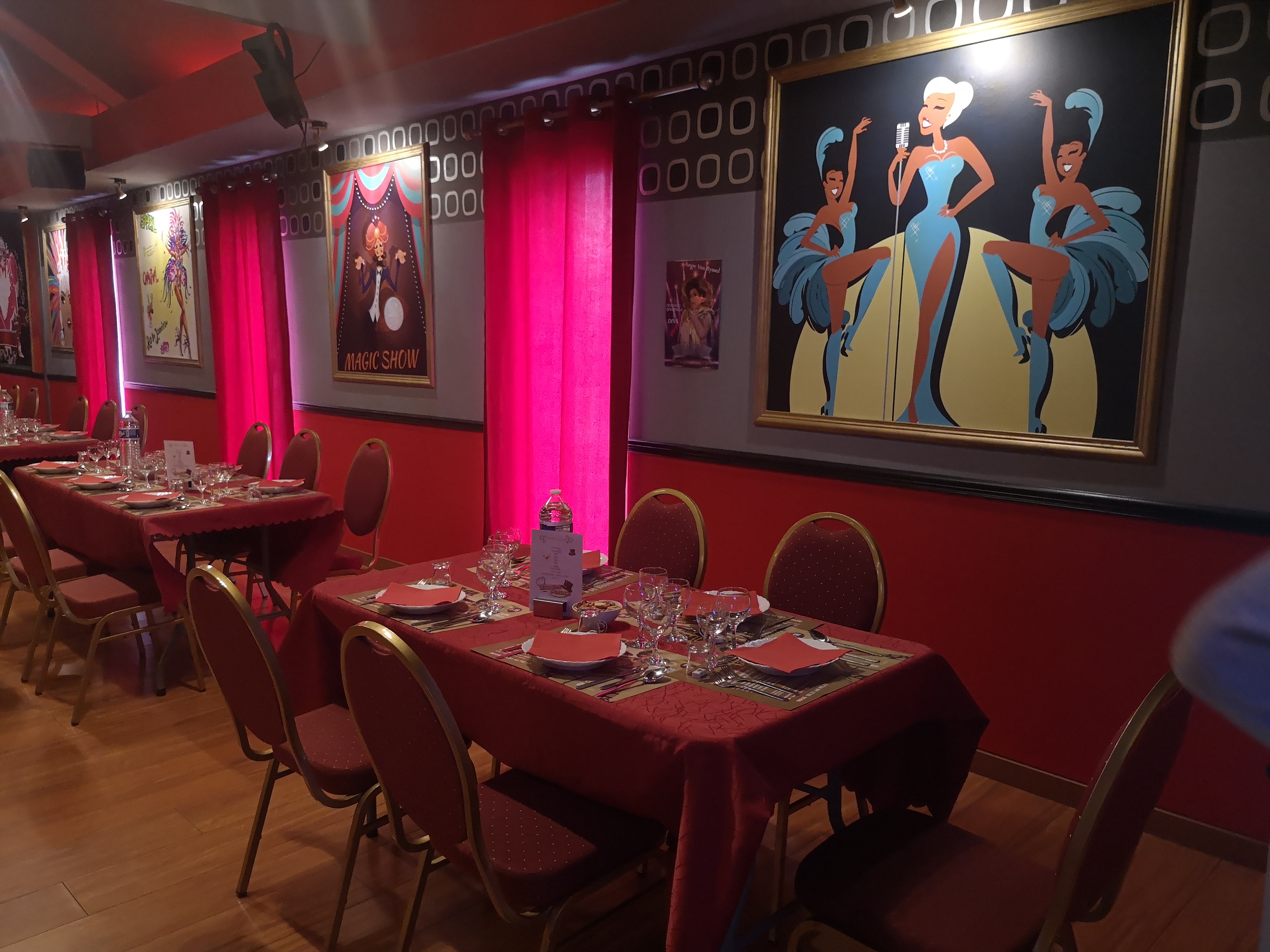 Je souhaite avant tout remercier fortement les patrons de l'établissement, ainsi que les cuisiniers, les serveurs, mais aussi les intermittents, pour leurs accueils fort sympathique, leurs attentions répétées et leurs savoir faire indiscutables. On a était reçu comme des rois, le personnel étant aux petits soins. Le plus impressionnant c'est le naturel qui en découle. Merci de nous rappeler que le service, l'accueil et la sympathie ne sont pas des valeurs de travail mais plutôt des valeurs humaines. Les spectacles proposés sont finalement à la carte car il s'adapte en permanence aux besoins des clients (plus de danse ou plus de spectacles par exemple). Le repas est correct et suffisant. Vraiment pour les personnes, individuels ou en groupe, n'hésitez pas à aller sur leurs sites pour réserver une table et profitez du spectacle, vous ne serez pas déçu. Transformismes, danse, sketch avec imitation, chants, il y en a pour tout les goûts. Bravo et à bientôt.