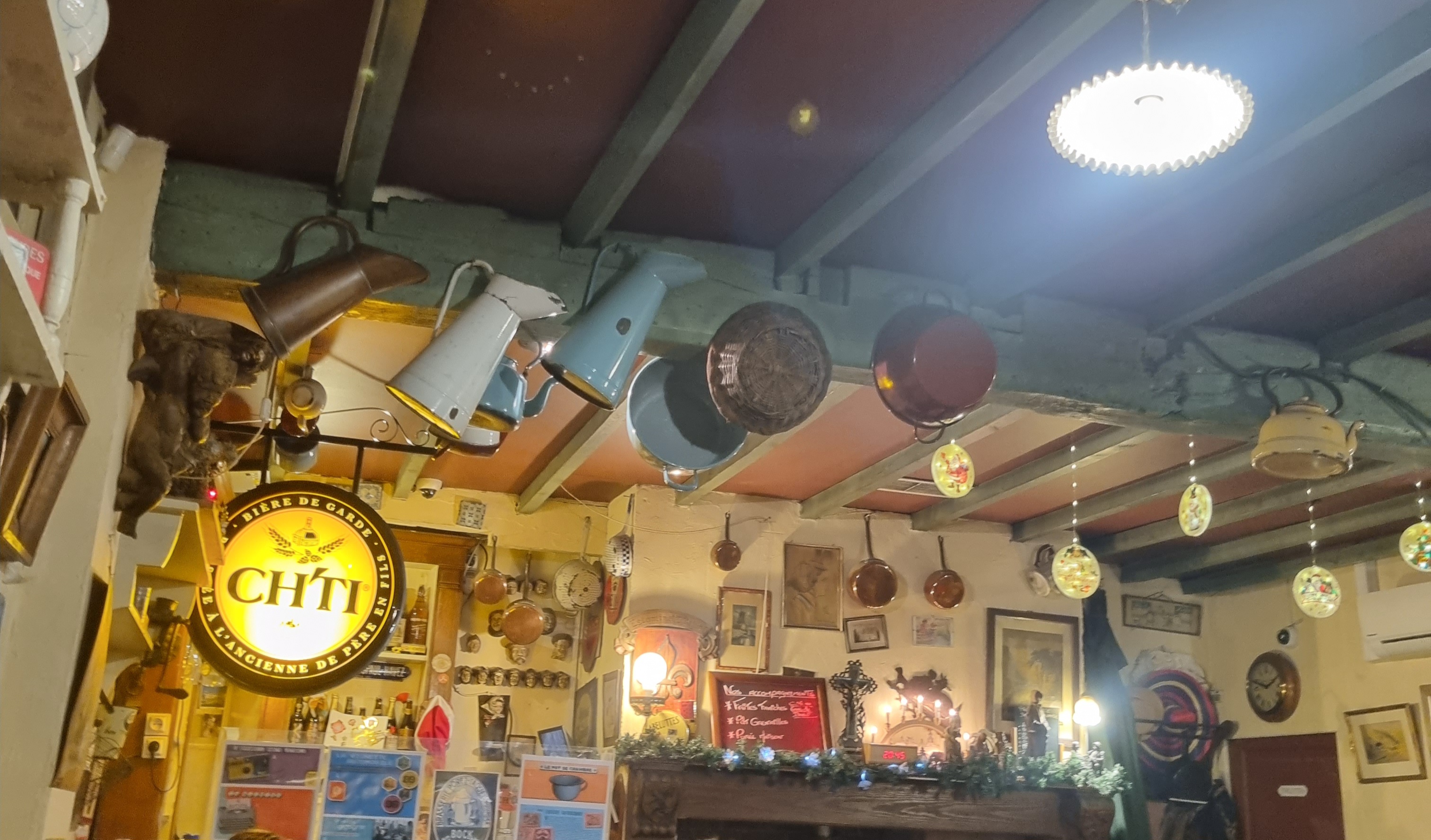 ❝ Cuisine flamande et bières régionales dans un cadre rustique avec casseroles au plafond et tableaux aux murs. ❞