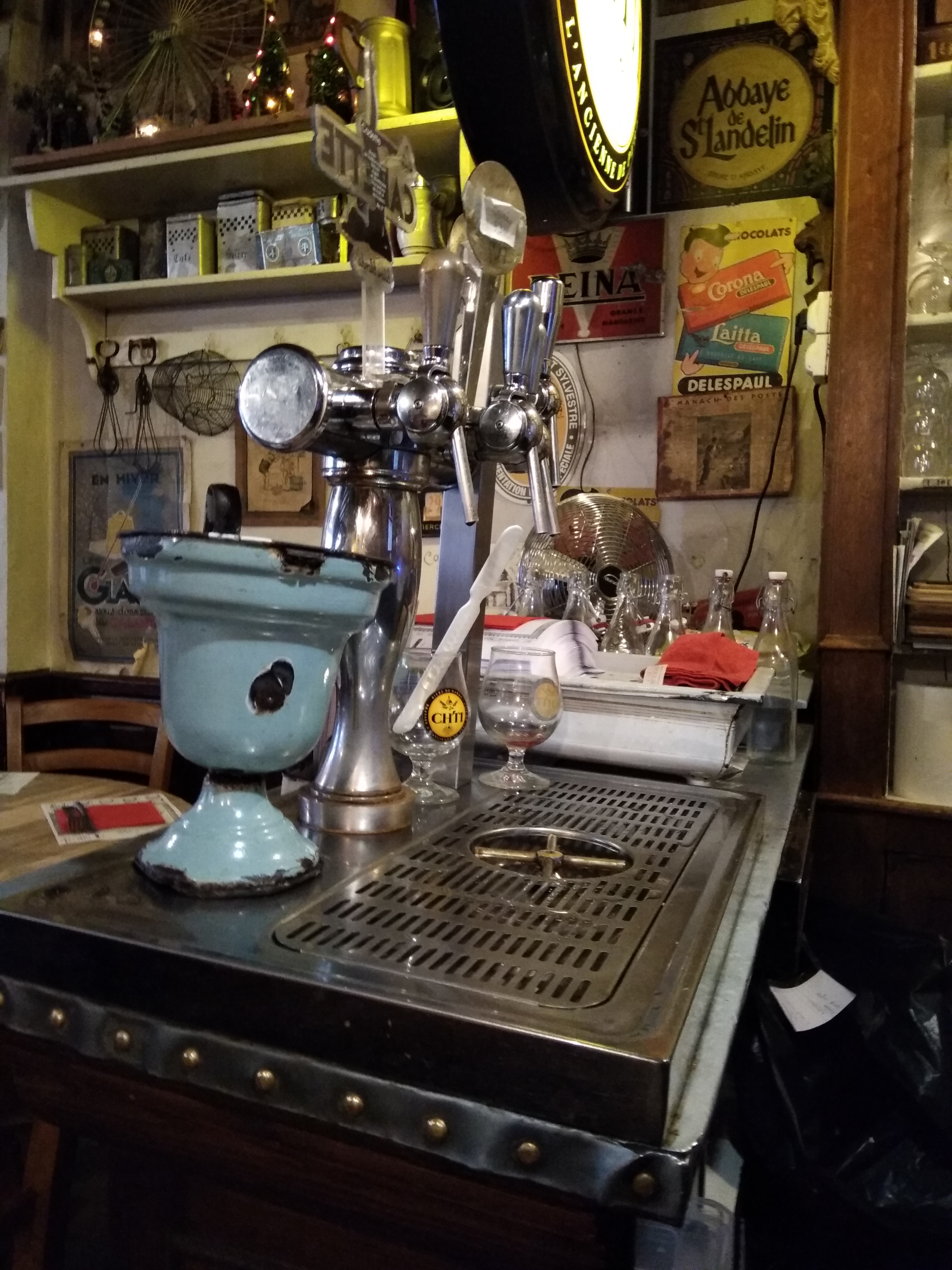 J'ai été déçu dans l'ensemble. Même si le cadre rappelle les estaminets de la campagne Flamande (avec ses vieilles tables, les chaises dépareillées et la brocante accrochée aux murs), la cuisine n'était pas au diapason. Le potjevleesch était bien trop vinaigré ( les légumes avaient le goût de pickles ) et les viandes étaient dures. Les frites valaient le coup. La bière pression manquait de fraîcheur. J'ai pris un café gourmand permettant de se faire une idée de la qualité des desserts. J'ai apprécié la glace à la violette et la crème brûlée. Moins le chti'ramisu. Bref, je ne garderai pas un souvenir impérissable de cette soirée. Peut être qu'en ayant choisi un autre plat, mon avis aurait été différent mais je ne tenterai pas ma chance 🙂