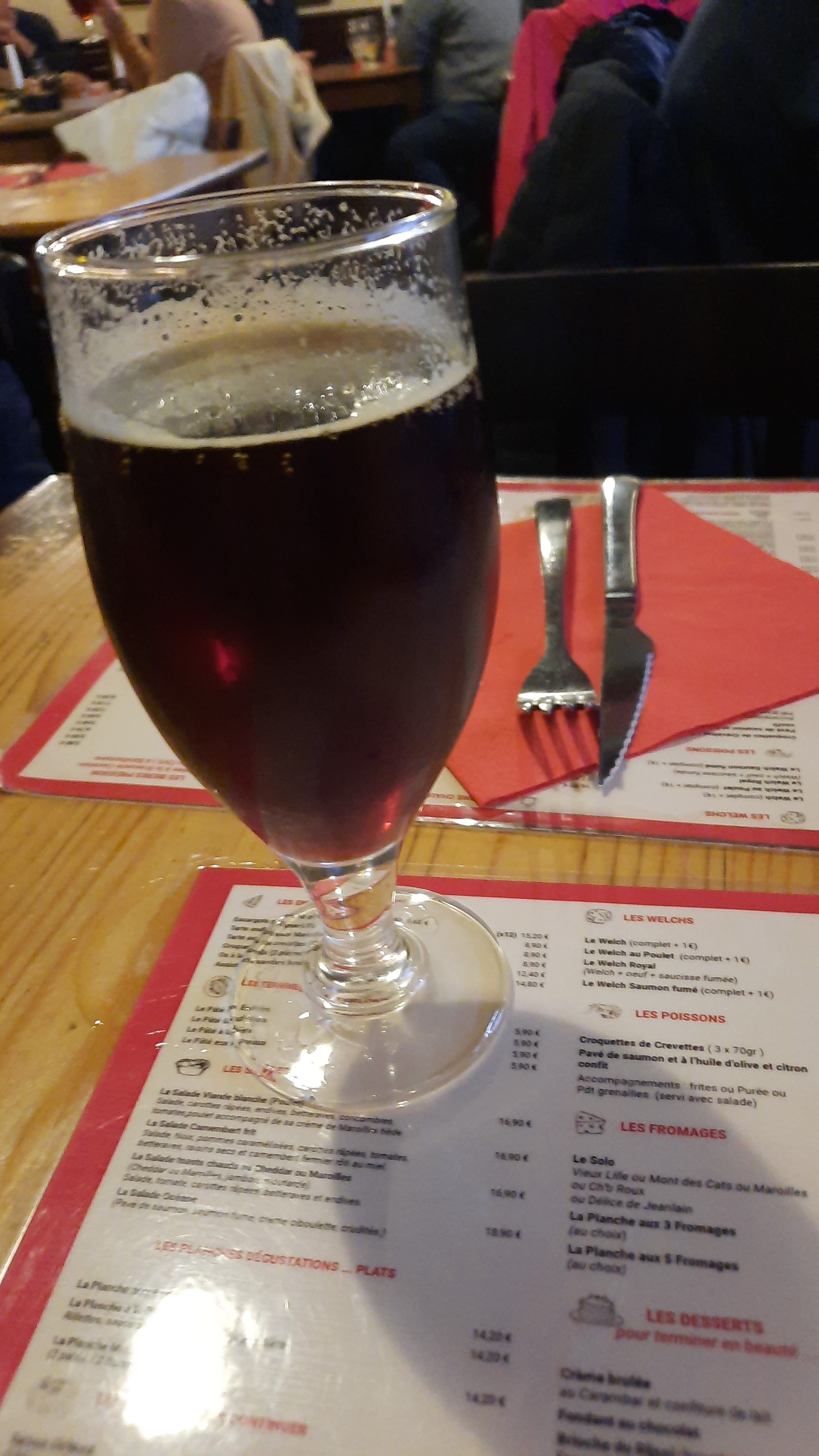 Nous sommes venus dîner un soir pendant un week-end à Lille. Le restaurant était plein mais nous n'avons pas eu à attendre longtemps. La décoration est très sympa. Par contre attention aux grands, j'avais les genoux qui touchaient la table. Nous avons demandé des renseignements sur les plats. Mais la serveuse ne savait pas nous répondre. En entrées nous avons pris, une flamiche au poireau et du pâté aux pommes. La flamiche était finalement une tarte aux poireau, mais plutôt bonne. Et le pâté aux pommes n'en avait que le nom. Pour les plats nous avons pris, un trio de spécialités et une andouillette au maroille. Les spécialités étaient bonnes, surtout le welsh que j'ai découvert. L'andouillette était correct, mais celle de Troyes est meilleur. Nous n'avons pas commandé de dessert et nous en sommes resté là.