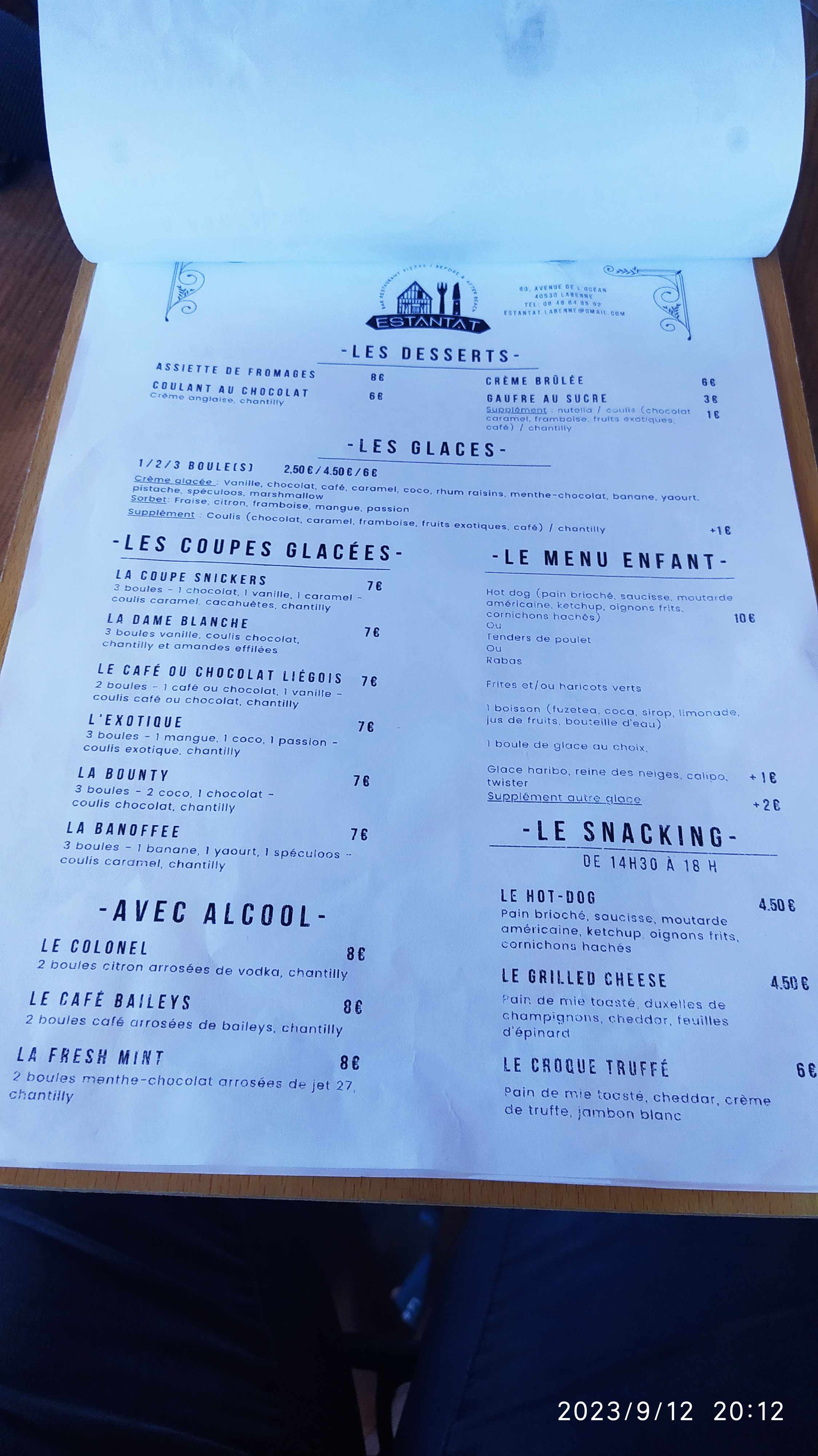 J'ai passé une semaine a Labenne avec mes deux ados .nous avons découvert le restaurant ESTANTAT Mon fils et devenue accro au coulant au chocolat, moi qui suis fada des glaces j'ai été gâté et vraiment faut tester la coupe snikers 😋😋 et les moules au xipister une tuerie .des frites maisons .un restaurant dans un camping mais un vrai restaurant qui vaut d'être connu avec de bons produits . Bonne continuation à toute l'équipe .