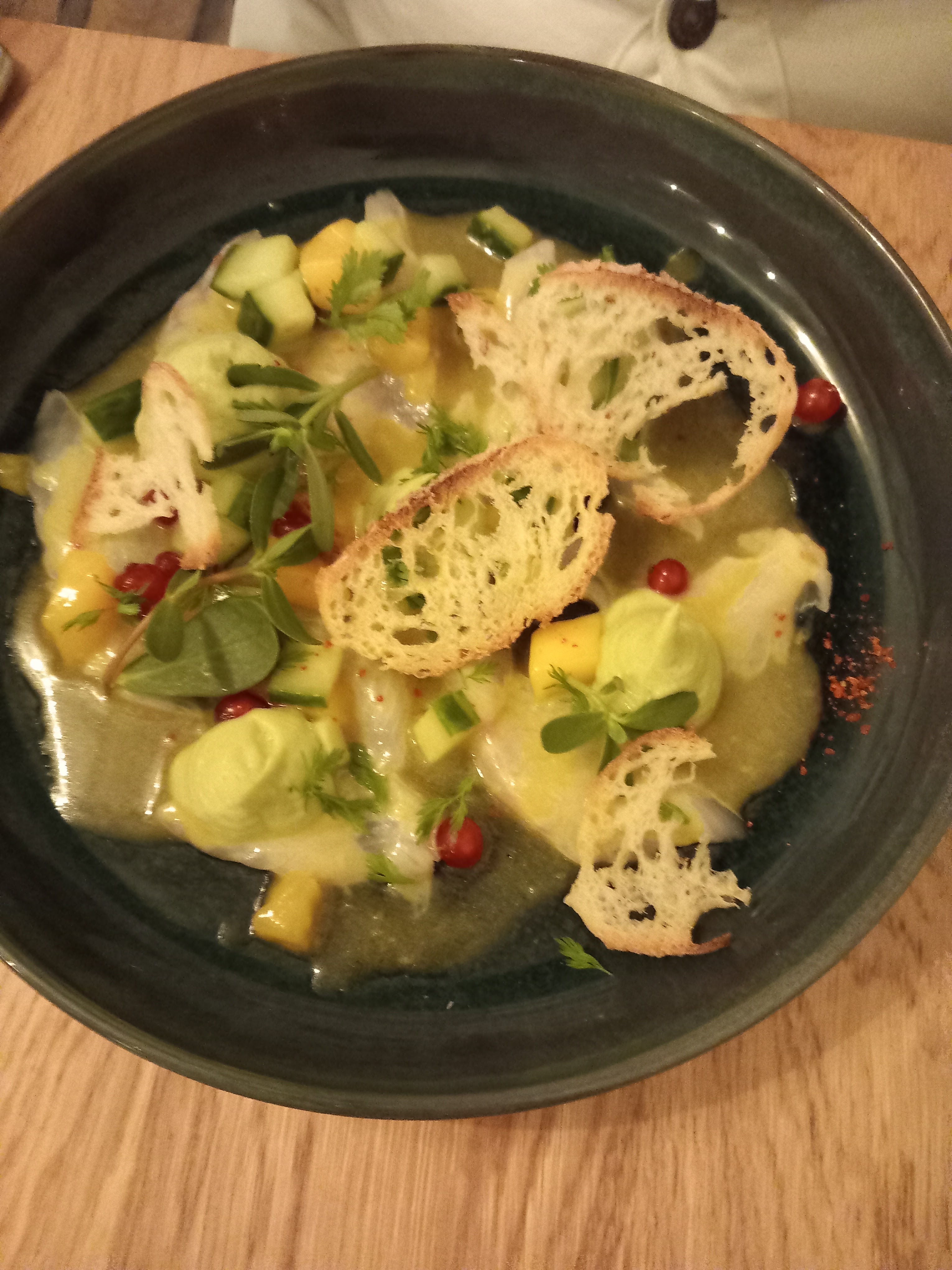 Cadre chaleureux, musique d'ambiance, décor chic dans les tons bleus-bois, service agréable, petite vue sur les cuisines sympathique de là où j'étais (voir la préparation millimétrée des plats est ma foi, satisfaisant), plats de présentation raffinée, plat de résistance excellentissime, néanmoins un brin déçu sur le dessert trop peu sucré à mon goût mais sinon, très bonne adresse, je recommande 🤗