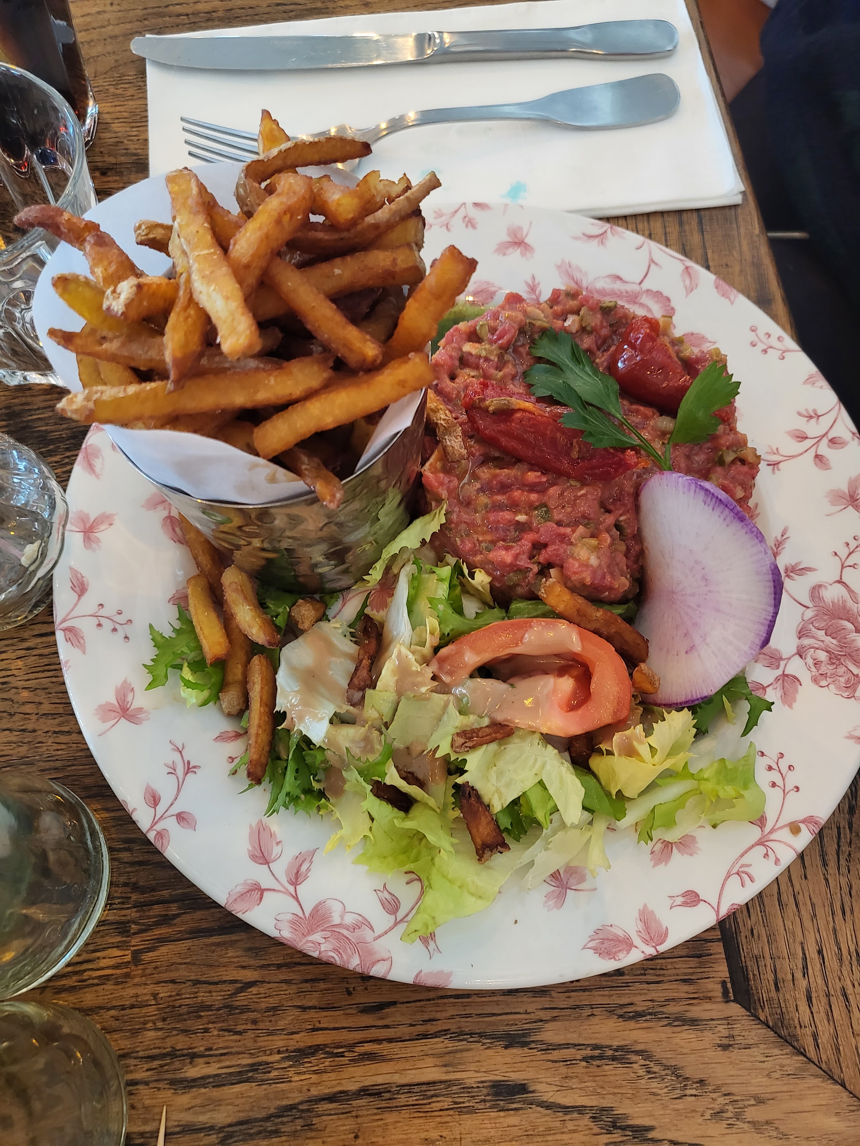 Une brasserie avec de la nourriture en grandes portions. La serveuse était gentille, leur tartare bon, et s’asseoir sur la terrasse pendant la journée en octobre une joie, mais ce n’était pas sympa quand ils ont dit qu’ils n’avaient plus de pâtes (comme solution végétarienne - ils n’ont qu’un seul repas végétarien sinon) et pendant que nous partions il y avait un client qui mangeait des pâtes.