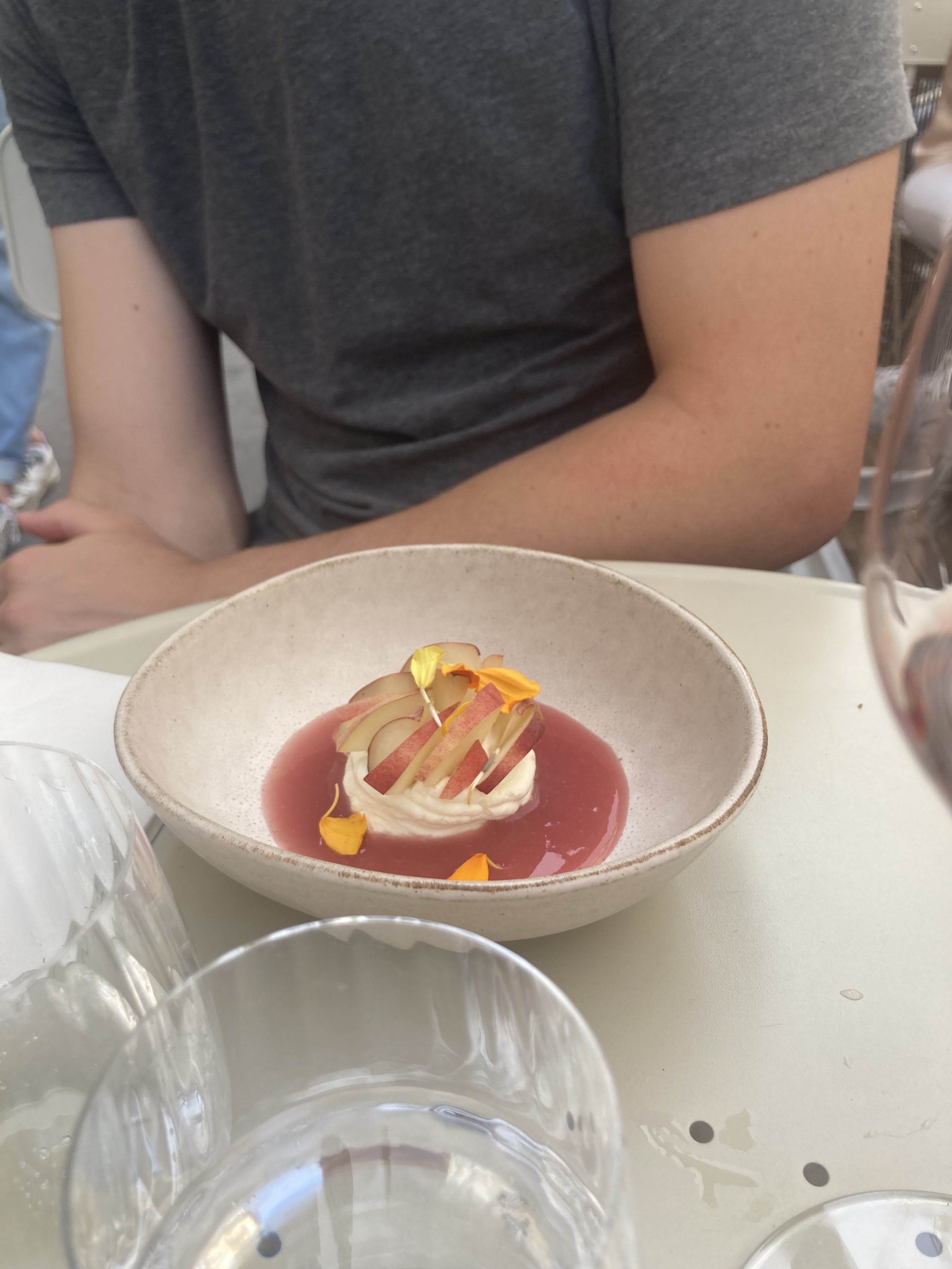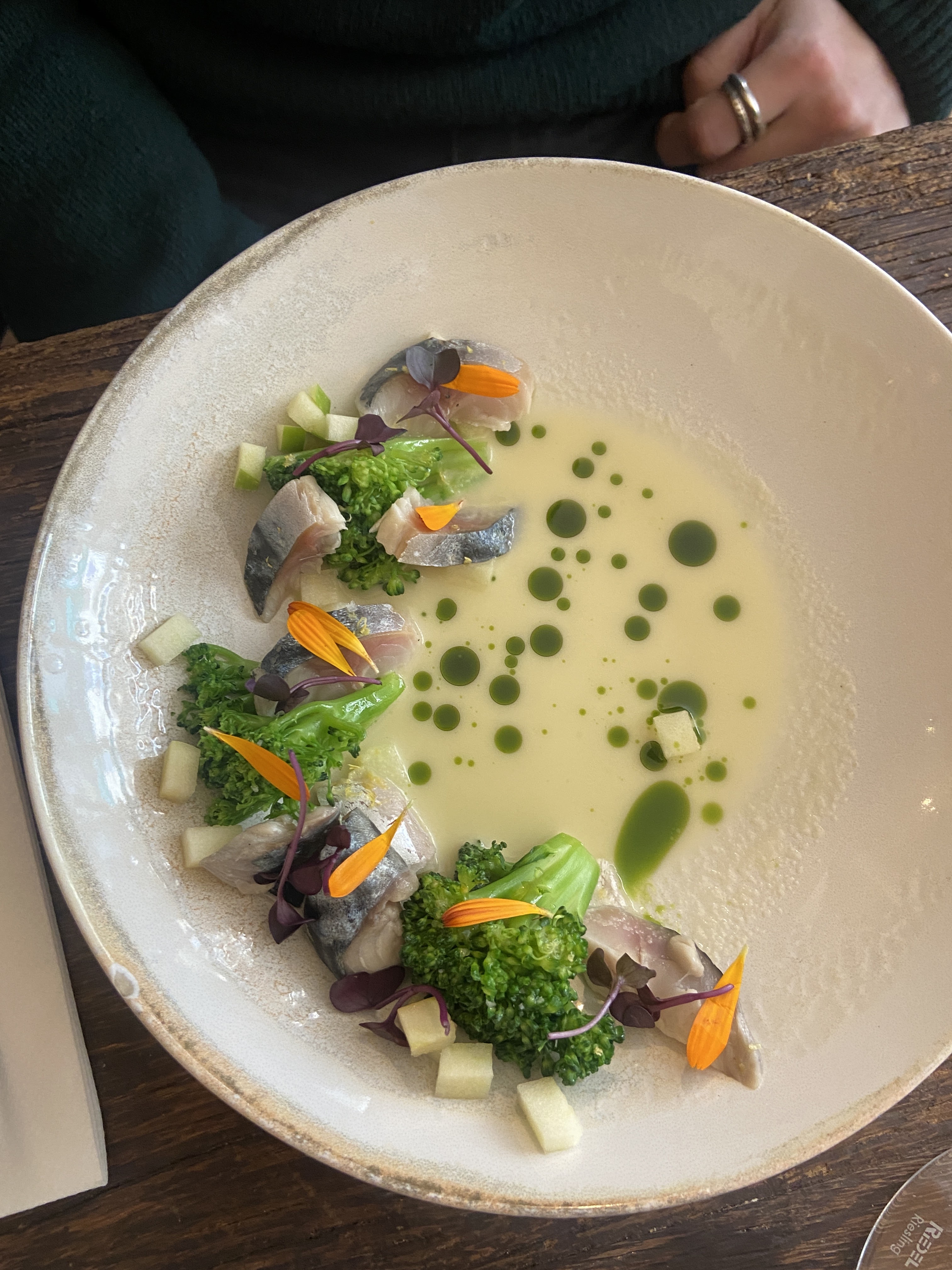 Je suis venu ici avec un ami pour le déjeuner. Dans l'ensemble, la nourriture était plutôt bonne. Un plat en particulier, une entrée aux petits pois frais, était excellent. Les plats principaux (nous avons commandé du poisson avec des variantes de carottes) étaient bons, mais pas mémorables. Le principal problème était le temps qu'il fallait pour obtenir notre nourriture. Nous étions l'une des premières tables et nous n'étions que deux, mais nous avons dû attendre extrêmement longtemps pour avoir notre nourriture. J'ai également commandé un verre de vin et le service était loin d'être généreux comparé aux verres des tables voisines. Donc, même si je vois que le chef est talentueux et qu'on peut bien manger ici, nous avons été déçus et l'expérience et la nourriture ne valaient pas les 100 euros que nous avons payés.