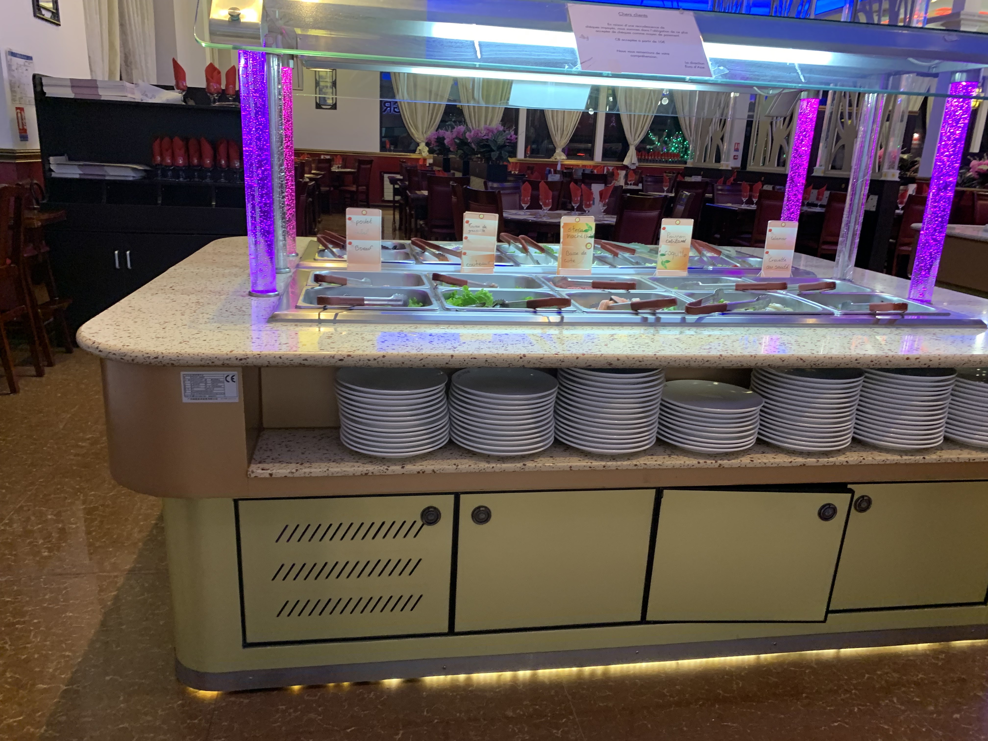 Personnel pas très aimable qui ne sourit même pas, qui tourne au milieu des tables et débarrassent sans même demander si c’est fini ou non, quitte à prendre des assiettes ou coupelles encore un peu remplies. Produits loins d’être frais, voire même douteux pour certains. Buffet qui se renouvèle trop lentement. Qualité prix loin d’être top. A fuir!!!