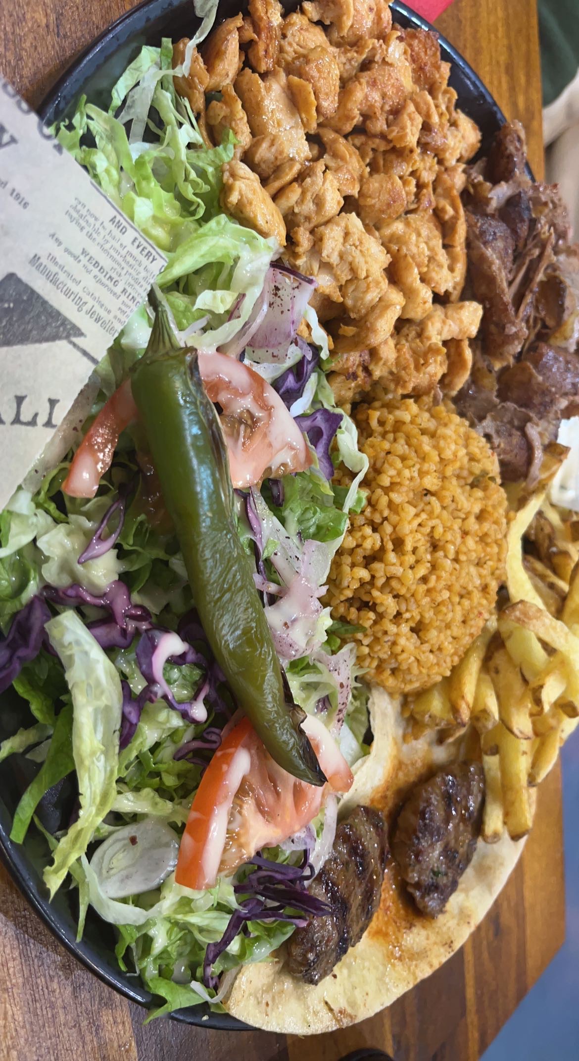 Bonjour à tous alors j’ai entendu parler de cette endroit et comme bon curieux j’ai étais manger je trouve l’endroit assez jolie les prix un peut l’élève mais bon maintenant tous et élever niveau prix donc de plus la qualité du pain et très bien j’ai adorer leur pain maintenant j’ai pris une assiette mixte je les trouver pas assez complète plus de salade que de viande et il t’avais que 3 sorte de viande kebab kefta et chiken frite blé un peut déçu pour l’assiette mais en général à faire quand même pour tester