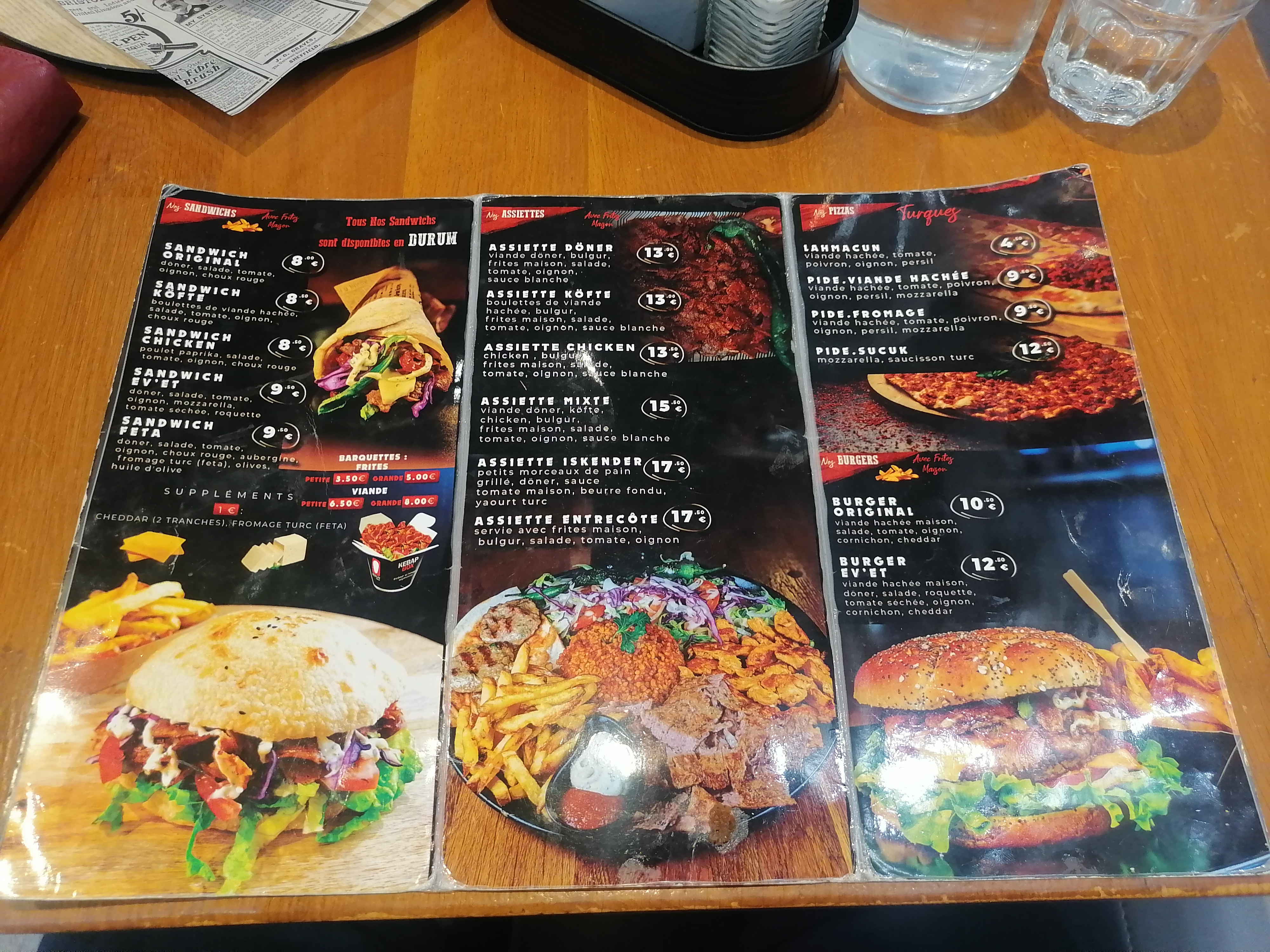 On a très bien mangé. Tout étaient nickel ! Pizza turc, grec ,...super. Les prix sont certes un peu élevé mais la qualité ça se paye , LOGIQUE ! Même le lendemains j'ai réchauffé ce qu'il restait et toujours aussi délicieux. Et oui Florian on air un grand merci😉😉