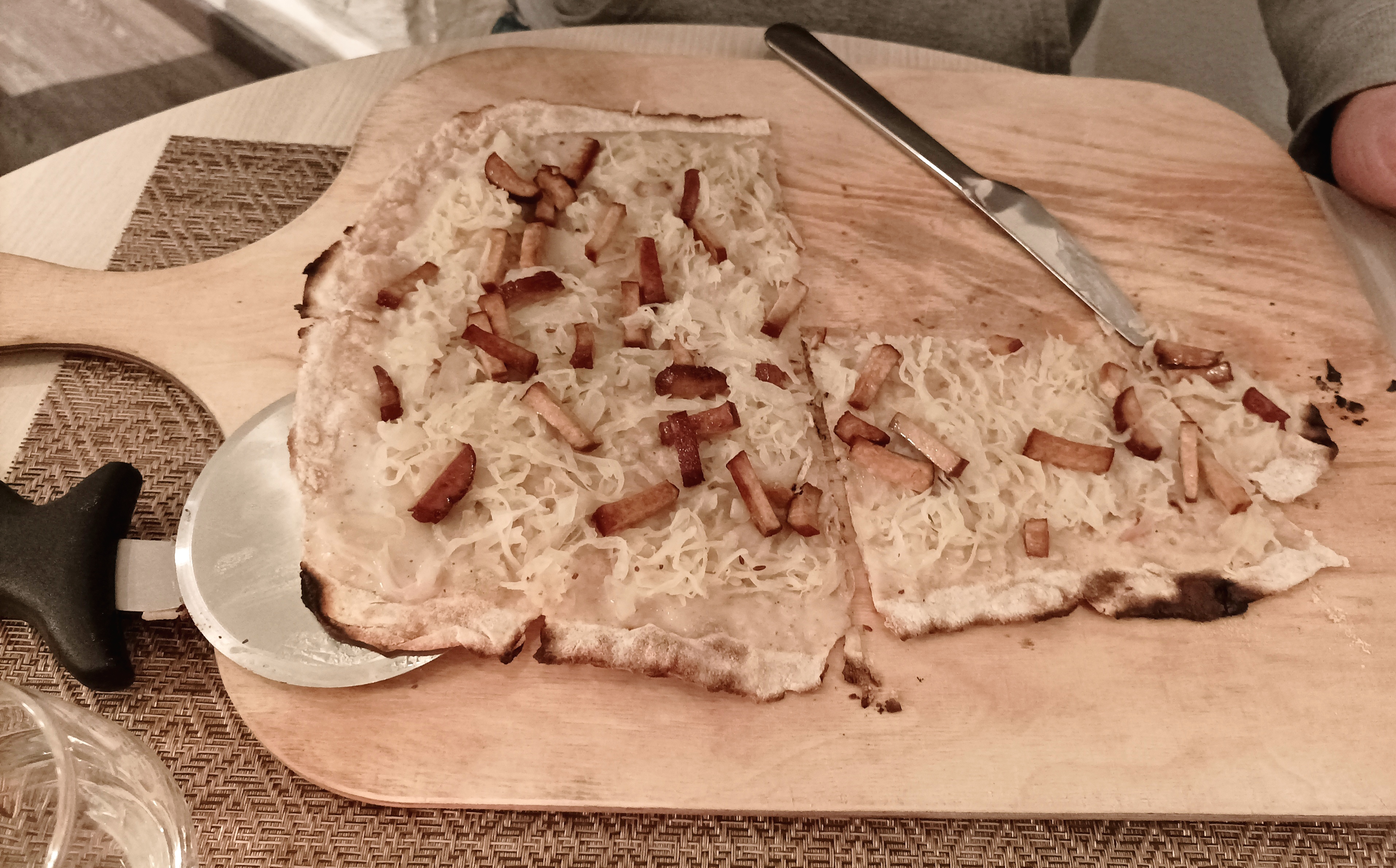 Tarte flambée sans crème ni lardons, ça s'appelle du pain grillé pas une tarte, très difficile de manger là dedans quand on est pas vegan